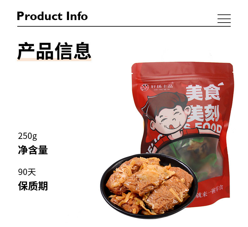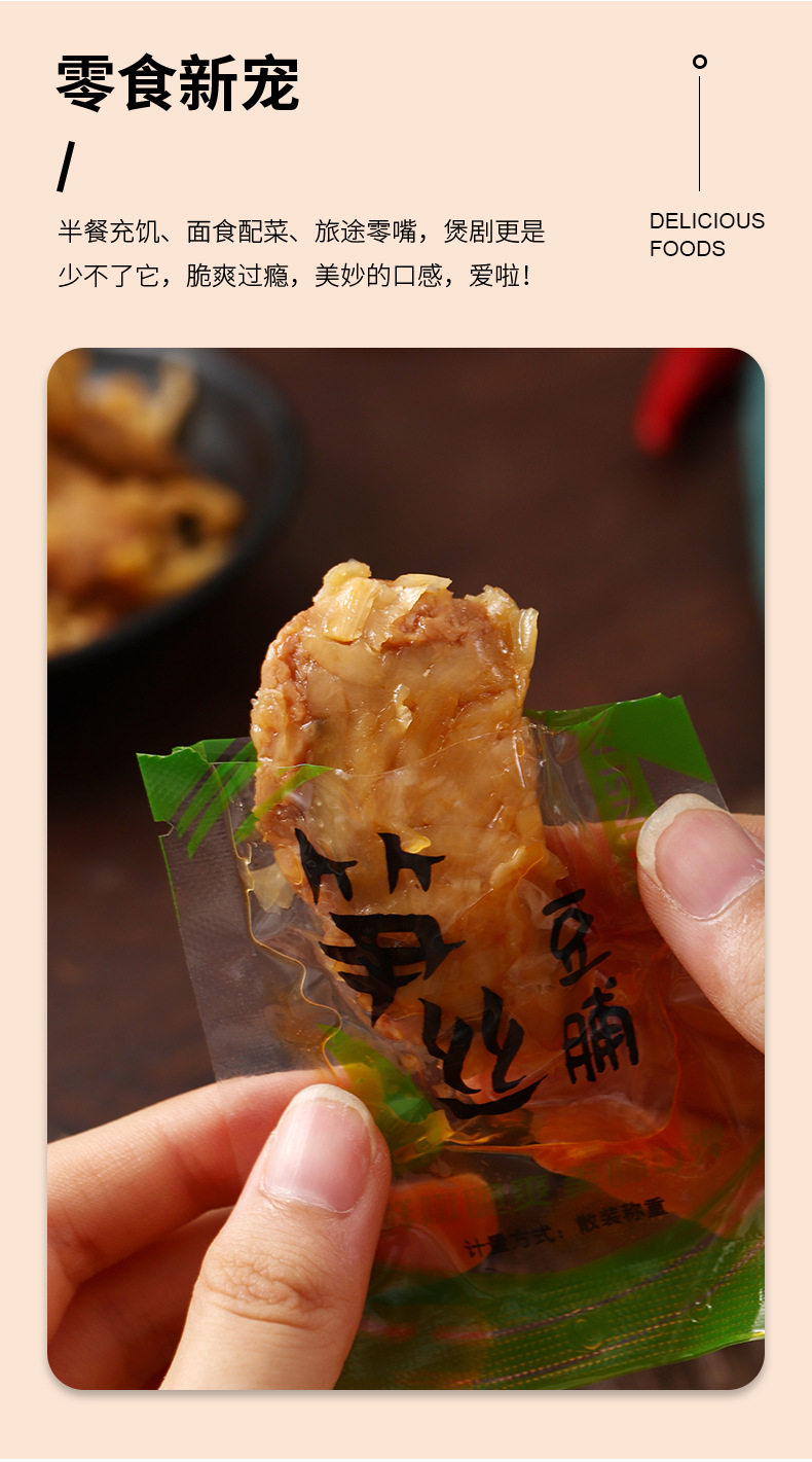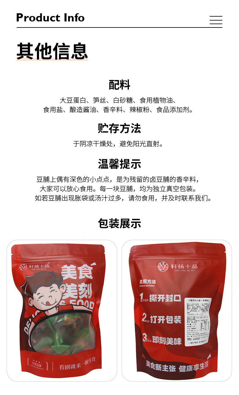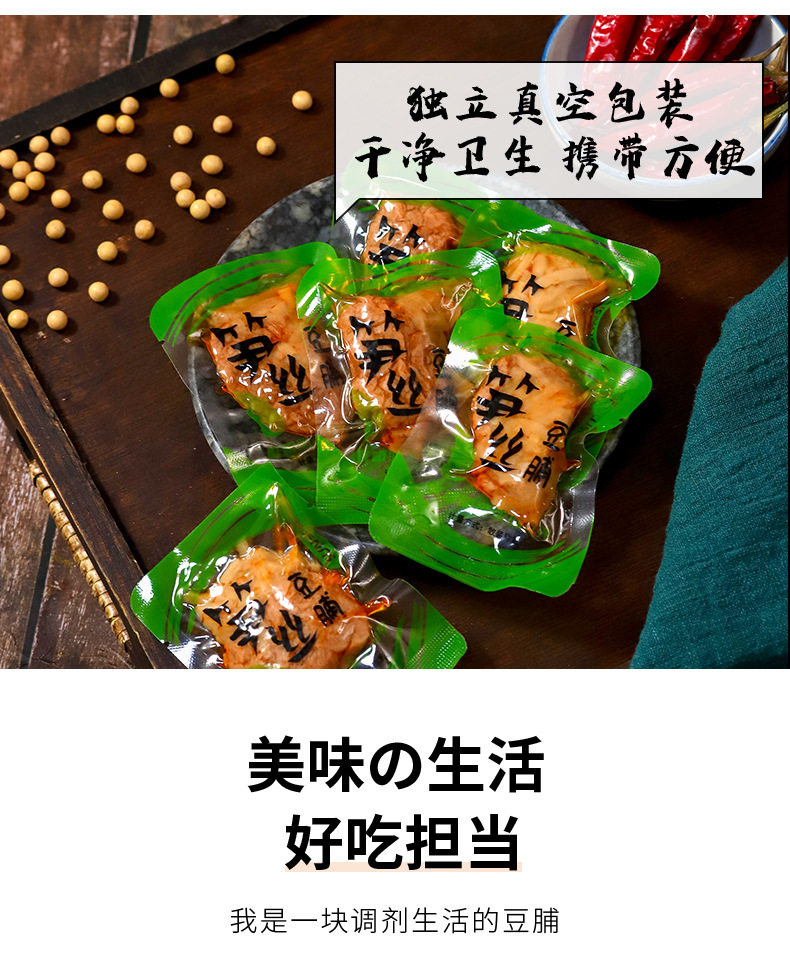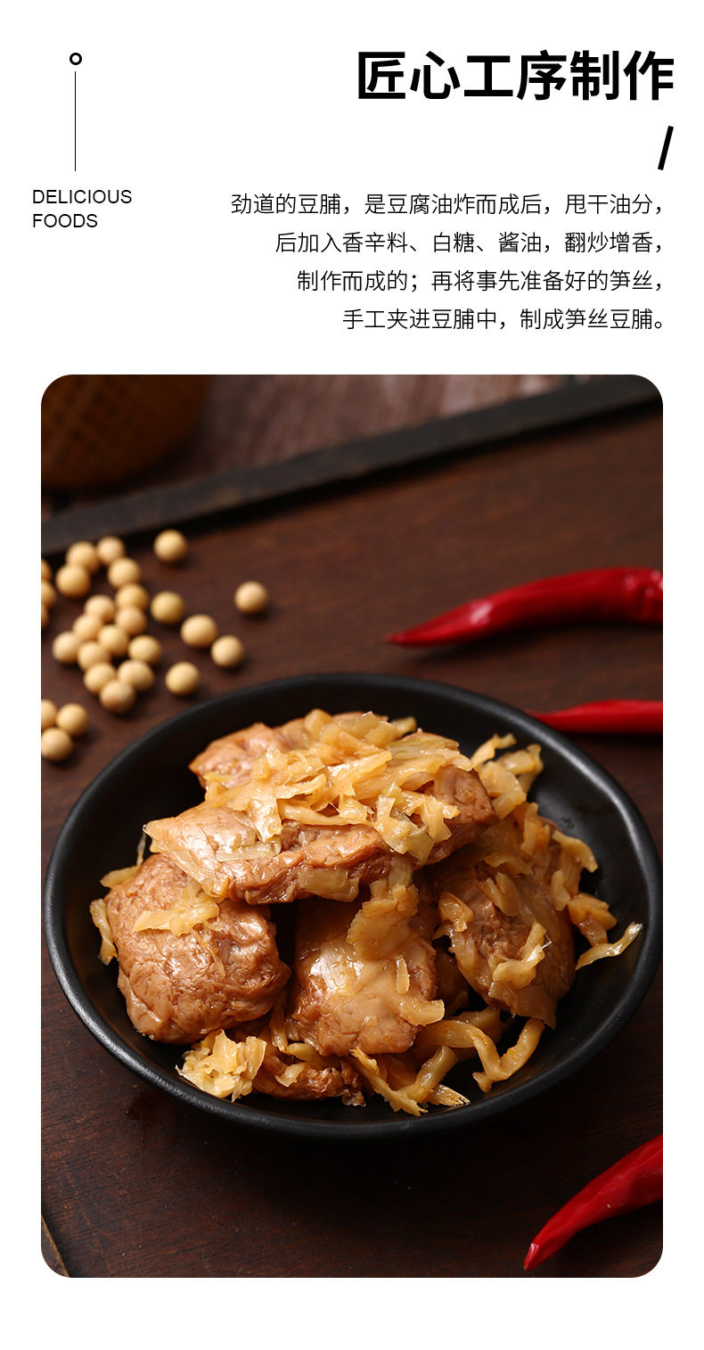 | Packaging specifications | Five-scented hand-shredded dried tofu with shredded bamboo shoots 250g,Spicy hand-shredded dried tofu with shredded bamboo shoots 250g |