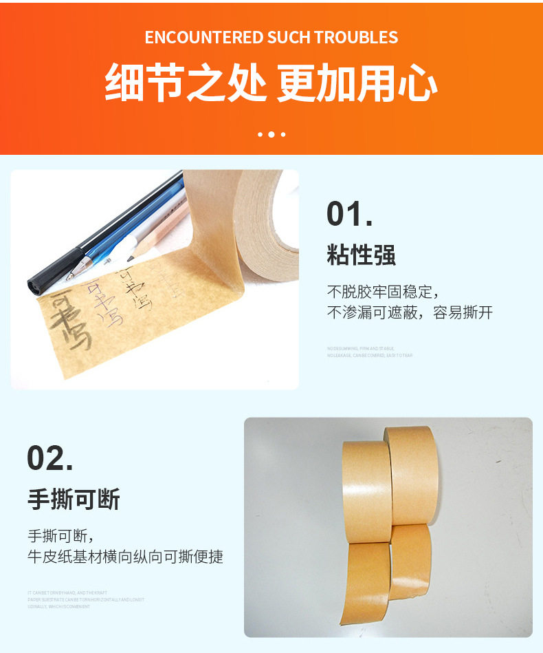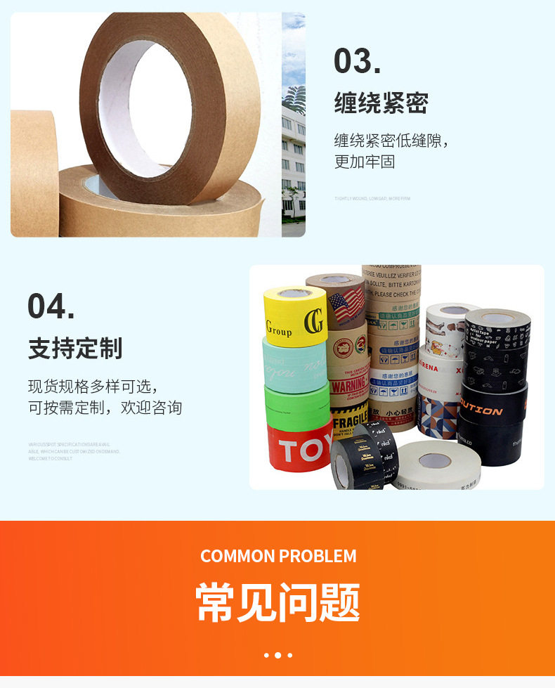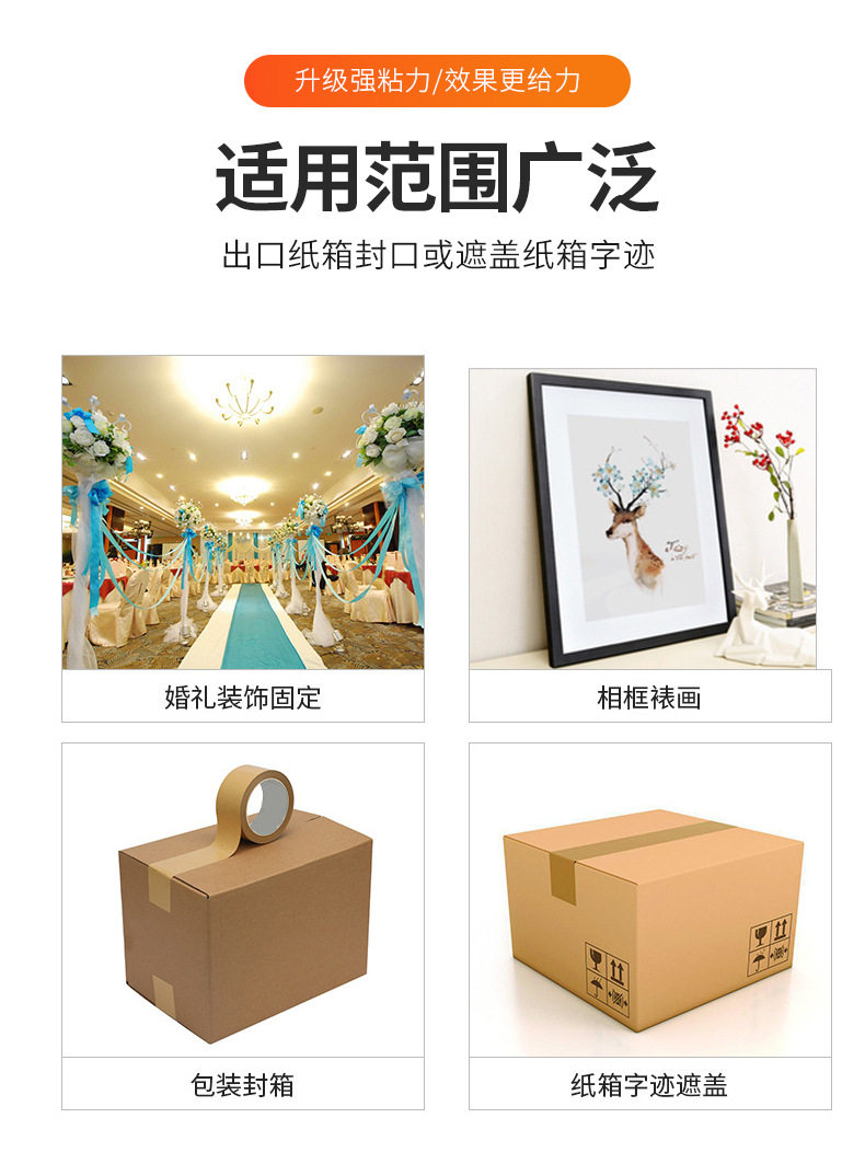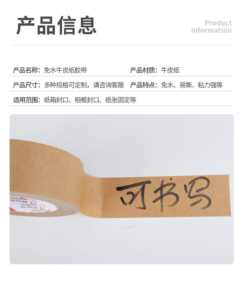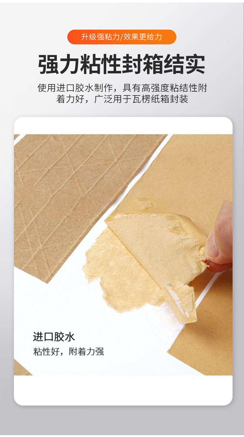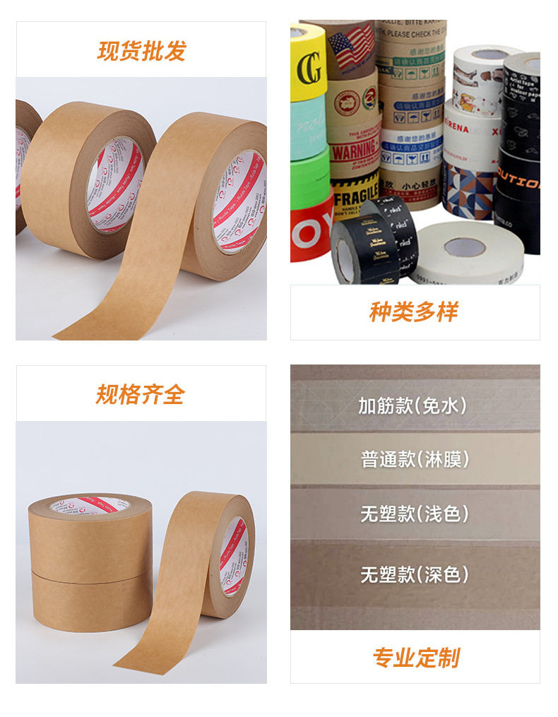 | Specifications and models | 48mm*50m; coated kraft paper (glossy),48mm*50m; coated kraft paper (adhesive),48mm*50m; plastic-free kraft paper (matte surface),48mm*50m; plastic-free kraft paper (adhesive),48mm*50m; water-free reinforced kraft paper (coated),48mm*50m; water-free reinforced kraft paper (no film),48mm*50m; wrinkled kraft paper (re-pastable),50mm*50m; coated kraft paper (glossy),50mm*50m; coated kraft paper (adhesive),50mm*50m; plastic-free kraft paper (matte surface),50mm*50m; plastic-free kraft paper (adhesive),50mm*50m; water-free reinforced kraft paper (coated),50mm*50m; water-free reinforced kraft paper (no film),50mm*50m; wet water reinforced kraft paper,50mm*50m; wrinkled kraft paper (re-pastable),55mm*50m; coated kraft paper (glossy),55mm*50m; coated kraft paper (adhesive),55mm*50m; plastic-free kraft paper (matte surface),55mm*50m; plastic-free kraft paper (adhesive),55mm*50m; water-free reinforced kraft paper (coated),55mm*50m; water-free reinforced kraft paper (no film),55mm*50m; wrinkled kraft paper (re-pastable),60mm*50m; coated kraft paper (glossy),60mm*50m; coated kraft paper (adhesive),60mm*50m; plastic-free kraft paper (matte surface),60mm*50m; plastic-free kraft paper (adhesive),60mm*50m; water-free reinforced kraft paper (coated),60mm*50m; water-free reinforced kraft paper (no film),60mm*50m; wet water reinforced kraft paper,60mm*50m; wrinkled kraft paper (re-pastable) |