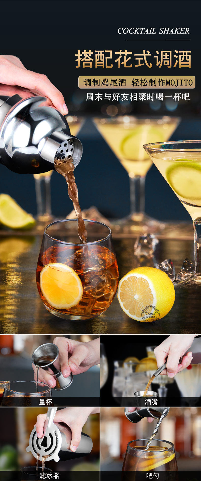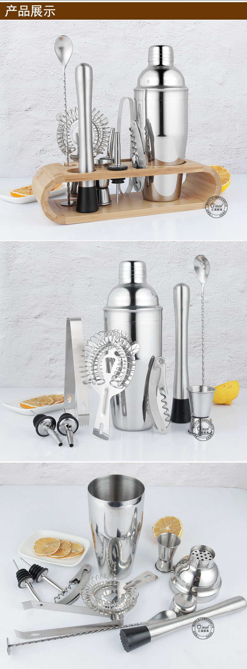 Stainless Steel Cocktail Shaker suit Bar Shaker Full Set of Tools with Oval Wooden Stand Base 750mL