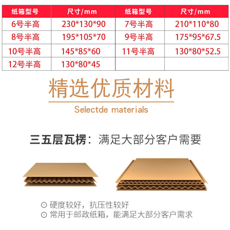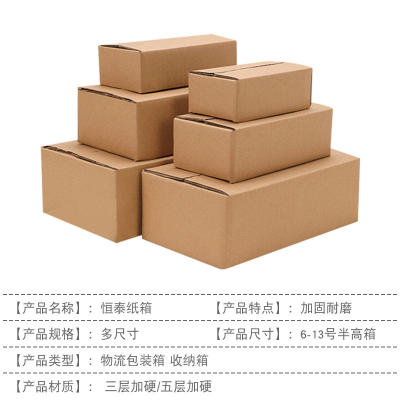 | Specifications and models | No. 6 half height (260*150*90)* three layer high quality carton,No.6 half height (260*150*90)* three-layer hard carton,No.6 half height (260*150*90)* three-layer extra hard carton,No. 6 half height (260*150*90)* three-layer super hard-C pit,No.6 half height (260*150*90)* five layers of hardening,No.6 half height (260*150*90)* five-layer extra hard,No.6 half height (260*150*90)* five-layer super hard-EB pit,No.7 half high (230*130*80mm)* three-layer high quality carton,No.7 semi-high (230*130*80mm)* three-layer hard carton,No.7 semi-high (230*130*80mm)* three-layer extra-hard carton,No.7 half height (230*130*80mm)* three-layer super hard-C pit,No.7 half height (230*130*80mm)* five layers of hardening,No.7 half height (230*130*80mm)* five layers of extra hard,No.7 semi-high (230*130*80mm)* five-layer super hard-EB pit,No.8 half high (210*110*70mm)* three-layer high quality carton,No.8 semi-high (210*110*70mm)* three-layer hard carton,No.8 semi-high (210*110*70mm)* three-layer extra-hard carton,No.8 half height (210*110*70mm)* three-layer super hard-C pit,No.8 half height (210*110*70mm)* five layers of hardening,No.8 half height (210*110*70mm)* five layers of extra hard,No.8 semi-high (210*110*70mm)* five-layer super hard-EB pit,No.9 half height (195*105*70mm)* three-layer high quality carton,No.9 semi-high (195*105*70mm)* three-layer hard carton,No.9 semi-high (195*105*70mm)* three-layer extra-hard carton,No.9 half height (195*105*70mm)* three-layer super hard-C pit,No.9 half height (195*105*70mm)* five layers of hardening,No.9 half height (195*105*70mm)* five-layer extra hard,No.9 half height (195*105*70mm)* five-layer super hard-EB pit,No.10 half high (175*95*115mm)* three-layer high quality carton,No.10 half height (175*95*115mm)* three-layer hard carton,No.10 semi-high (175*95*115mm)* three-layer extra-hard carton,No.10 half height (175*95*115mm)* three-layer super hard-C pit,No.10 half height (175*95*115mm)* five layers of hardening,No.10 half high (175*95*115mm)* five layers of extra hard,No.10 half height (175*95*115mm)* five-layer super hard-EB pit,No.11 half high (145*85*55mm)* three-layer high quality carton,No.11 semi-high (145*85*55mm)* three-layer hard carton,No.11 semi-high (145*85*55mm)* three-layer extra-hard carton,No.11 half height (145*85*55mm)* three-layer super hard-C pit,No.11 half height (145*85*55mm)* five layers of hardening,No.11 half height (145*85*55mm)* five layers of extra hard,No.11 semi-high (145*85*55mm)* five-layer super hard-EB pit,No.12 semi-high (130 x80x45mm)* three-layer high quality carton,No.12 semi-high (130 x80x45mm)* three-layer hard carton,No.12 semi-high (130 x80x45mm)* three-layer extra-hard carton,No.12 half height (130 x80x45mm)* three-layer super hard-C pit,No.12 semi-high (130 x80x45mm)* five layers of hardening,No.12 semi-high (130 x80x45mm)* five-storey extra hard,No.12 semi-high (130 x80x45mm)* five-layer super hard-EB pit |