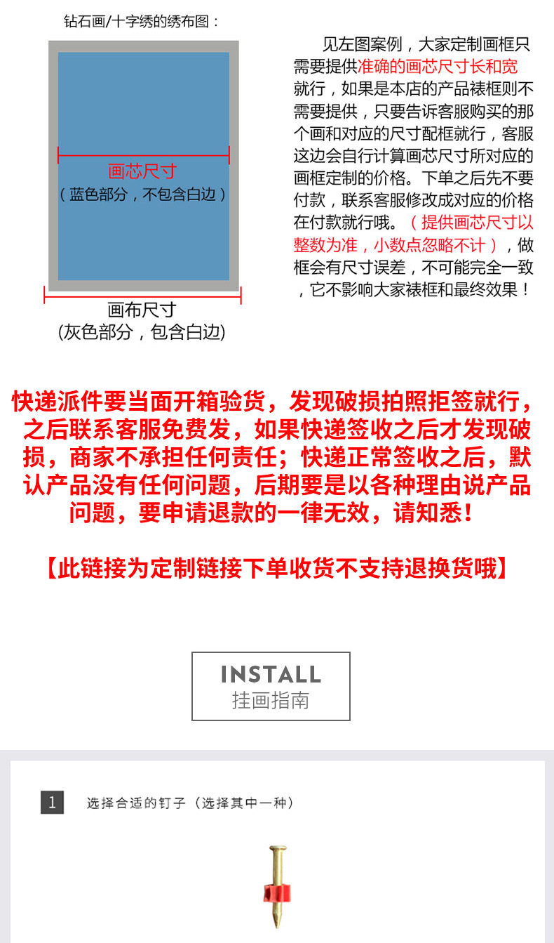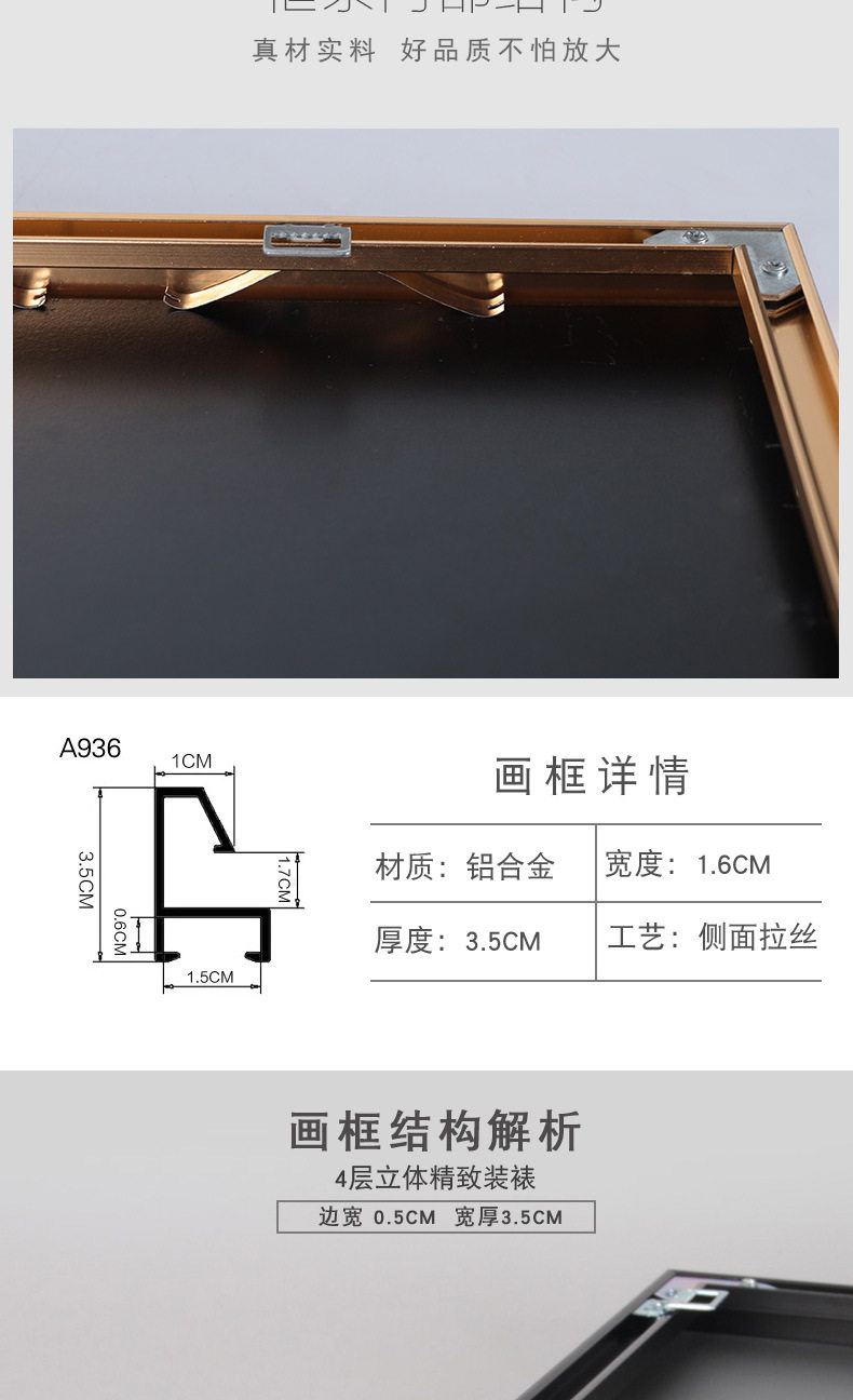 | Inner frame size | [Gold aluminum alloy frame customization] According to the size, contact customer service to change the price in the payment,[Black aluminum alloy frame customization] According to the size, contact customer service to change the price in the payment,[Silver aluminum alloy frame customization] According to the size, contact customer service to change the price in the payment,Customized picture frames cannot be refunded without quality problems. Please confirm the size before shooting. |