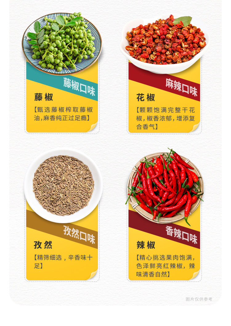 Chafing hot pot dipping sauce rattan pepper flavor original flavor spicy spicy hot skewed incense marinated hot pot ingredients, etc.