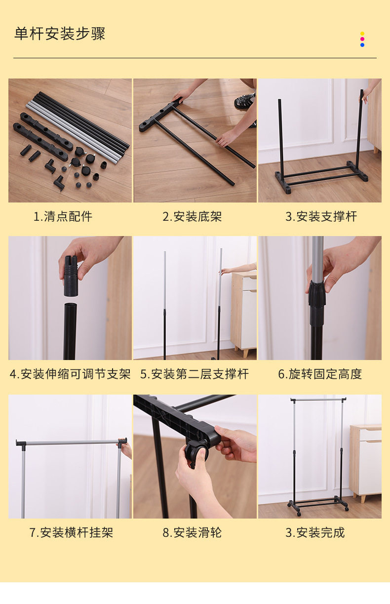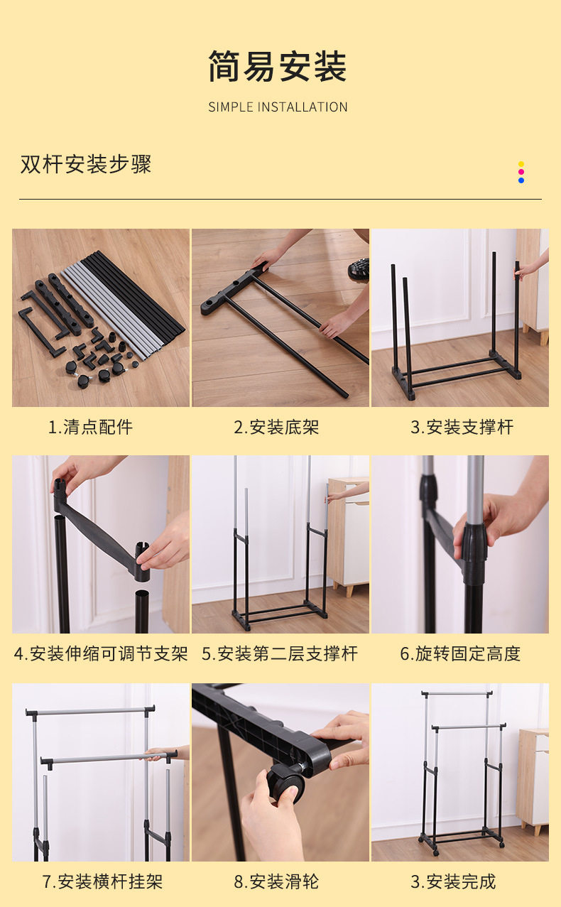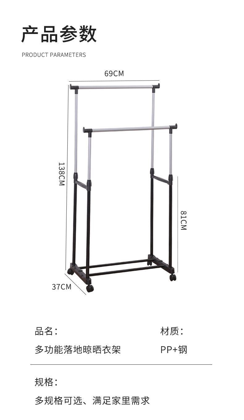 Floor drying rack factory direct retractable lifting mobile clothes drying rod reinforced double rod with pulley hanging rack