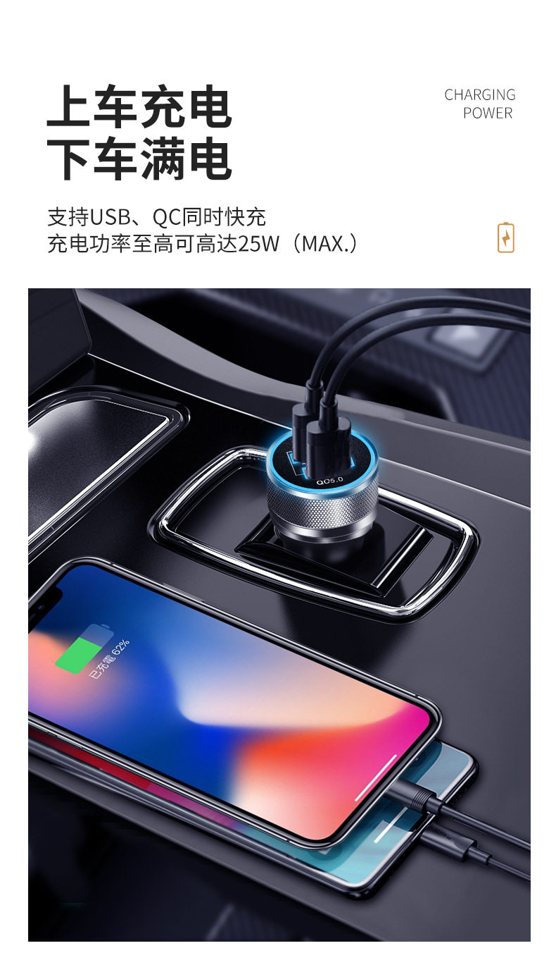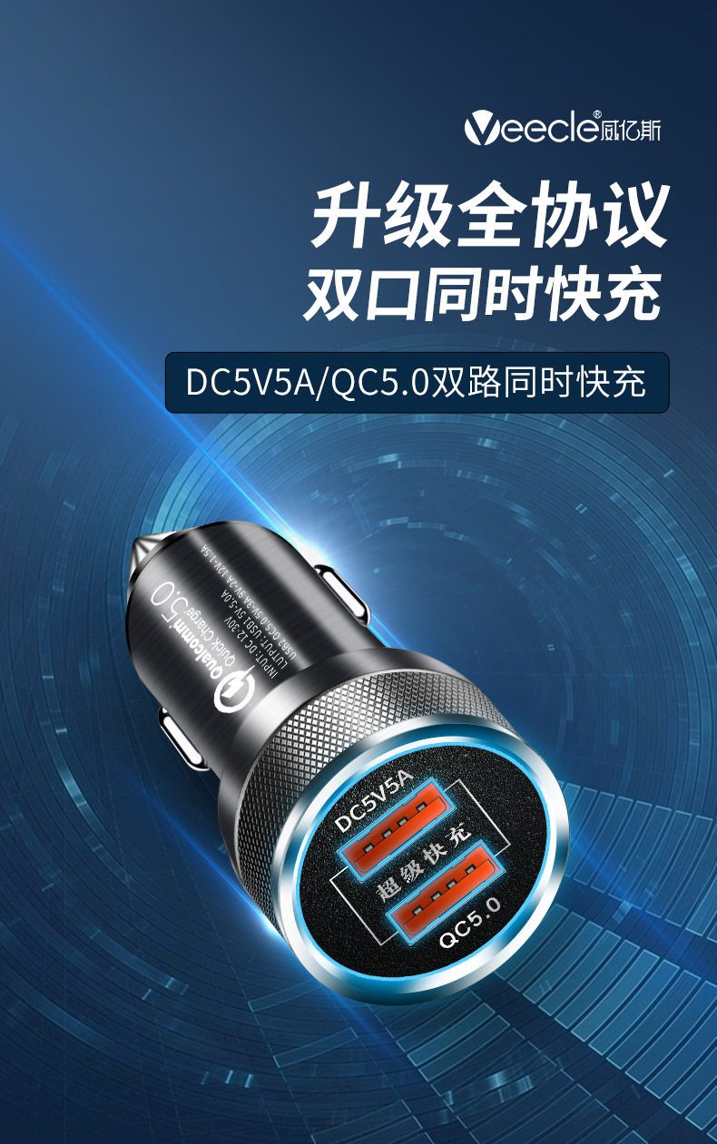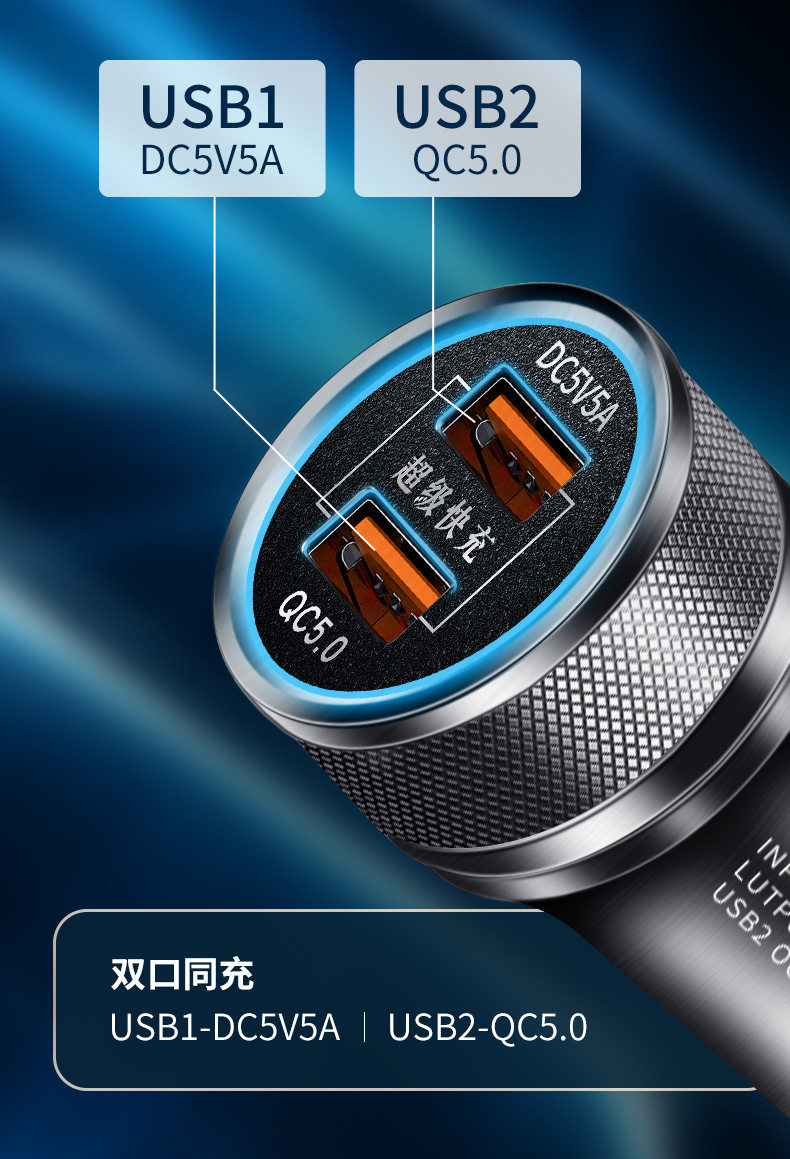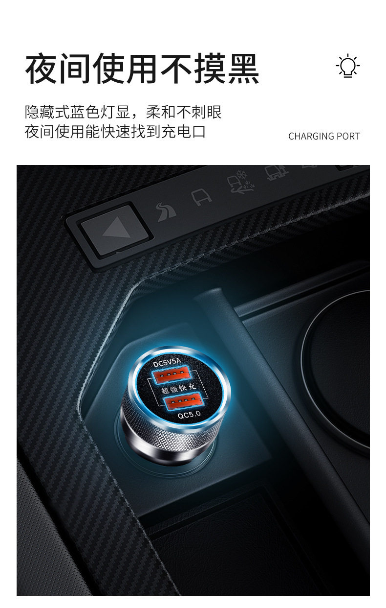 New Fast-Charging Car Mobile Phone Charger 9V-2A Dual-Port USB Aluminum Alloy Smart Qc Car Charger Head Can Be Customized