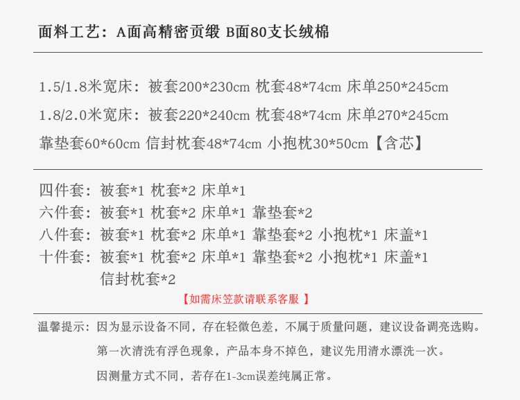 | Pattern | Beautiful beauty four-piece bed sheet set,Beautiful beauty four-piece bed cover set,Beautiful beauty six-piece bed sheet set,Beautiful beauty six-piece bed cover set,Beautiful beauty practical eight-piece set,Glorious beauty luxurious ten-piece set |