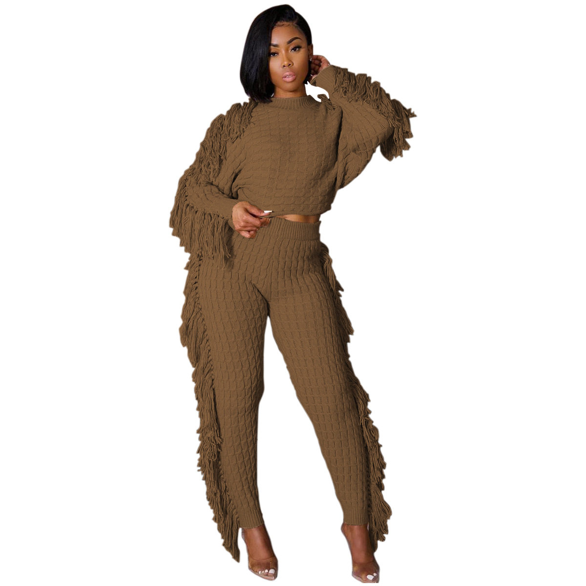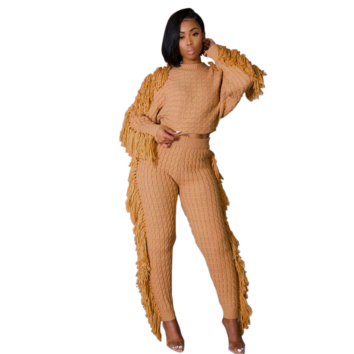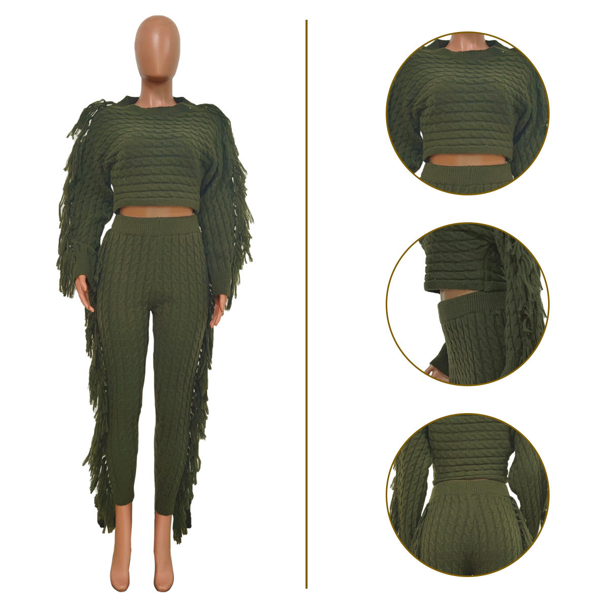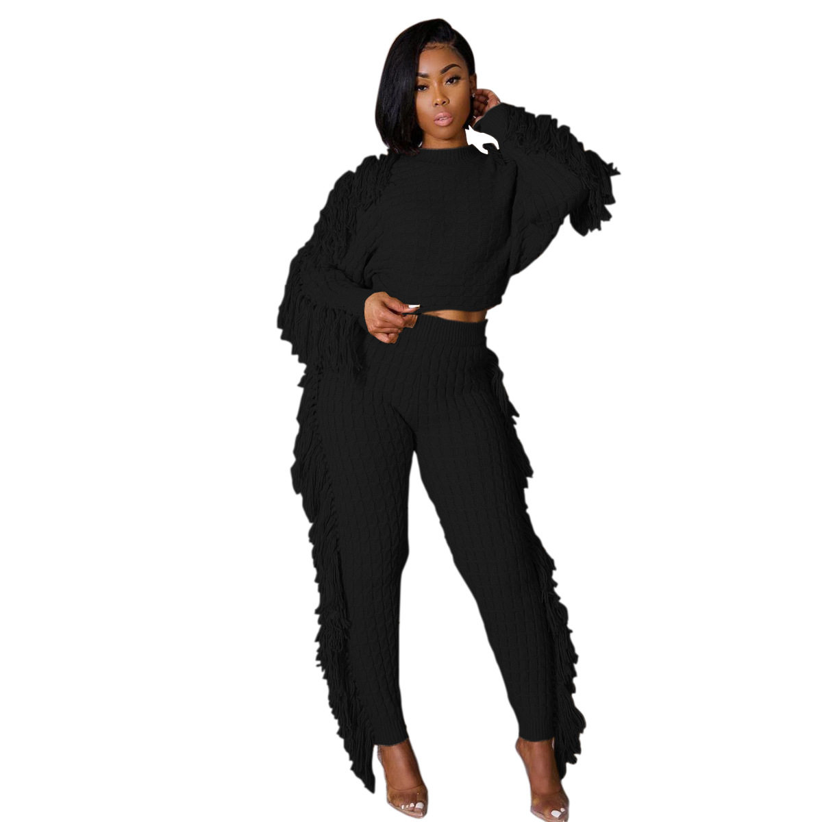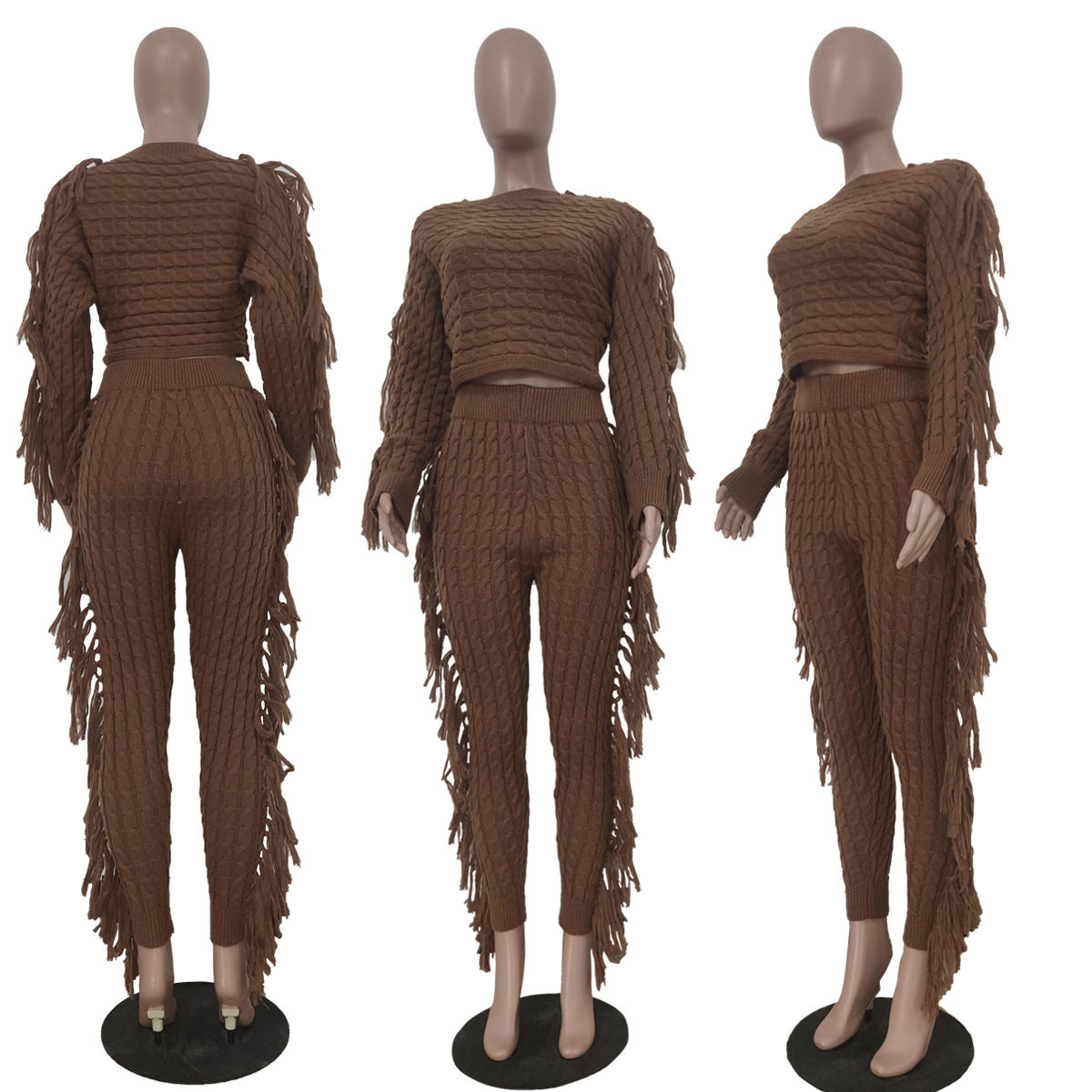 Ts1186 Cross-Border Supply New European and American Clothing Casual Pure Color Knitted Long-Sleeved Tassel Suit