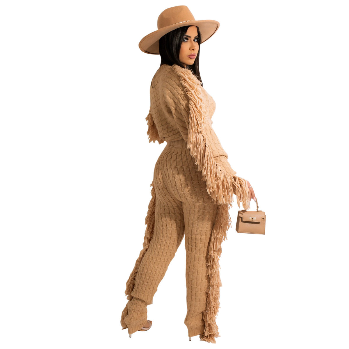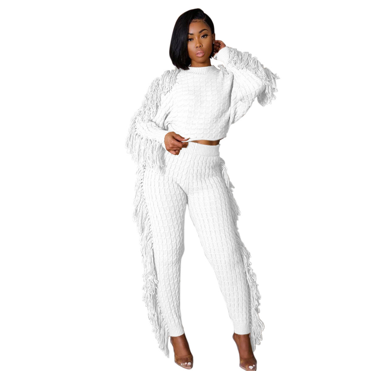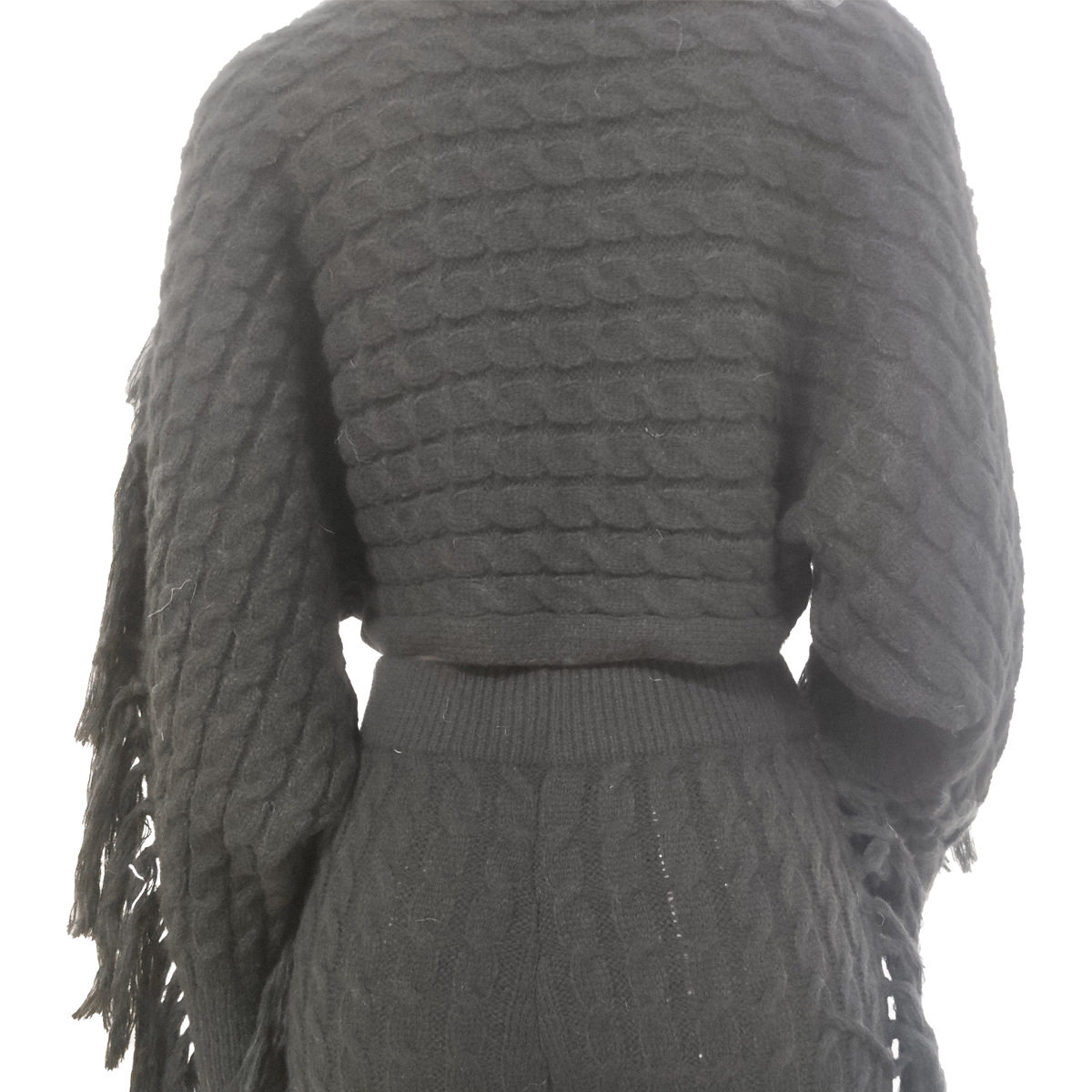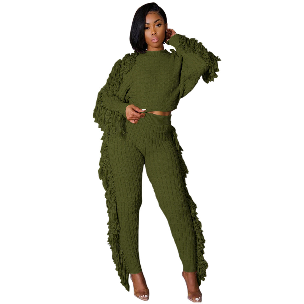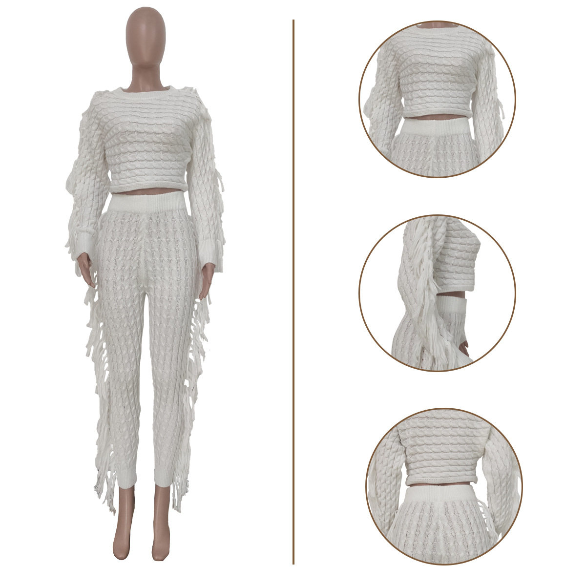 Ts1186 Cross-Border Supply New European and American Clothing Casual Pure Color Knitted Long-Sleeved Tassel Suit