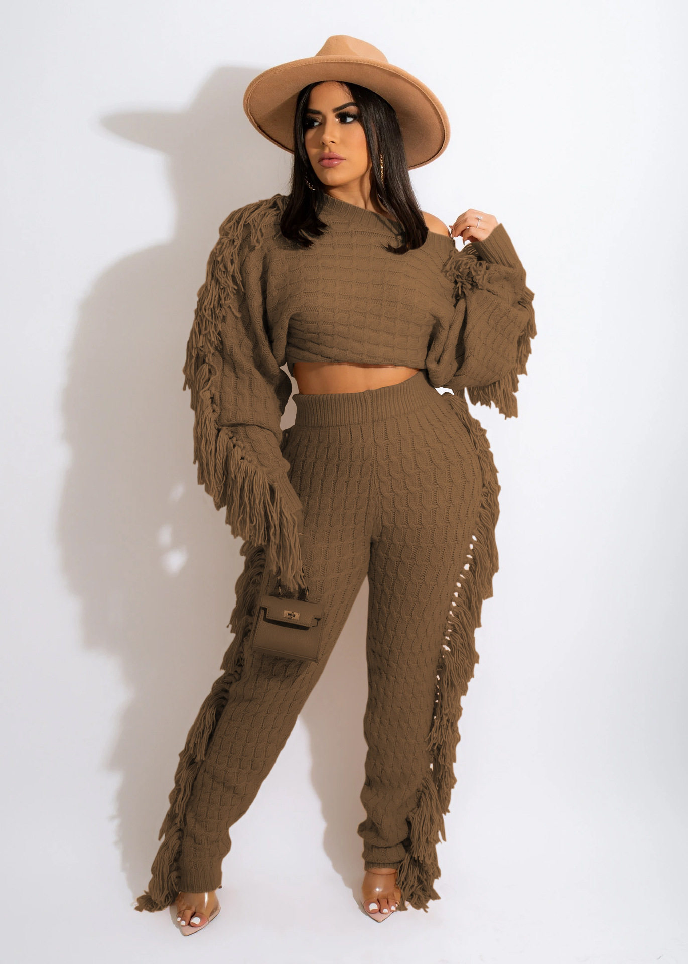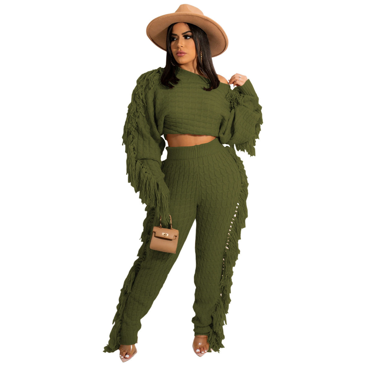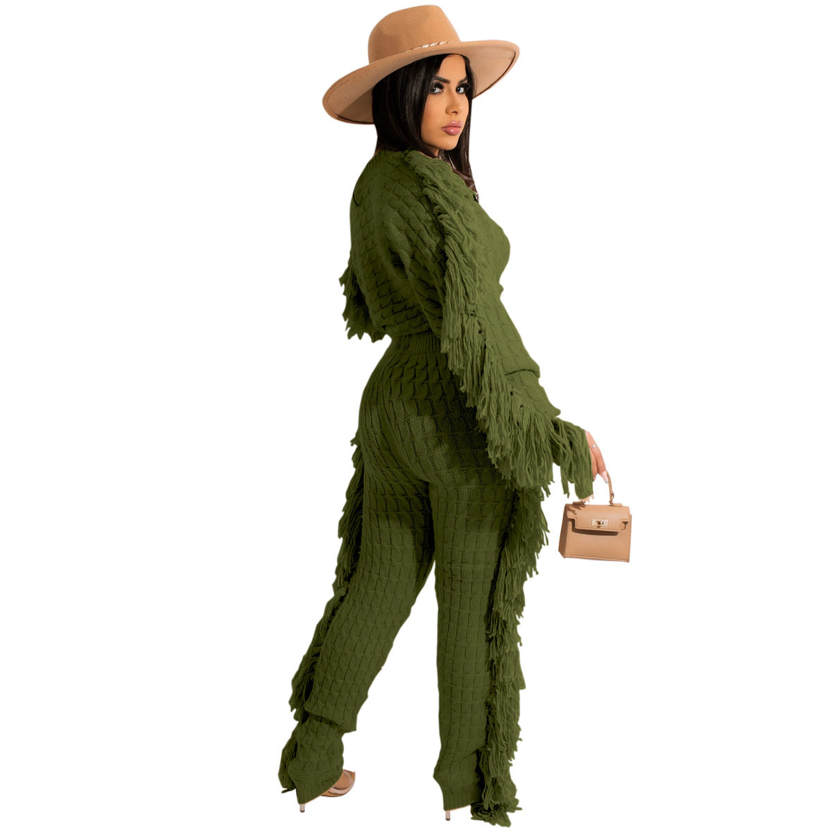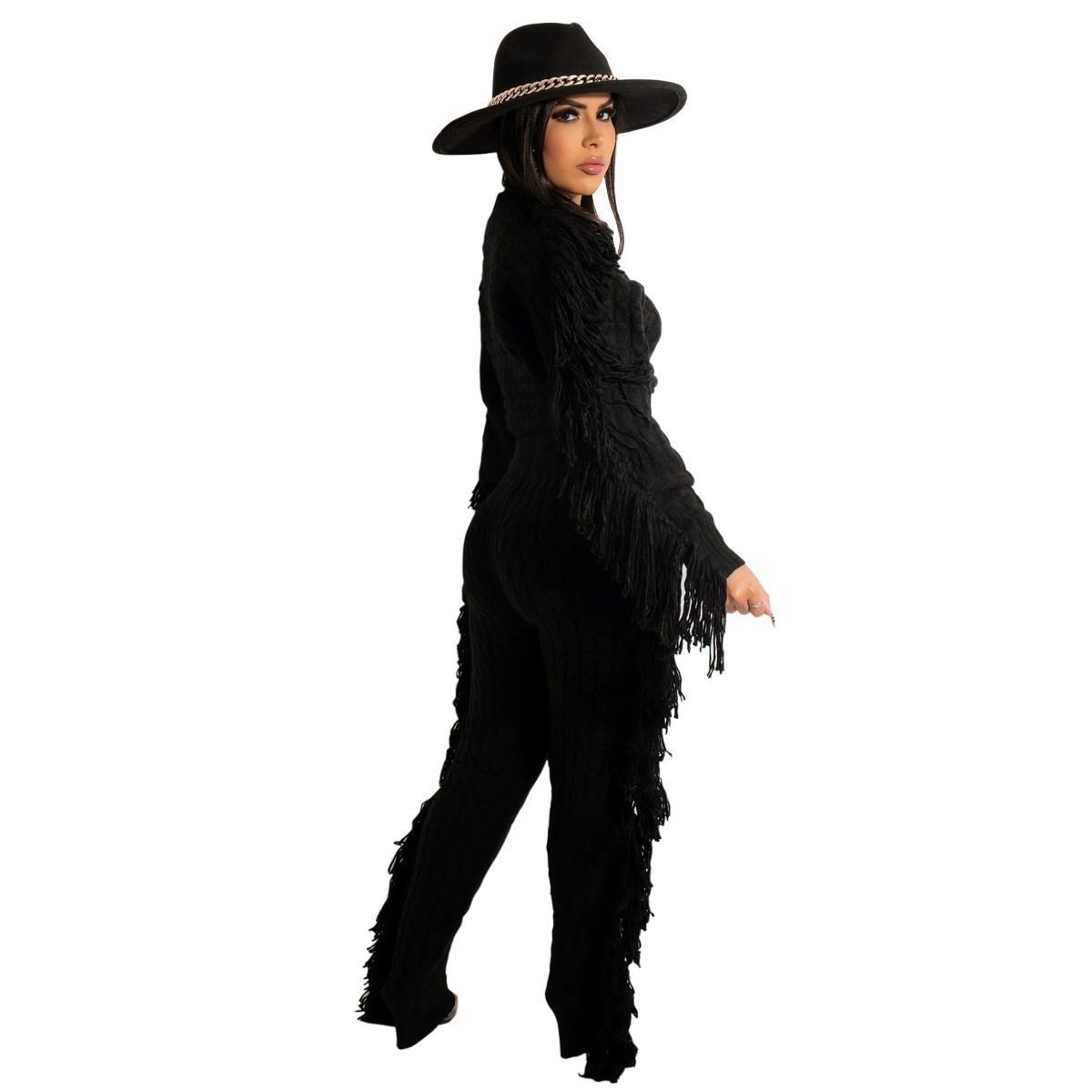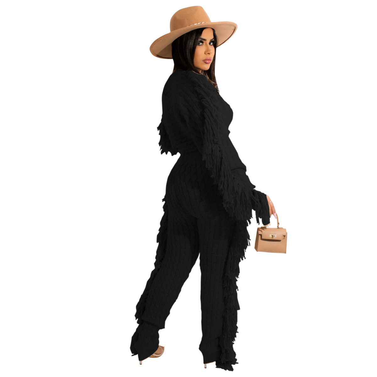 Ts1186 Cross-Border Supply New European and American Clothing Casual Pure Color Knitted Long-Sleeved Tassel Suit