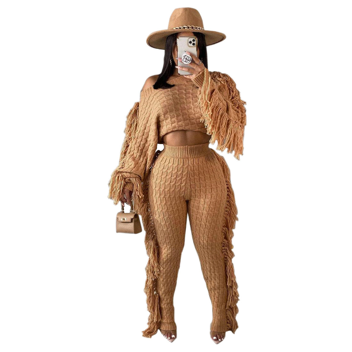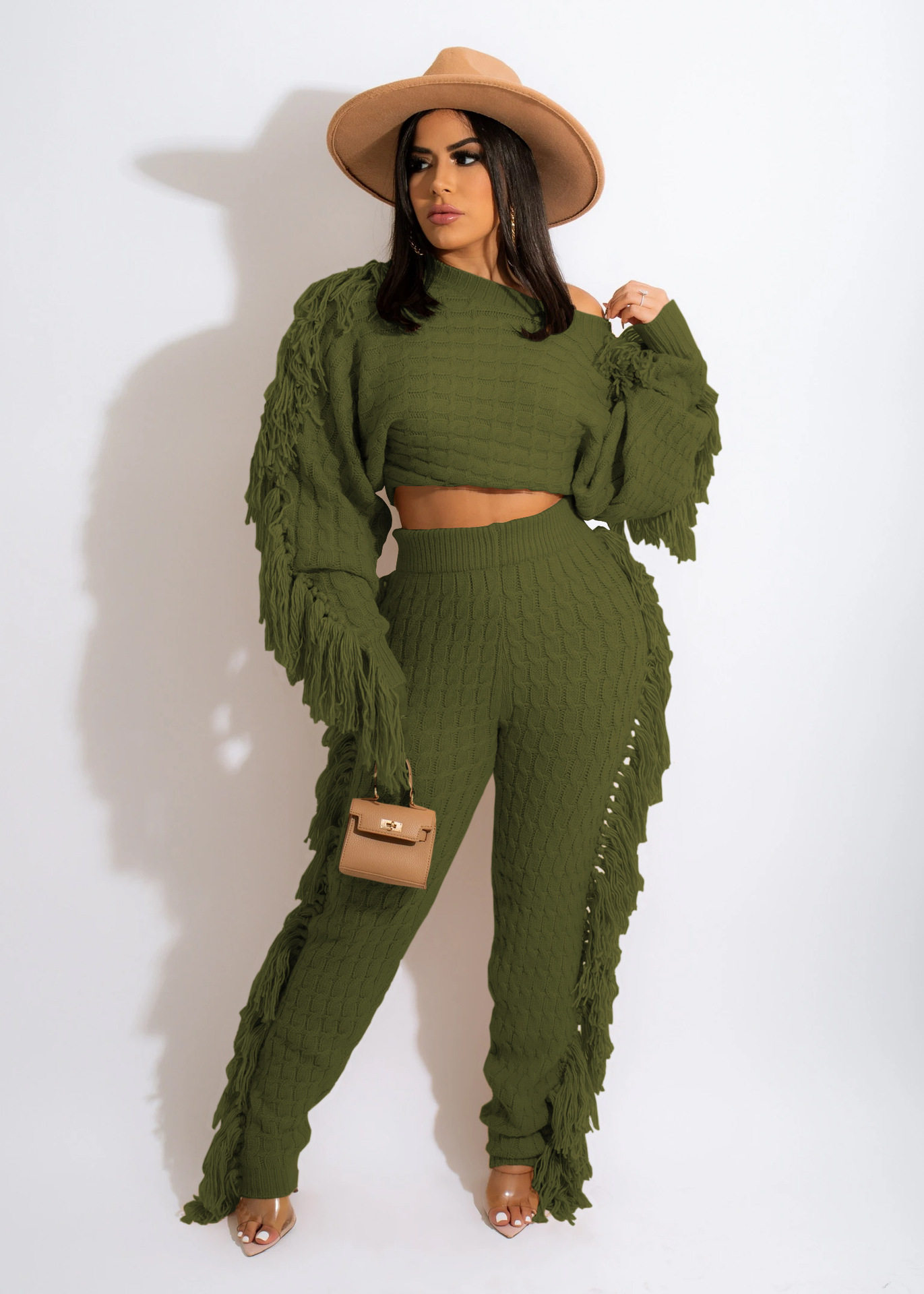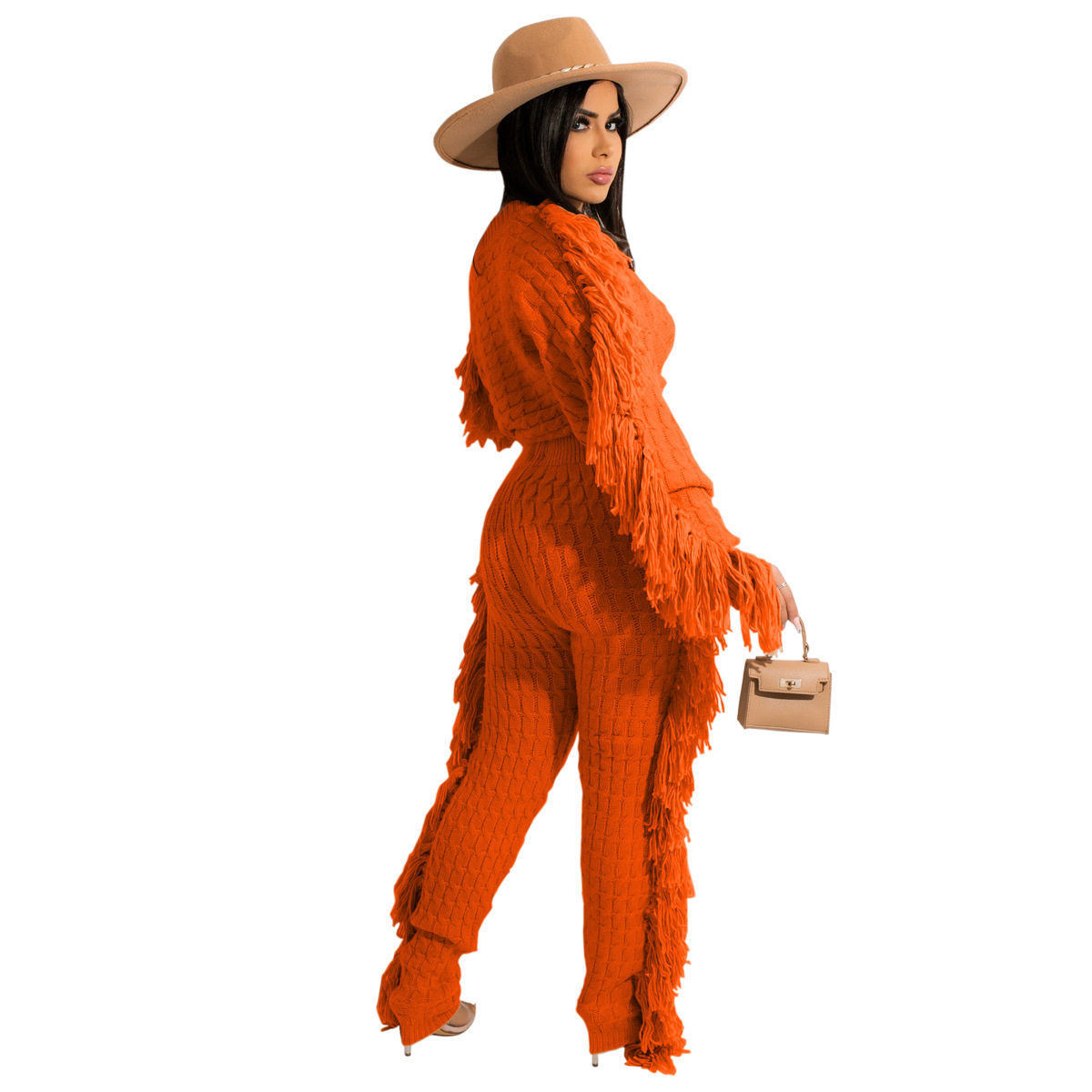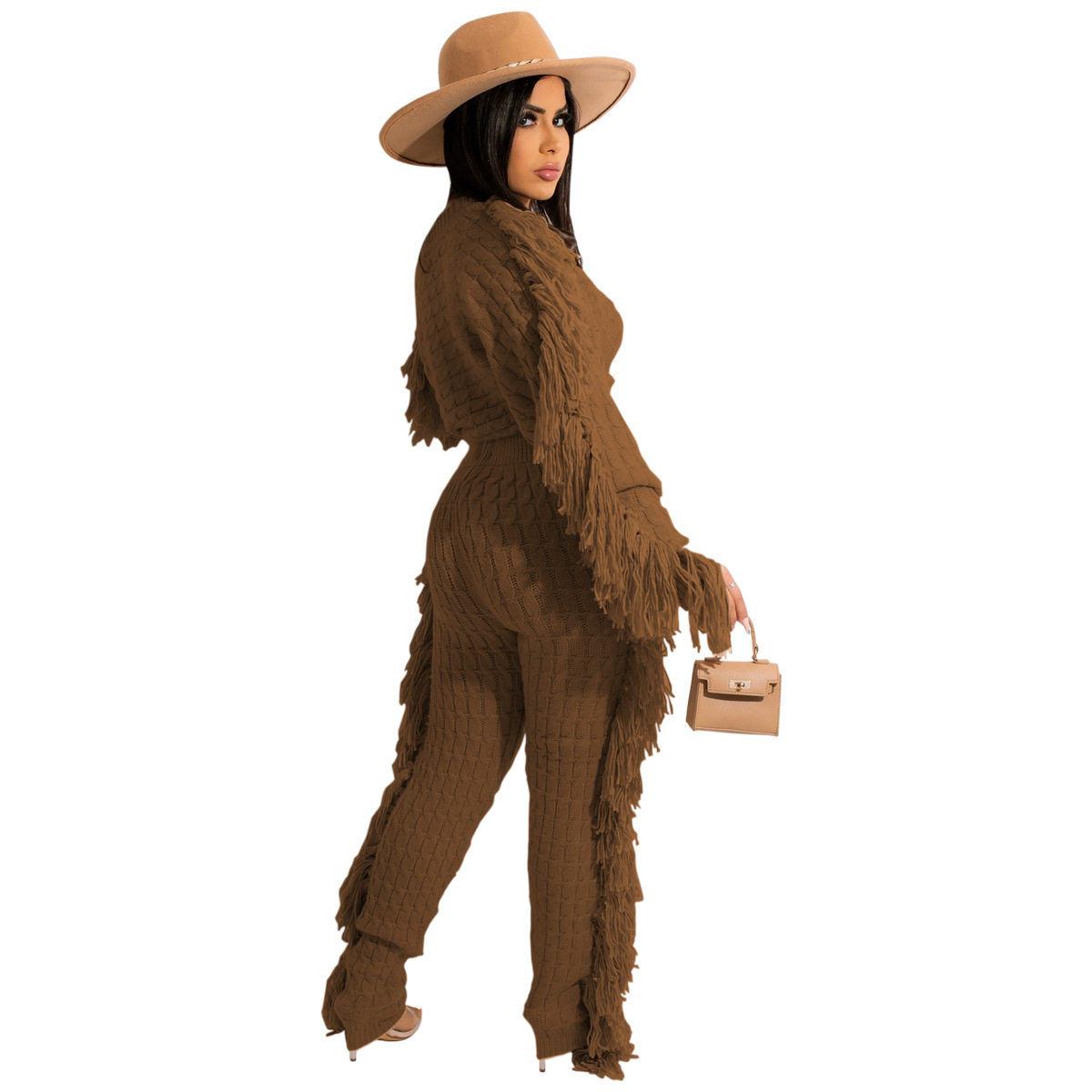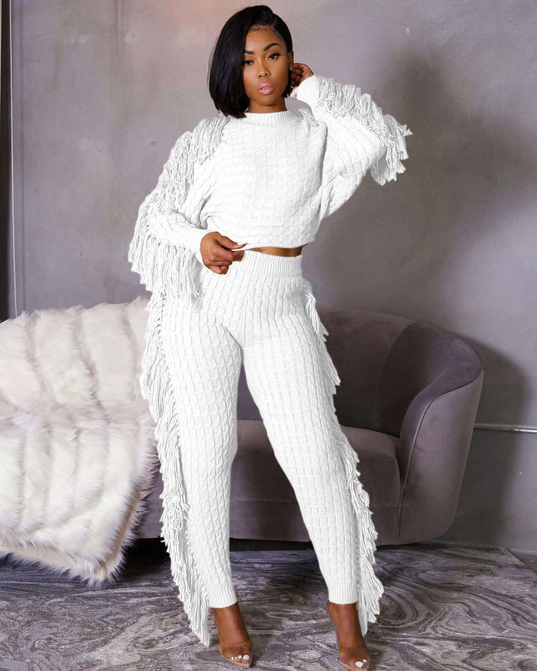 Ts1186 Cross-Border Supply New European and American Clothing Casual Pure Color Knitted Long-Sleeved Tassel Suit