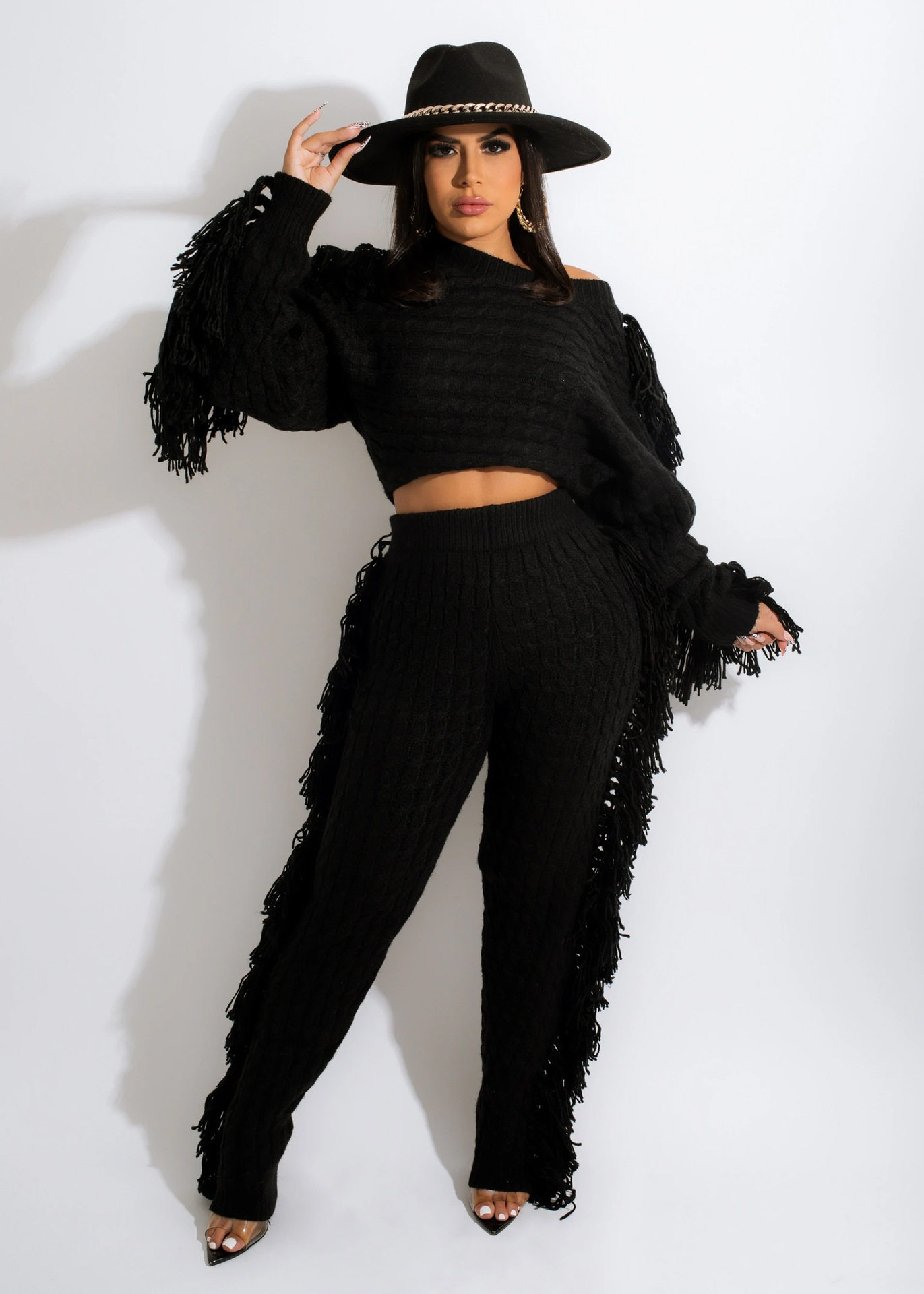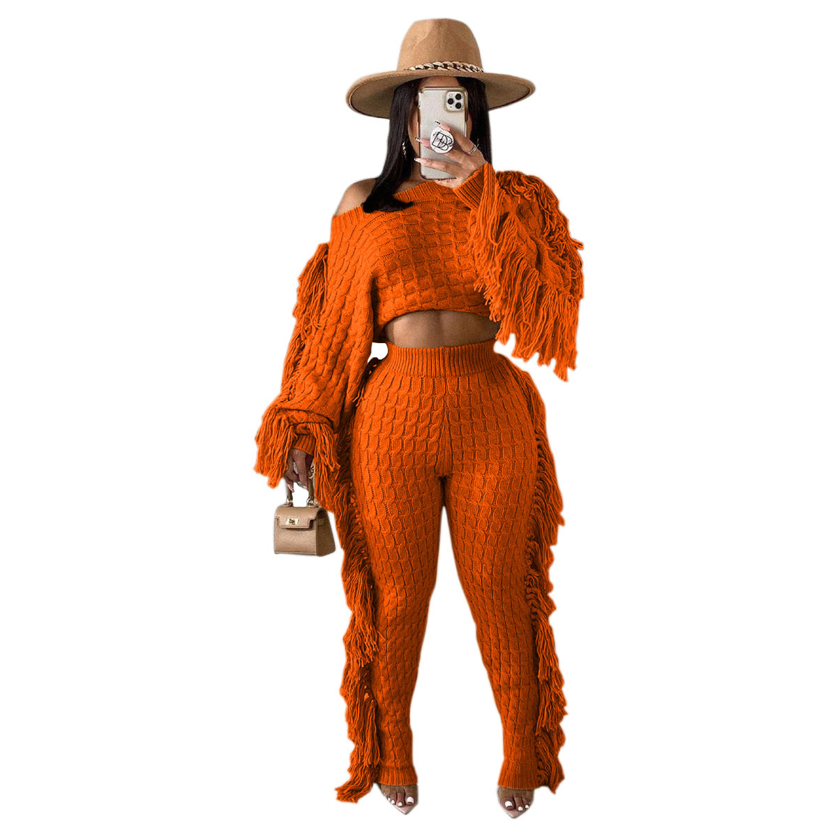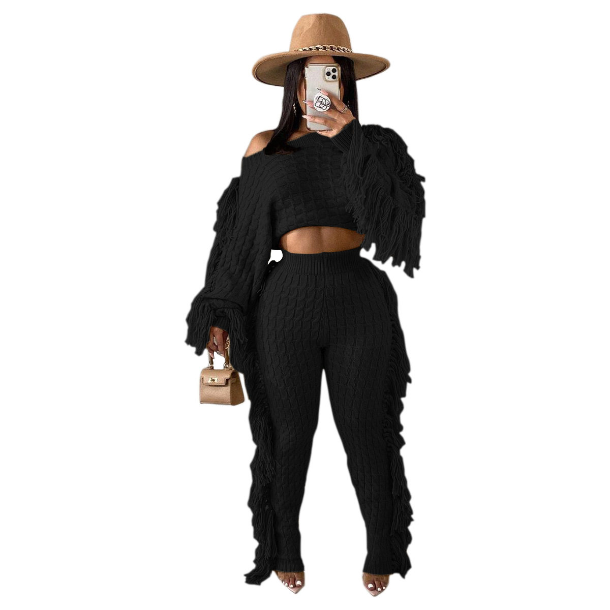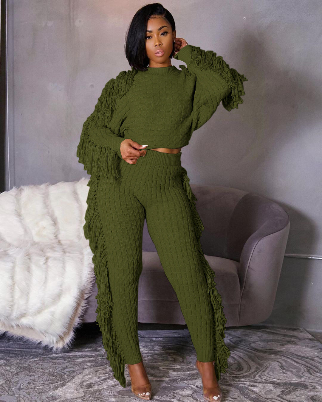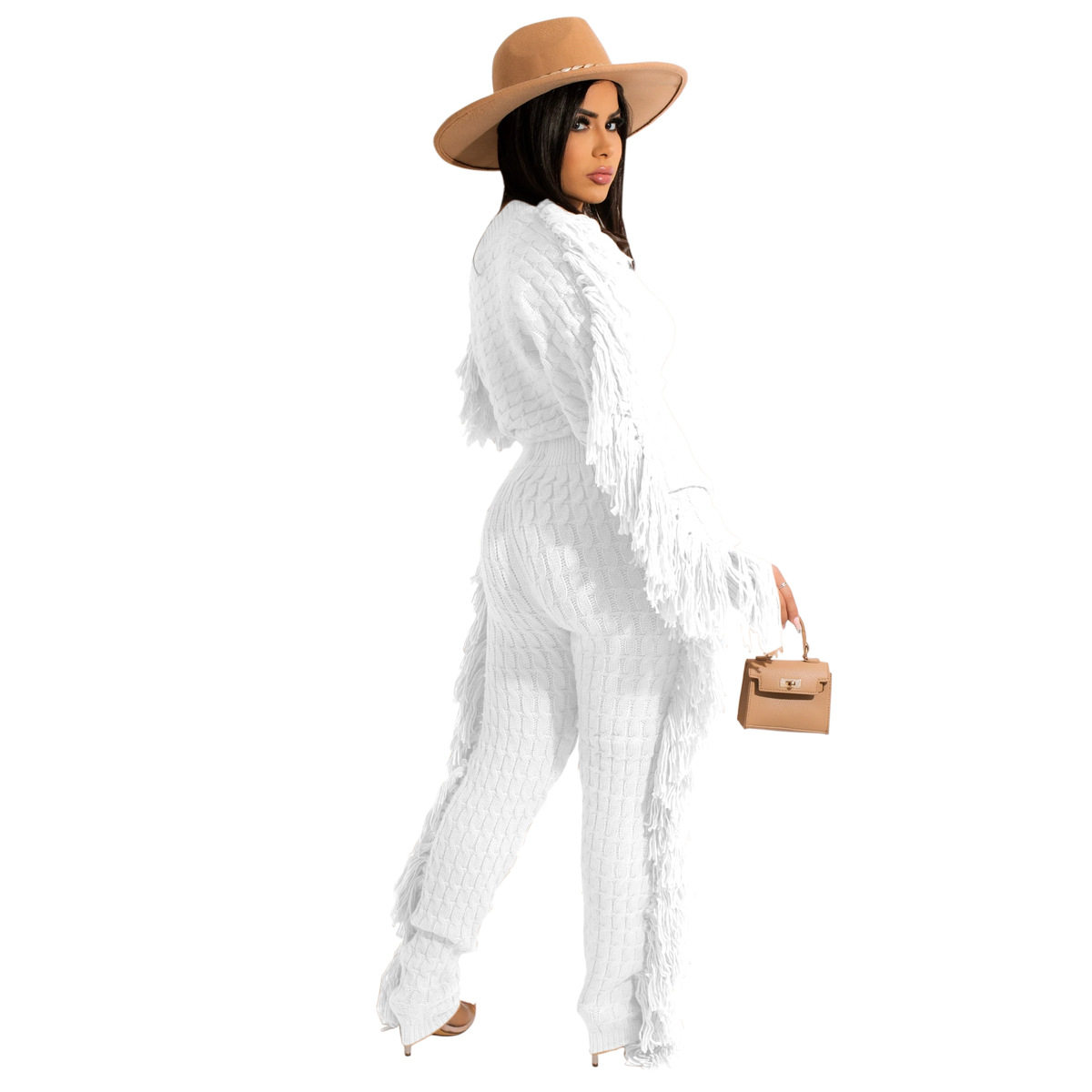 Ts1186 Cross-Border Supply New European and American Clothing Casual Pure Color Knitted Long-Sleeved Tassel Suit
