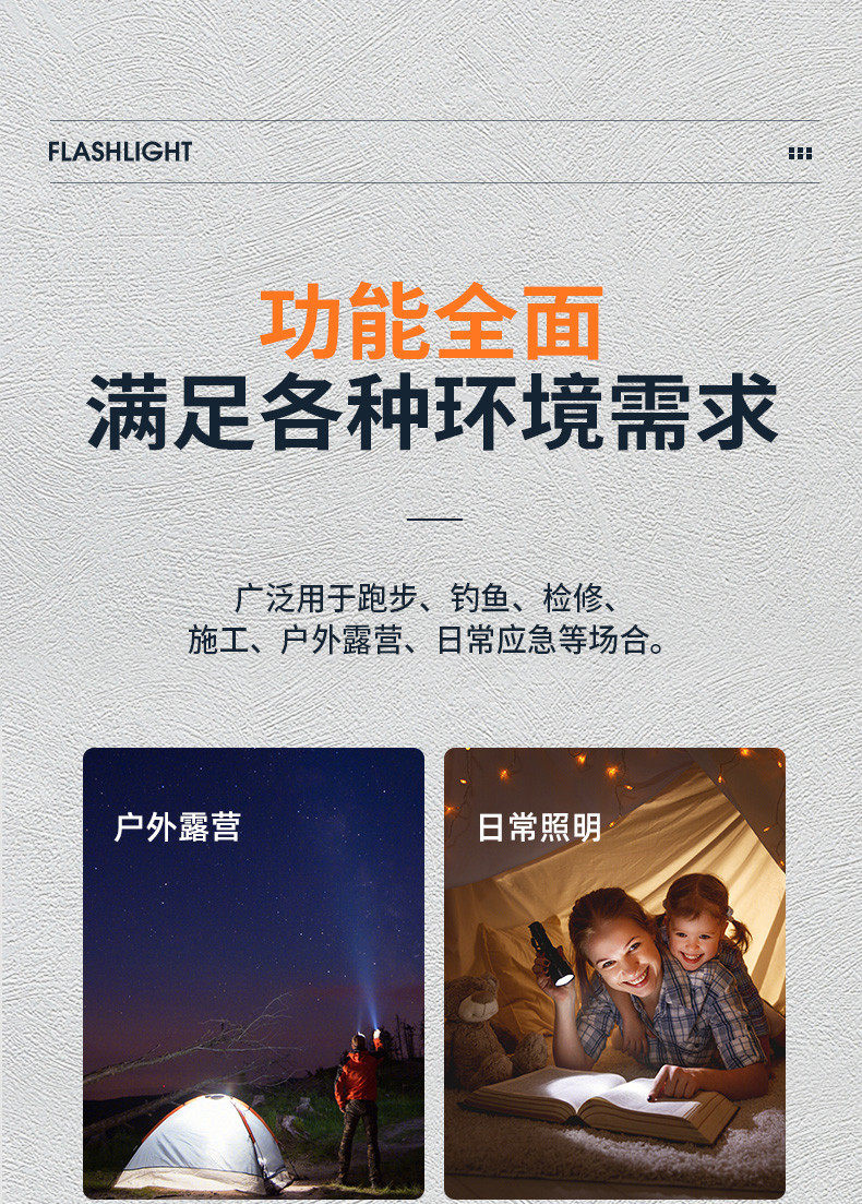 | Applicable environment | Hiking,Camping,Teaching,Search,Daily carrying,Night riding,Cave Exploration,Night fishing,Patrol |