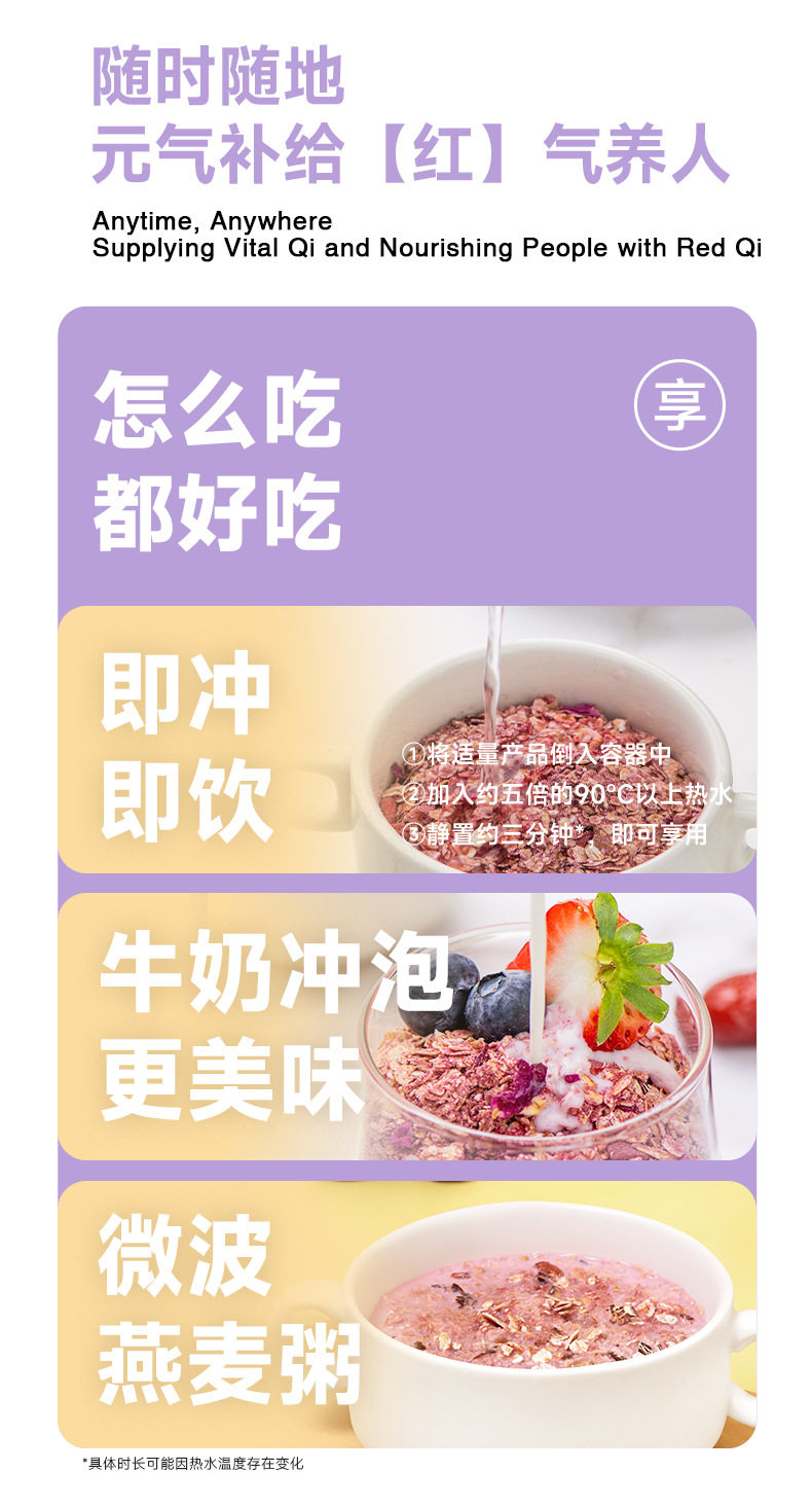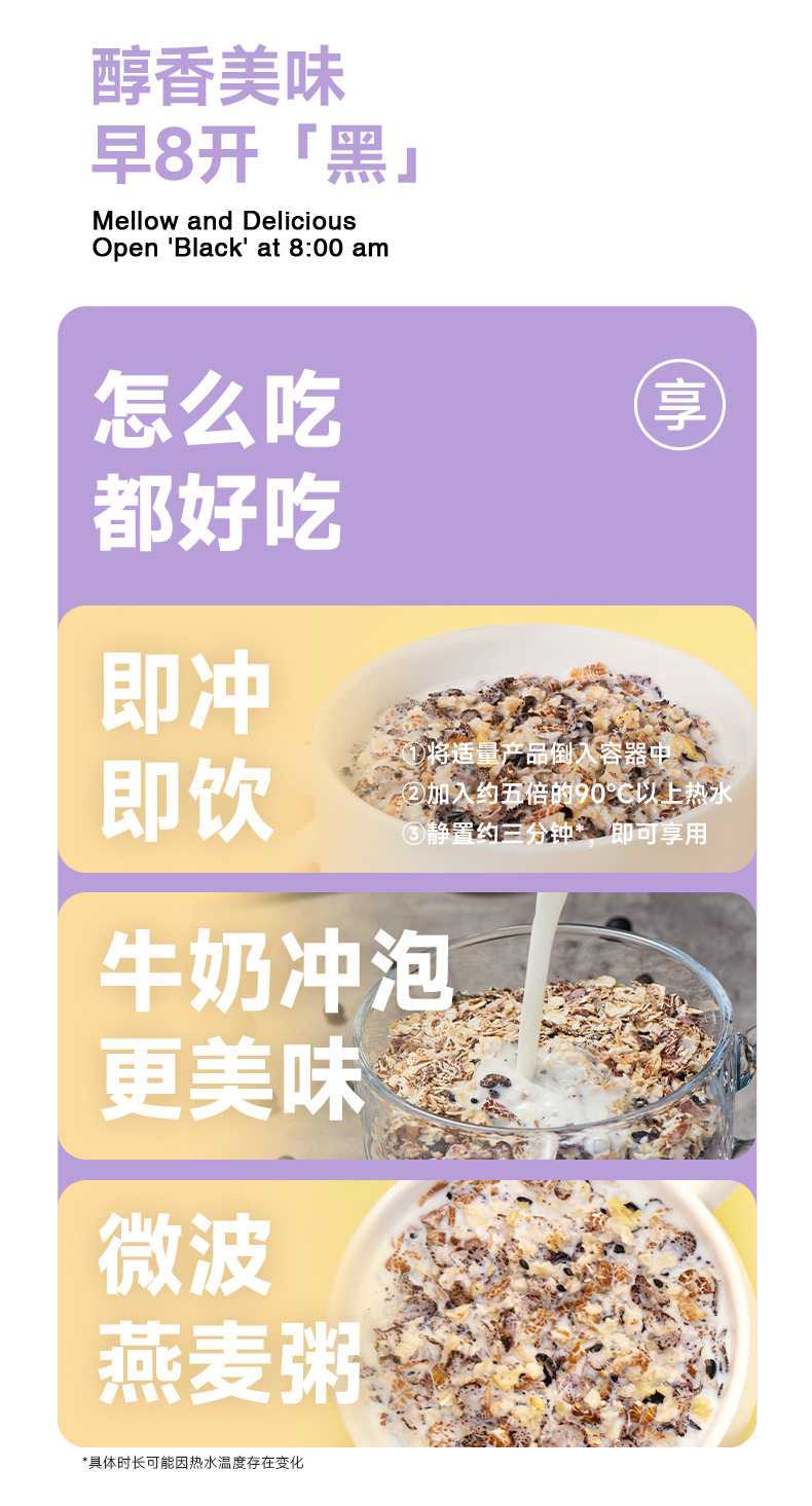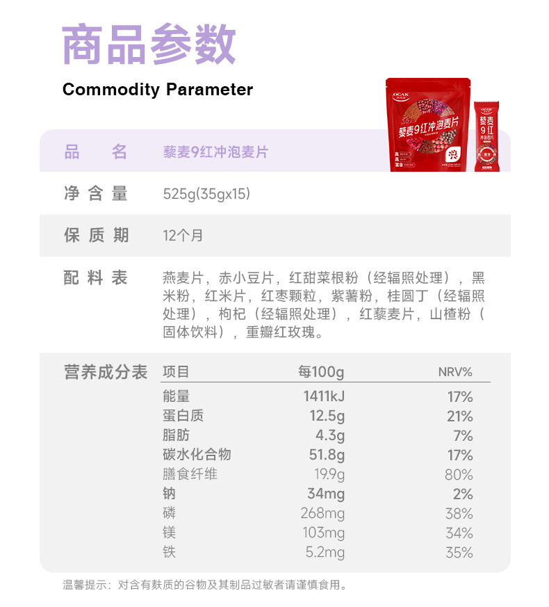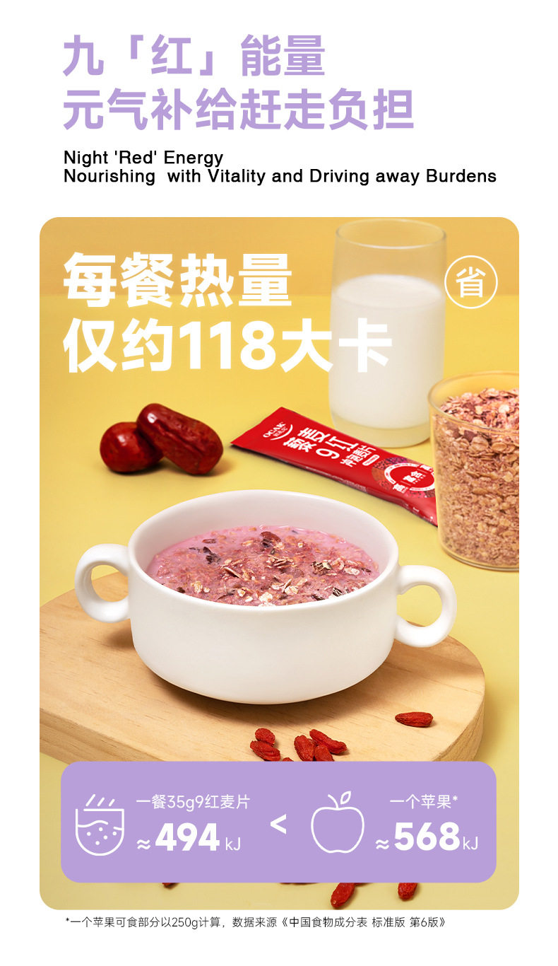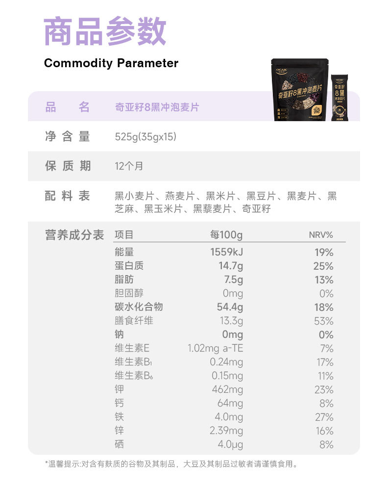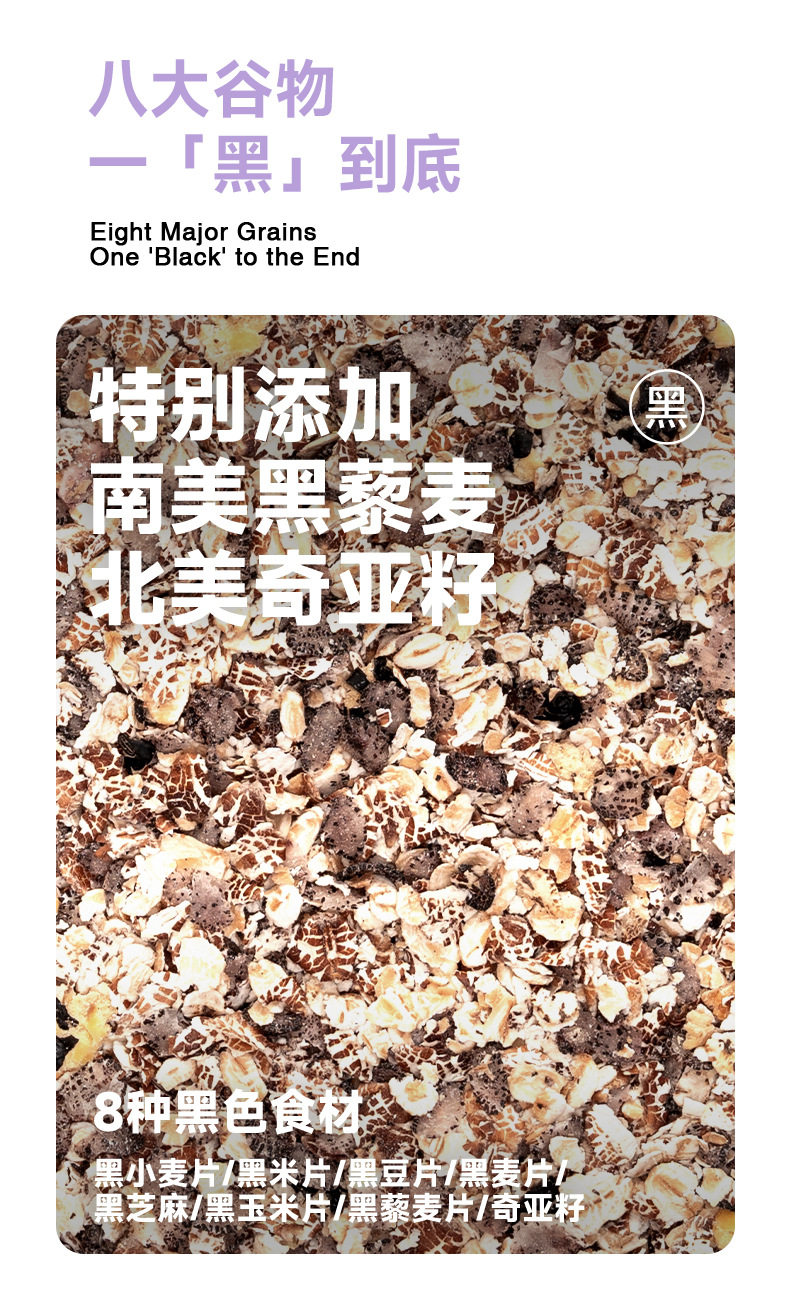 | Packaging specifications | 525g chia seeds 8 rye flakes (35g*15 bags),525g quinoa 9 red oatmeal (35g*15 bags),525g chia seed 8 black brewed oatmeal*2 (free 120g8 black oatmeal*4 bags),525g quinoa 9 red instant oatmeal*2 (free 120g8 dark oatmeal*4 bags),525g chia seed 8 black brewed oatmeal + 525g quinoa 9 red brewed oatmeal (free 120g 8 rye oatmeal * 4 bags) |