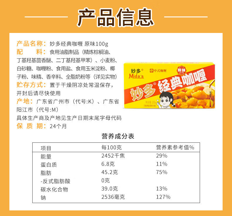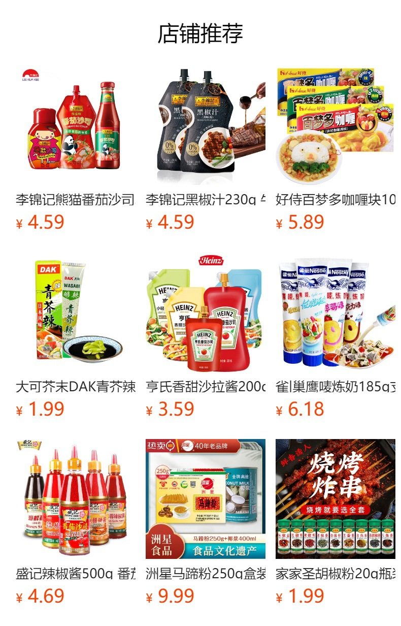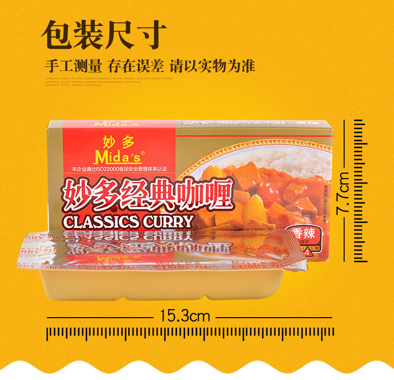 | Packaging specifications | [miaoduo] classic curry [original flavor] 100g (single box),[miaoduo] classic curry [spicy] 100g (single box),[miaoduo] curry cubes [spicy] 100g (single box),[miaoduo] classic curry [slightly spicy] 100g (single box),Dicodak [green mustard spicy sauce] 43g*3 boxes,[baimengduo] curry [slightly spicy] 100g (single box),[baimengduo] curry [original flavor] 100g (single box),[baimengduo] curry [spicy] 100g (single box),Wang shouyi [thirteen fragrance] condiment 45g (single box),Heinz [qiandao] salad dressing 200g (single bag),Heinz [sweet] salad dressing 200g (single bag),Heinz [little light pure] salad dressing 175g (single bag),Heinz [original flavor] salad dressing 200g (single bag),Heinz [tomato sauce] 320g (single bag),Heinz [tomato sauce] 120g (single bag),Heinz [black pepper sauce] squeeze 200g (single bag),Heinz [egg yolk salad dressing] squeeze pack 200g (single bag),Heinz [tomato sauce] squeeze bottle inverted 360g (single bottle),Heinz [roasted sesame flavor] salad juice 200g (single bottle) |