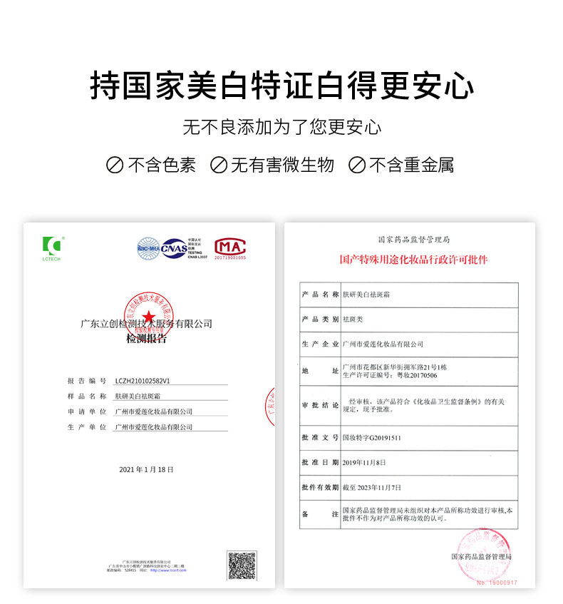 | Special Purpose Cosmetic Certificate No. | National makeup special word G20191511 |