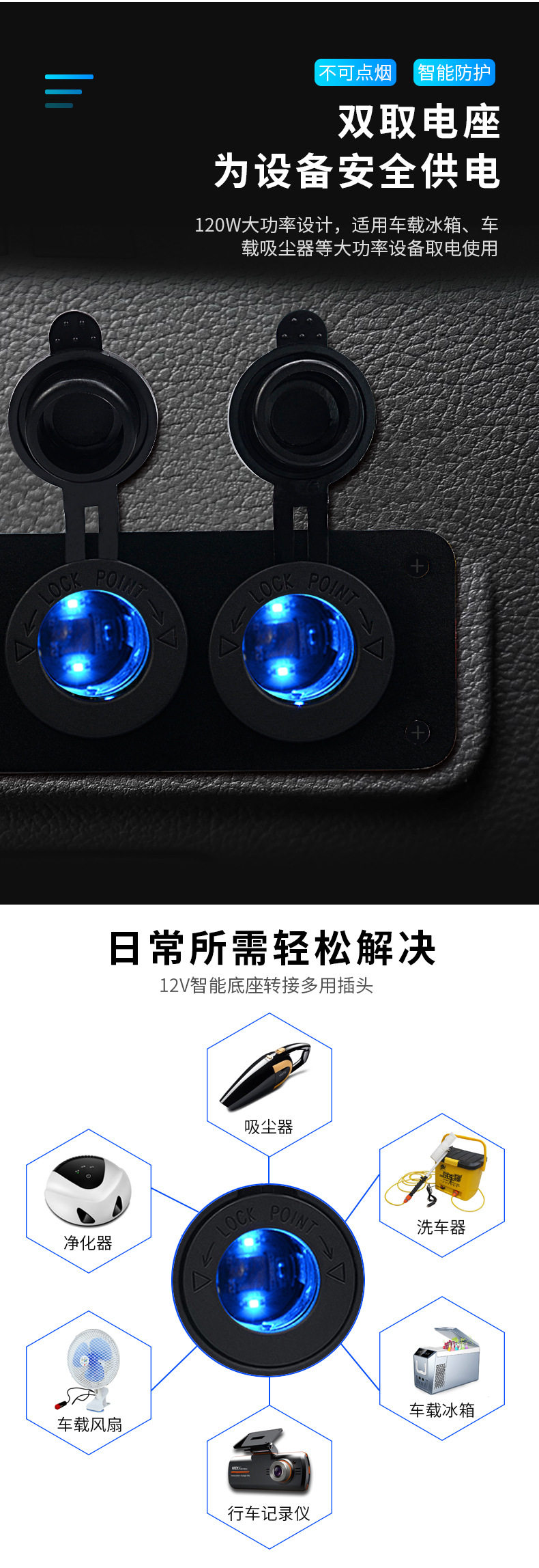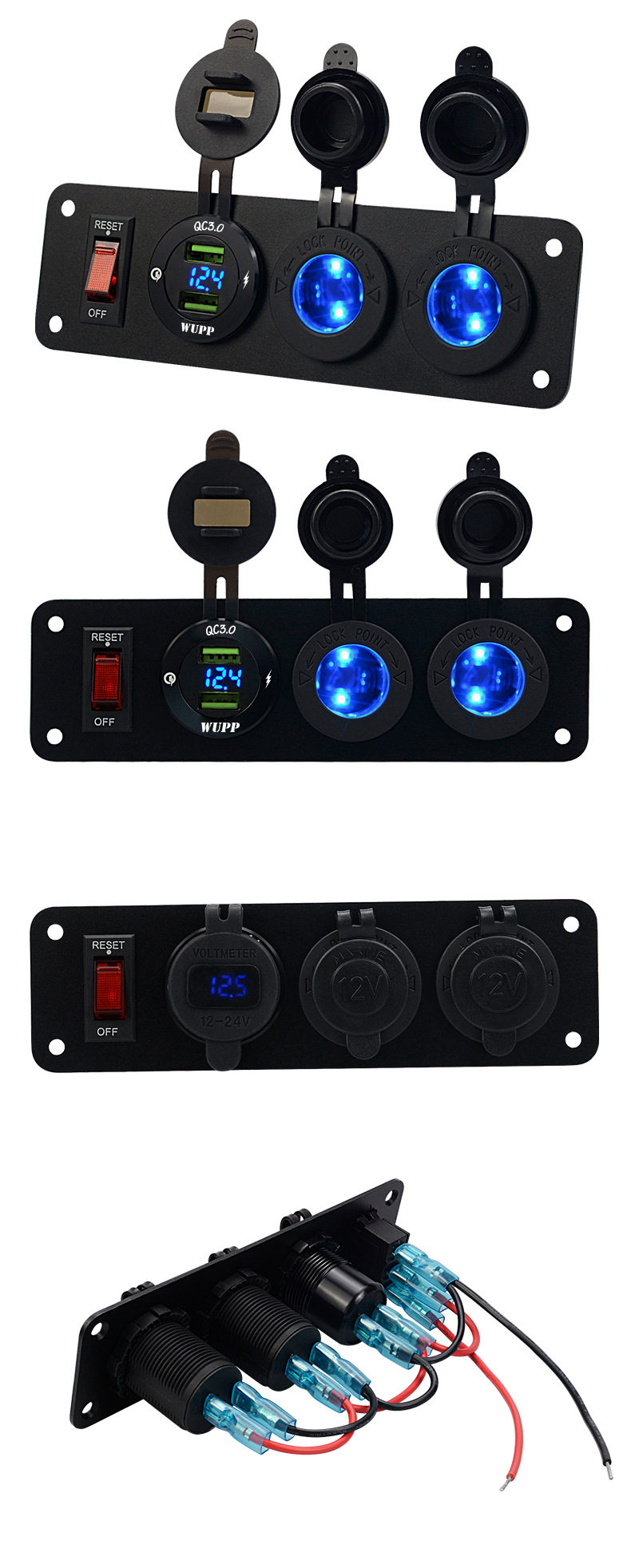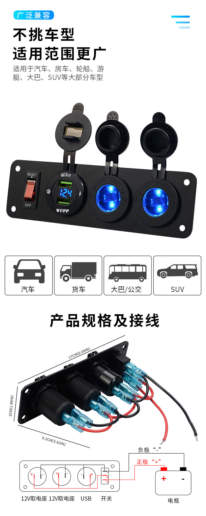 Car central control modified car single QC3.0 mobile phone charger digital display voltage with light double electric seat 12v combination