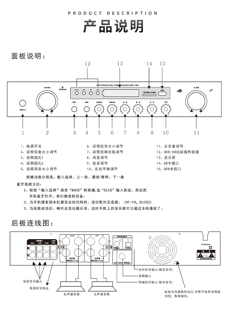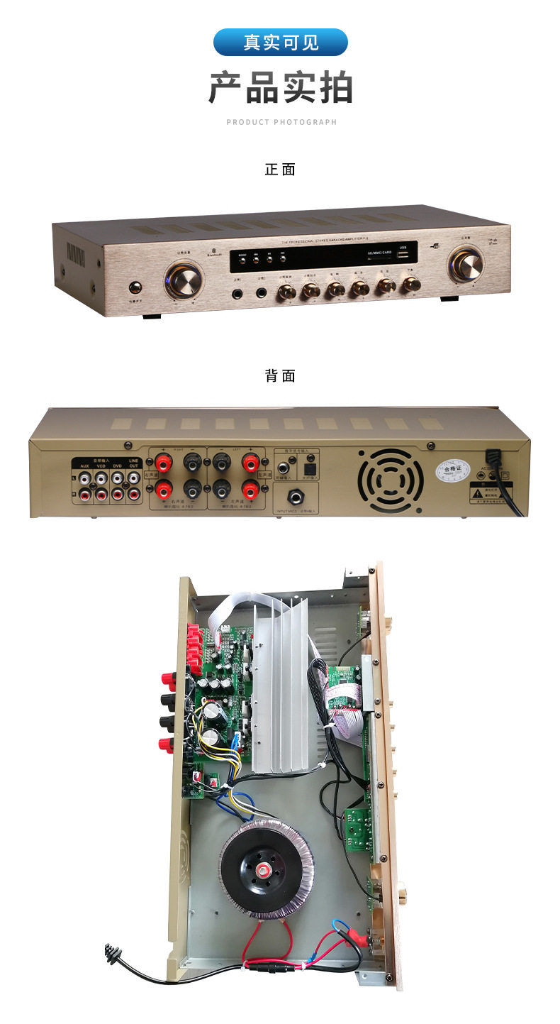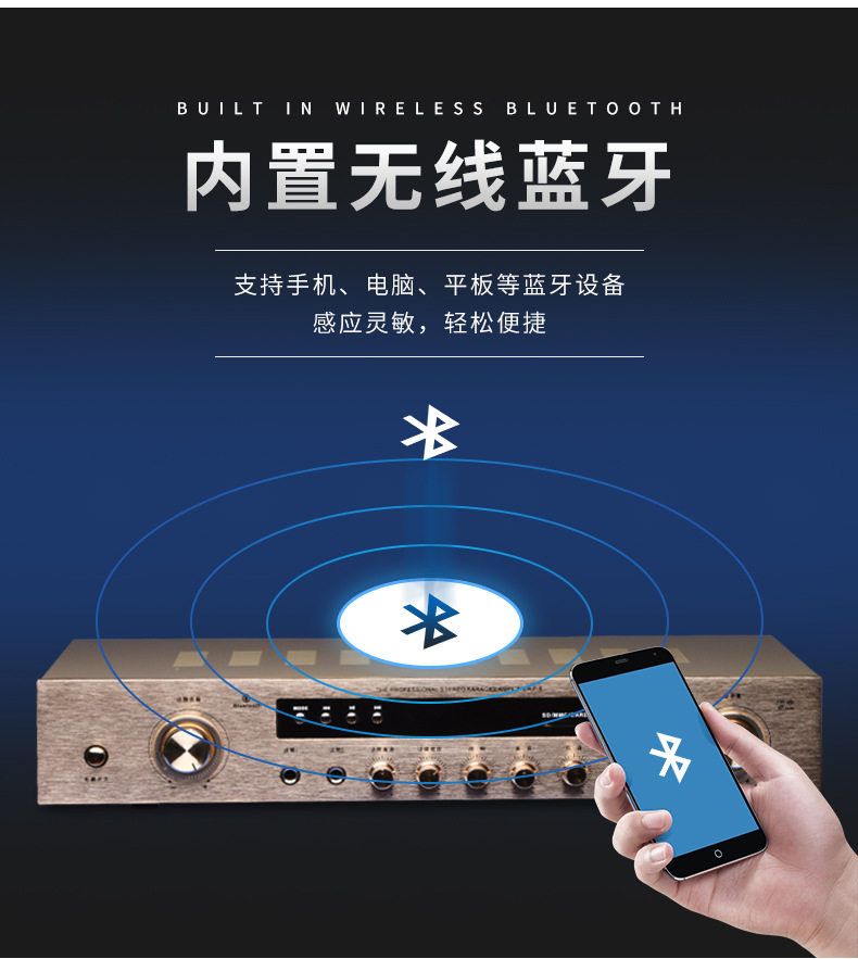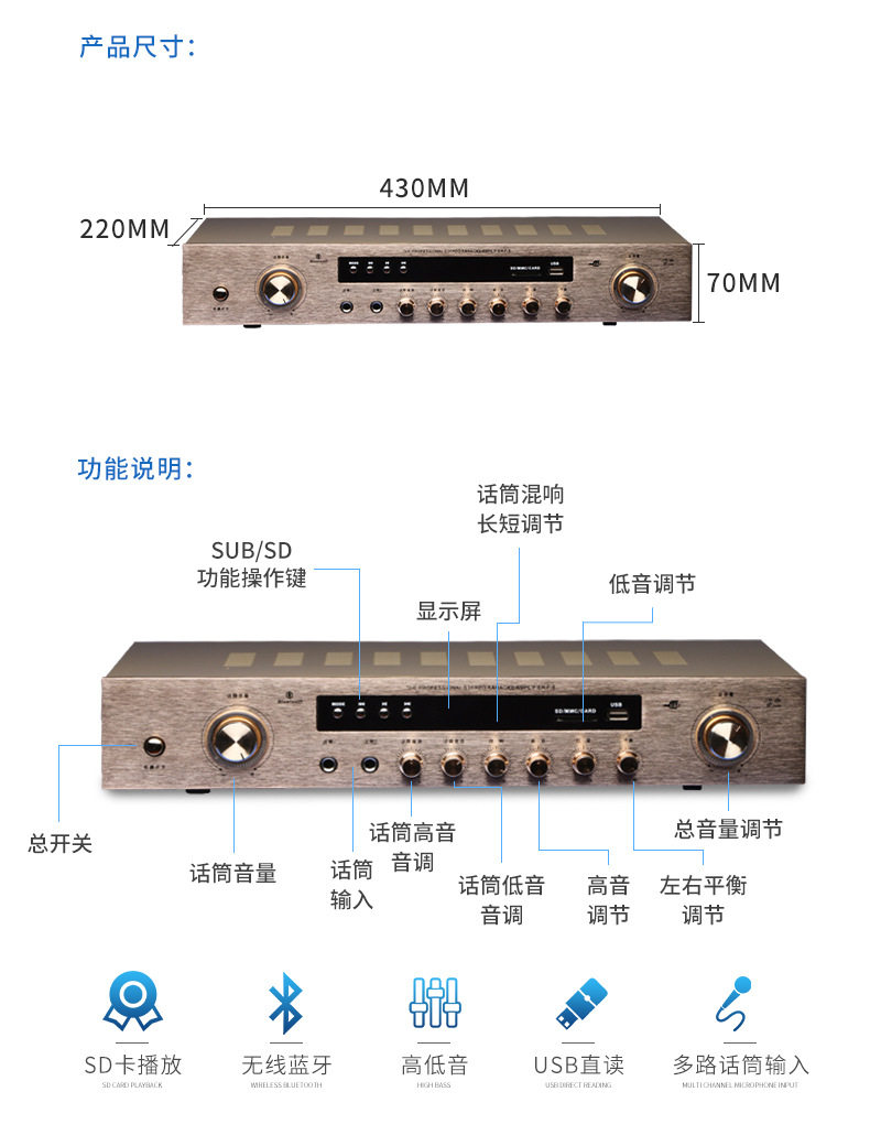 | Function Description | Advanced gold pull aluminum panel U disk/SD card playback/Bluetooth/wireless Bluetooth 5 |