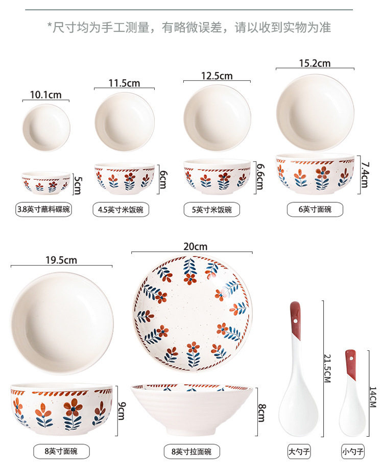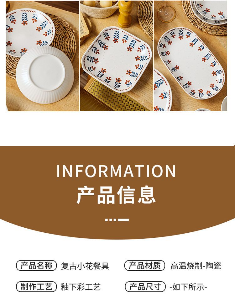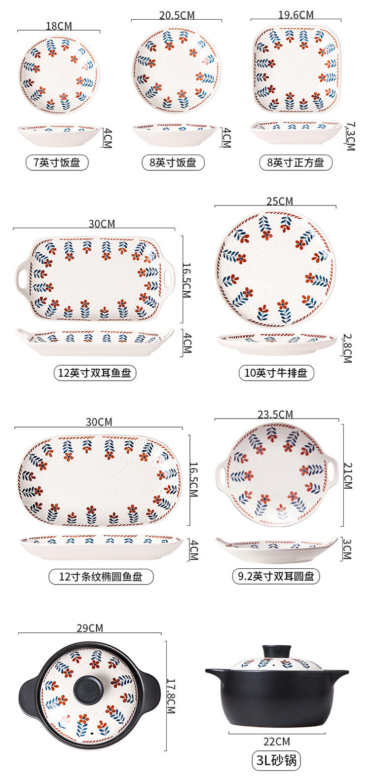 | Color | Small spoon (2 pieces),Big spoon,3.5inch cloth pattern discs (2 pieces),6inch cloth bowl,7inch striped deep plate,8inch striped square plate,11.8inch binaural fish plate,10inch bull row shallow dish |