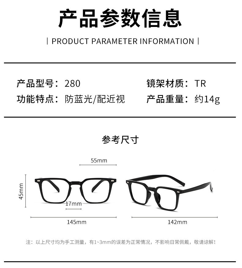 Cross-border anti-blue glasses new net red flat mirror 280 box TR fashion glasses frame plain street myopia