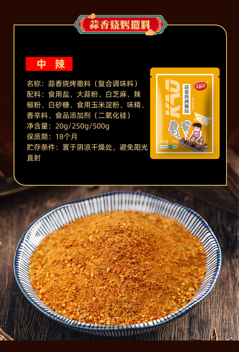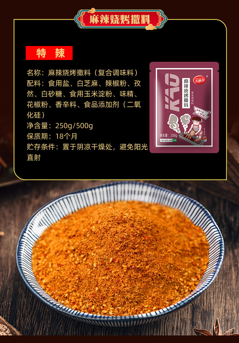 | Packaging specifications | 20g cumin flavor (slightly spicy),Spicy flavor 20g (super spicy),Garlic flavor 20g (medium spicy),Spiced flavor 20g (not spicy),Cumin flavor 160g (slightly spicy) bottled,Spicy flavor 160g bottle (super spicy) bottle,Garlic flavor 160g bottled (medium spicy) bottled,Spiced flavor 160g (not spicy) bottled,Cumin flavor 250g (slightly spicy),Spicy flavor 250g (super spicy),Garlic flavor 250g (medium spicy),Spiced 250g (not spicy) |