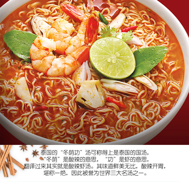 | Packing specification | Hot and Sour Shrimp Noodles in Soup (Whole Bag),Sour and Hot Shrimp Flavor Soup Noodles (Whole Bag),Thai spicy seafood noodle soup (whole bag),Thai green curry flavor noodle soup (whole bag) |