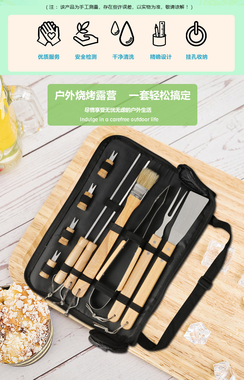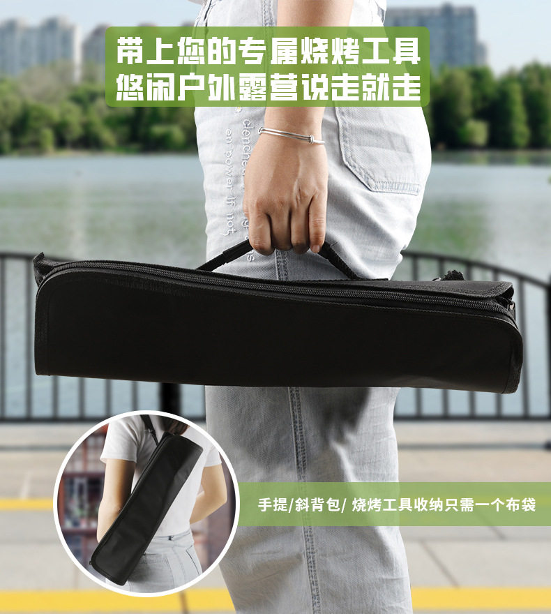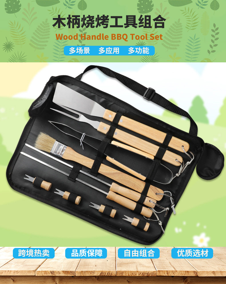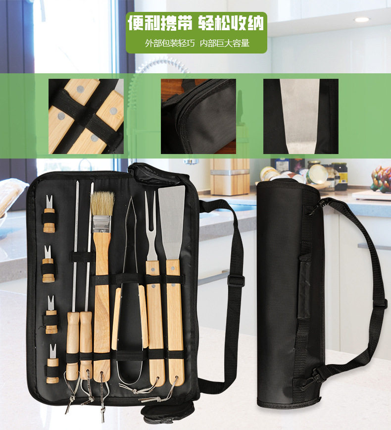Factory in stock barbecue BBQ grill suit outdoor barbecue tools portable cloth bag wooden handle Stainless Steel Grill