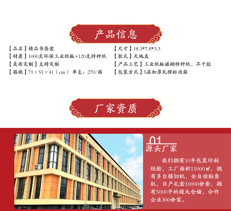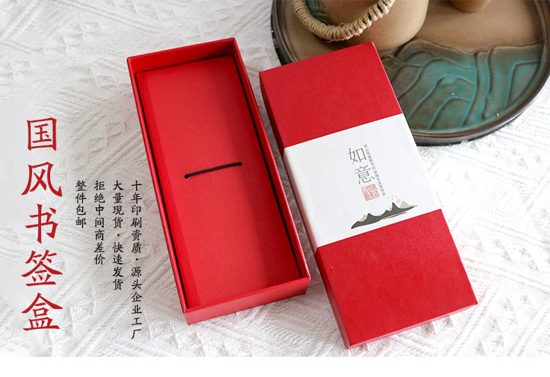| Specifications and models | Red single bookmark box without label; 18.5*8*3.3,Red single bookmark box with label 1;18.5*8*3.3,Red single bookmark box plus label 2;18.5*8*3.3,Red single bookmark custom label; 18.5*8*3.3,Gold list title hot stamping bookmark box; 18.5*8*3.3,Red single handbag;20*11*5,Double without label; 18.5*10.5*3.3,Three pieces without labels; 18.5*15*3.3,Four pieces without labels; 18.5*21*3.3,Chinese style bookmark box;15.2*8.3*2.5 |