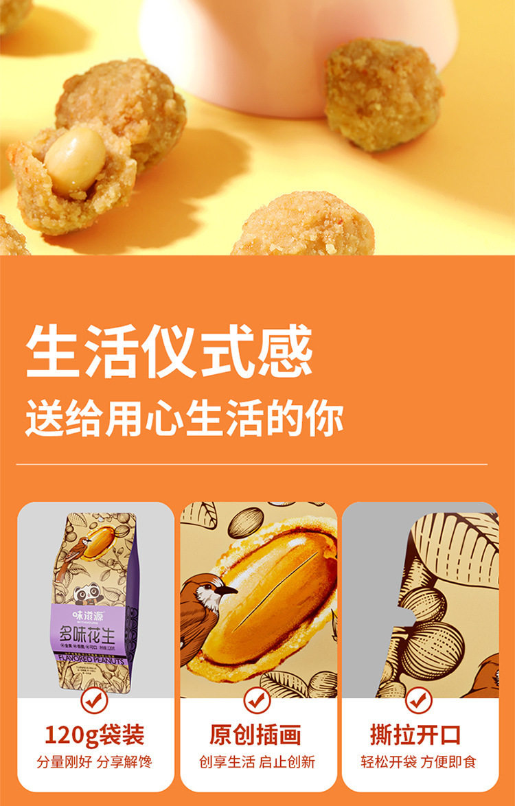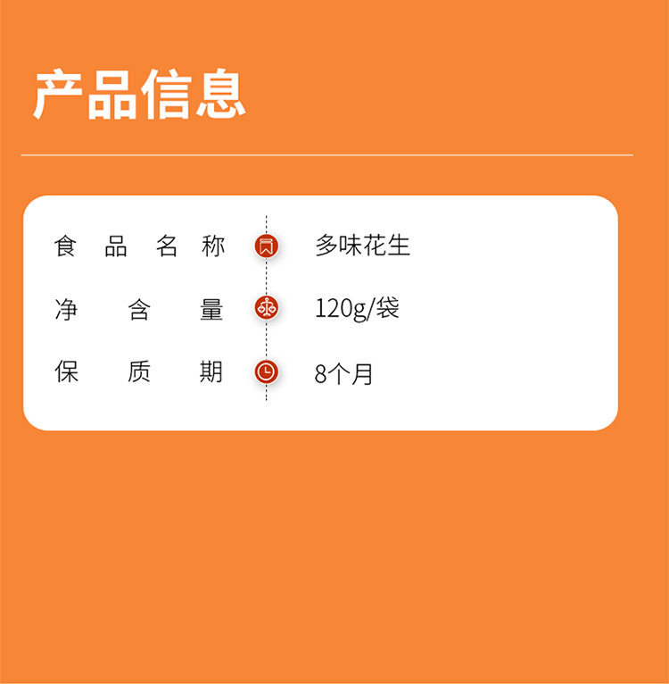 | Packaging specifications | Multi-flavored peanuts (120g*1 bag),Multi-flavored peanuts (120g*2 bags) |