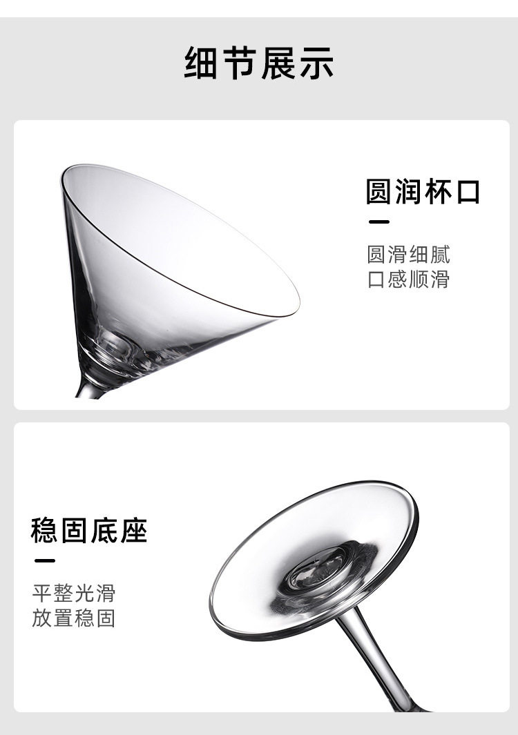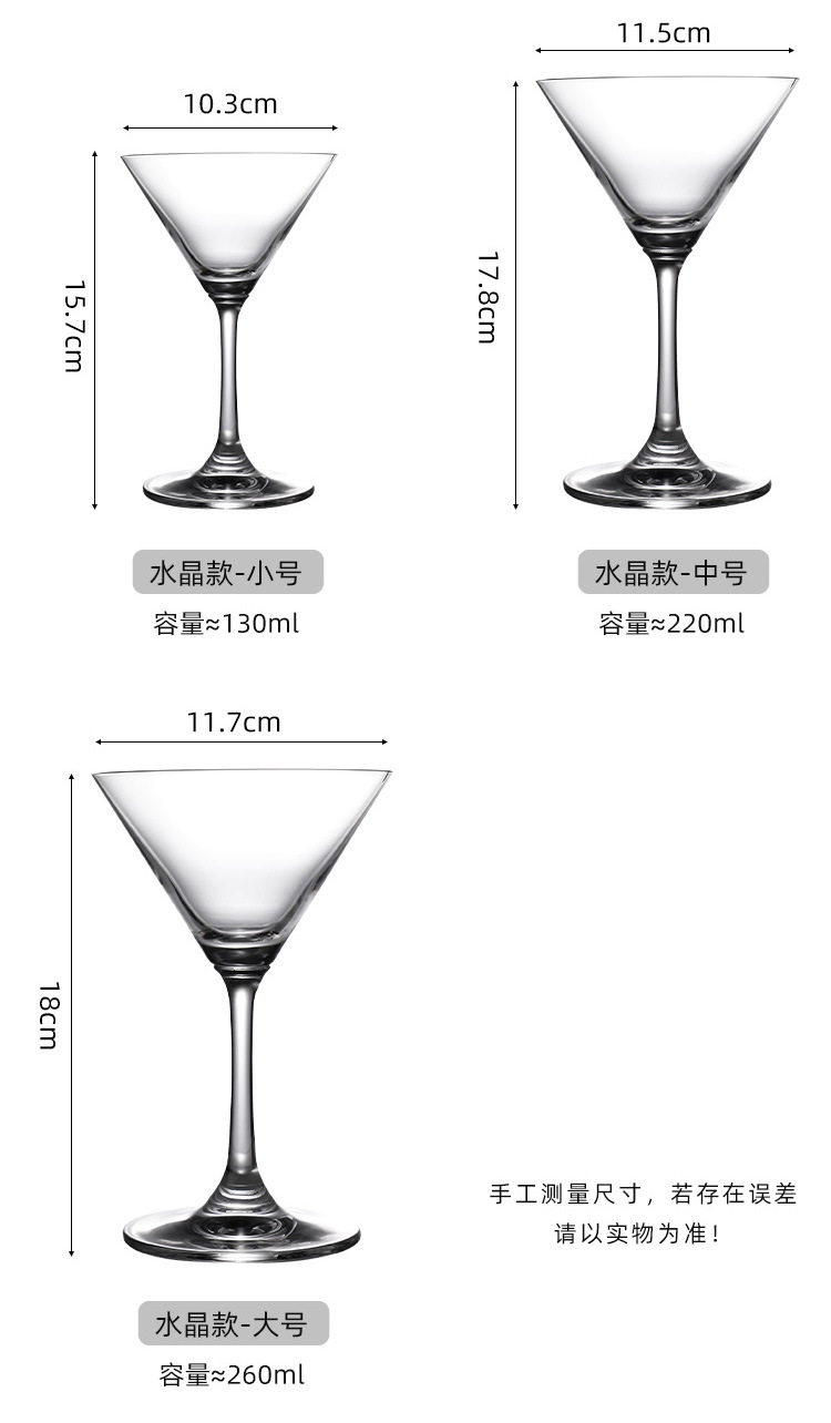 | Specification size | Martini cup small size 120ml-ordinary style,Martini cup large 200ml-ordinary style,Martini cup small size 130ml-crystal style,Martini cup medium 220ml-crystal style,Martini cup large 260ml-crystal style,Tower cup 150ml-small size,Tower cup 220ml-large size,Margaret cup 190ml-small,Margaret cup 275ml-large,Straight cup 280ml |