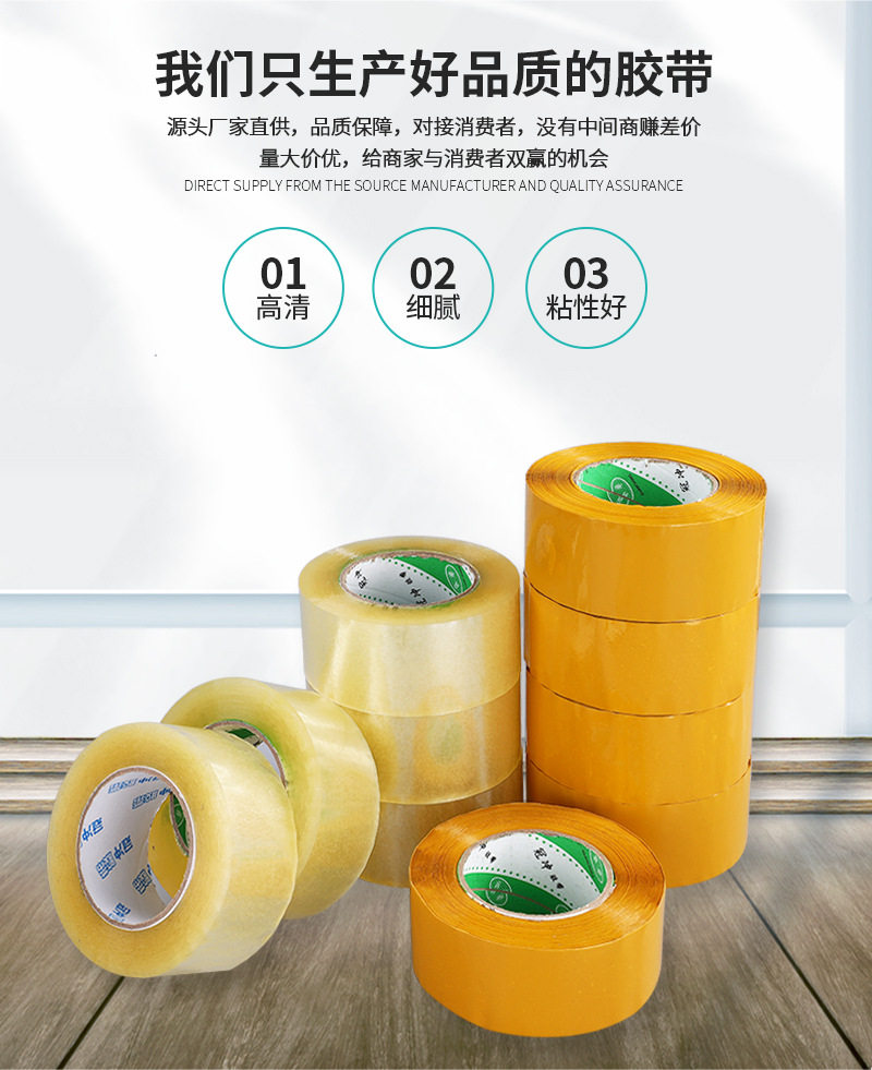 | Specifications and models | Beige; 4.2cm wide and 2.0cm thick and 110m long (72 rolls in the whole box),Beige; 4.2cm wide and 2.5cm thick and 150m long (54 rolls in the whole box),Beige yellow; Width 4.2cm thick 3.0cm long about 200m (whole box 54 rolls),Beige; The width is 4.5cm, the thickness is 2.0cm, and the length is about 110m (72 rolls in the whole box),Beige; Width 4.5cm thick 2.5cm long about 150m (whole box 54 rolls),Beige yellow; Width 4.5cm thick 3cm long about 200m (whole box 54 rolls),Beige; The width is 5cm, the thickness is 2cm, and the length is about 110m (the whole box is 72 rolls),Beige yellow; Width 5cm thick 2.5cm long about 150m (whole box 54 rolls),Beige yellow; Width 5cm thick 3.0cm long about 200m (whole box 54 rolls),Beige yellow; Width 5.5cm thick 2.0cm long about 110m (whole box 60 rolls),Beige; Width 5.5cm thick 2.5cm long about 150m (whole box 45 rolls),Beige; Width 5.5cm thick 3.0cm long about 200m (whole box 45 rolls),Beige yellow; Width 6cm thick 2.0cm long about 110m (60 rolls in the whole box),Beige; Width 6cm thick 2.5cm long about 150m (whole box 45 rolls),Beige yellow; Width 6cm thick 3.0cm long about 200m (whole box 45 rolls),Transparent; Width 4.2cm thick 2.0cm long about 110m (whole box 72 rolls),Transparent; The width is 4.2cm, the thickness is 2.5cm, and the length is about 150m (the whole box is 54 rolls),Transparent; The width is 4.2cm, the thickness is 3.0cm, and the length is about 200m (the whole box is 54 rolls),Transparent; Width 4.5cm thick 2.0cm long about 110m (whole box 72 rolls),Transparent; The width is 4.5cm, the thickness is 2.5cm, and the length is about 150m (the whole box is 54 rolls),Transparent; Width 4.5cm thick 3cm long about 200m (whole box 54 rolls),Transparent; The width is 4.8cm, the thickness is 2.0cm, and the length is about 110m (the whole box is 72 rolls),Transparent; The width is 4.8cm, the thickness is 2.5cm, and the length is about 150m (the whole box is 54 rolls),Transparent; The width is 4.8cm, the thickness is 3.0cm, and the length is about 200m (the whole box is 54 rolls),Transparent; The width is 5cm, the thickness is 2cm, and the length is about 110m (the whole box is 72 rolls),Transparent; Width 5cm thick 2.5cm long about 150m (whole box 54 rolls),Transparent; Width 5cm thick 3.0cm long about 200m (whole box 54 rolls),Transparent; Width 5.5cm thick 2.0cm long about 110m (60 rolls),Transparent; Width 5.5cm thick 2.5cm long about 150m (whole box 45 rolls),Transparent; Width 5.5cm thick 3.0cm long about 200m (whole box 45 rolls),Transparent; The width is 6cm, the thickness is 2.0cm, and the length is about 110m (the whole box is 60 rolls),Transparent; The width is 6cm, the thickness is 2.5cm, and the length is about 150m (the whole box is 45 rolls),Transparent; Width 6cm thick 3.0cm long about 200m (whole box 45 rolls),Transparent yellow; 4.2cm wide, 2.0cm thick and 110m long (72 rolls in the whole box),Transparent yellow; Width 4.2cm thick 2.5cm long about 150m (whole box 54 rolls),Transparent yellow; The width is 4.2cm, the thickness is 3.0cm, and the length is about 200m (the whole box is 54 rolls),Transparent yellow; Width 4.5cm thick 2.0cm long about 110m (whole box 72 rolls),Transparent yellow; Width 4.5cm thick 2.5cm long about 150m (whole box 54 rolls),Transparent yellow; Width 4.5cm thick 3cm long about 200m (whole box 54 rolls),Transparent yellow; The width is 4.8cm, the thickness is 2.0cm, and the length is about 110m (72 rolls in the whole box),Transparent yellow; The width is 4.8cm, the thickness is 2.5cm, and the length is about 150m (the whole box is 54 rolls),Transparent yellow; The width is 4.8cm, the thickness is 3.0cm, and the length is about 200m (the whole box is 54 rolls),Transparent yellow; The width is 5cm, the thickness is 2cm, and the length is about 110m (the whole box is 72 rolls),Transparent yellow; Width 5cm thick 2.5cm long about 150m (whole box 54 rolls),Transparent yellow; Width 5cm thick 3.0cm long about 200m (whole box 54 rolls),Transparent yellow; Width 5.5cm thick 2.0cm long about 110m (whole box 60 rolls),Transparent yellow; Width 5.5cm thick 2.5cm long about 150m (whole box 45 rolls),Transparent yellow; Width 5.5cm thick 3.0cm long about 200m (whole box 45 rolls),Transparent yellow; The width is 6cm, the thickness is 2.0cm, and the length is about 110m (the whole box is 60 rolls),Transparent yellow; Width 6cm thick 2.5cm long about 150m (whole box 45 rolls),Transparent yellow; Width 6cm thick 3.0cm long about 200m (whole box 45 rolls) |