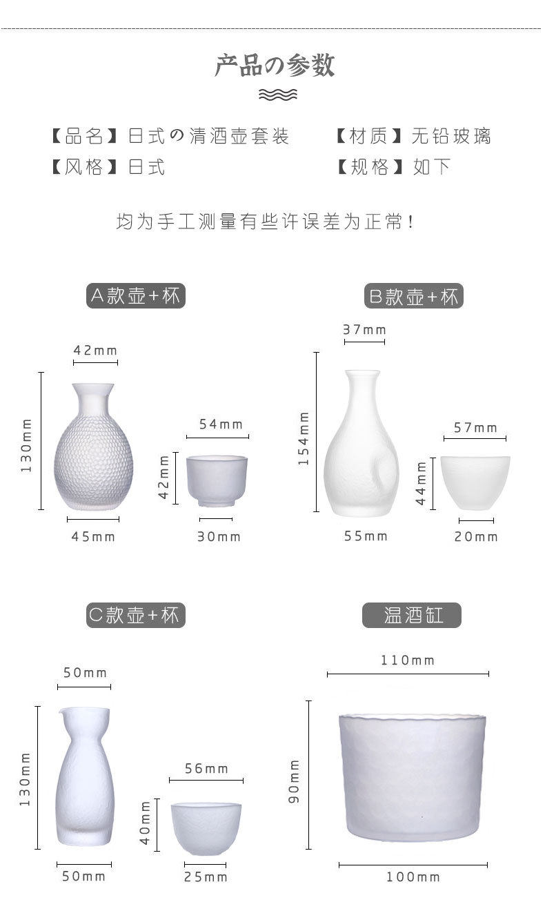 | Size | A Cup-transparent,A Cup-tracing gold,A Cup-frosted,A Pot-transparent (with Cork),A Pot-drawing Gold (with Cork),A pot-frosted (with Cork),B cup-transparent,B Cup-tracing gold,B cup-frosted,B Pot-transparent (with Cork),B pot-tracing gold (with Cork),B pot-frosted (with Cork),C cup-transparent,C cup-tracing gold,C pot-transparent (with Cork),C pot-tracing gold (with Cork),Warm wine tank-transparent,Warm wine tank-tracing gold,A flat light 1 pot 4 cups (with Cork),A flat light 1 pot 4 cups 1 cylinder (with Cork),A tracing gold 1 pot 4 cups (with Cork),A tracing gold 1 pot 4 cups 1 cylinder (with Cork),A frosted 1 pot 4 cups (with Cork),B flat light 1 pot 4 cups (with Cork),B flat light 1 pot 4 cups 1 cylinder (with Cork),B tracing gold 1 pot 4 cups (with Cork),B tracing gold 1 pot 4 cups 1 cylinder (with Cork),B frosted 1 pot 4 cups (with Cork),C flat light 1 pot 4 cups (with Cork),C flat light 1 pot 4 cups 1 cylinder (with Cork),C tracing gold 1 pot 4 cups (with Cork),C tracing gold 1 pot 4 cups 1 cylinder (with Cork),C cup-frosted,C pot scrub (with Cork),Frosted warm wine tank,Straight-body wine splitter,A flat light 1 pot 4 cups 1 cylinder (with cork) gift box,A tracing gold 1 pot 4 cups 1 cylinder (with cork) gift box,A frosted 1 pot 4 cups 1 cylinder (with cork) gift box,A peacock blue 1 pot 4 cups 1 cylinder (with Cork),A Peacock Blue Wine Jug (with Cork),A peacock blue cup,Peacock Blue Warm Wine Tank,A peacock blue 1 pot 4 cups 1 cylinder-gift box (with Cork) |