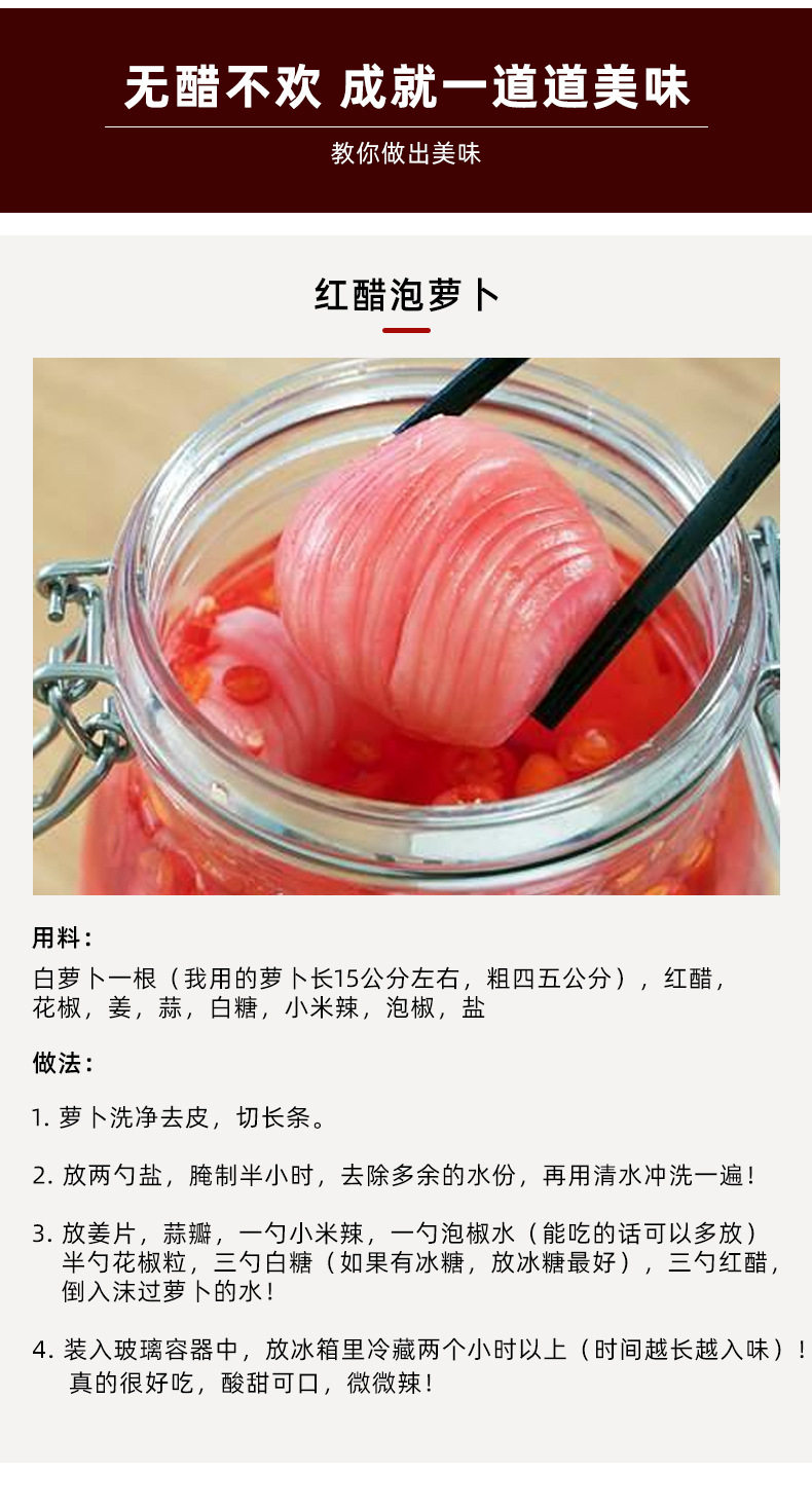 | Packaging specifications | 700ml red zhejiang vinegar*1,700ml red zhejiang vinegar*2,700ml red zhejiang vinegar*3,1.9L red zhejiang vinegar*1,2.5L red zhejiang vinegar*1,5L red zhejiang vinegar ( 5kg ) |