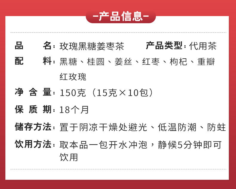 | Packaging specifications | Brown sugar ginger jujube tea (15g*10 bags) |