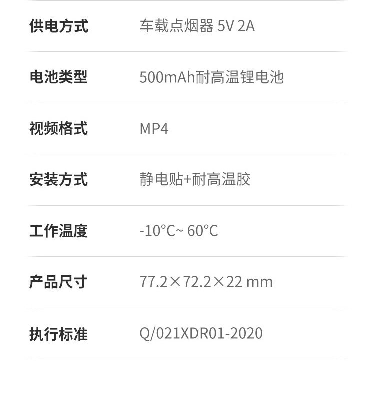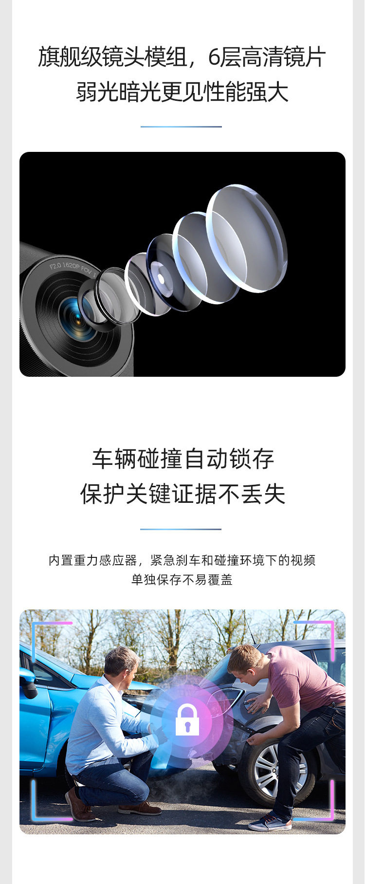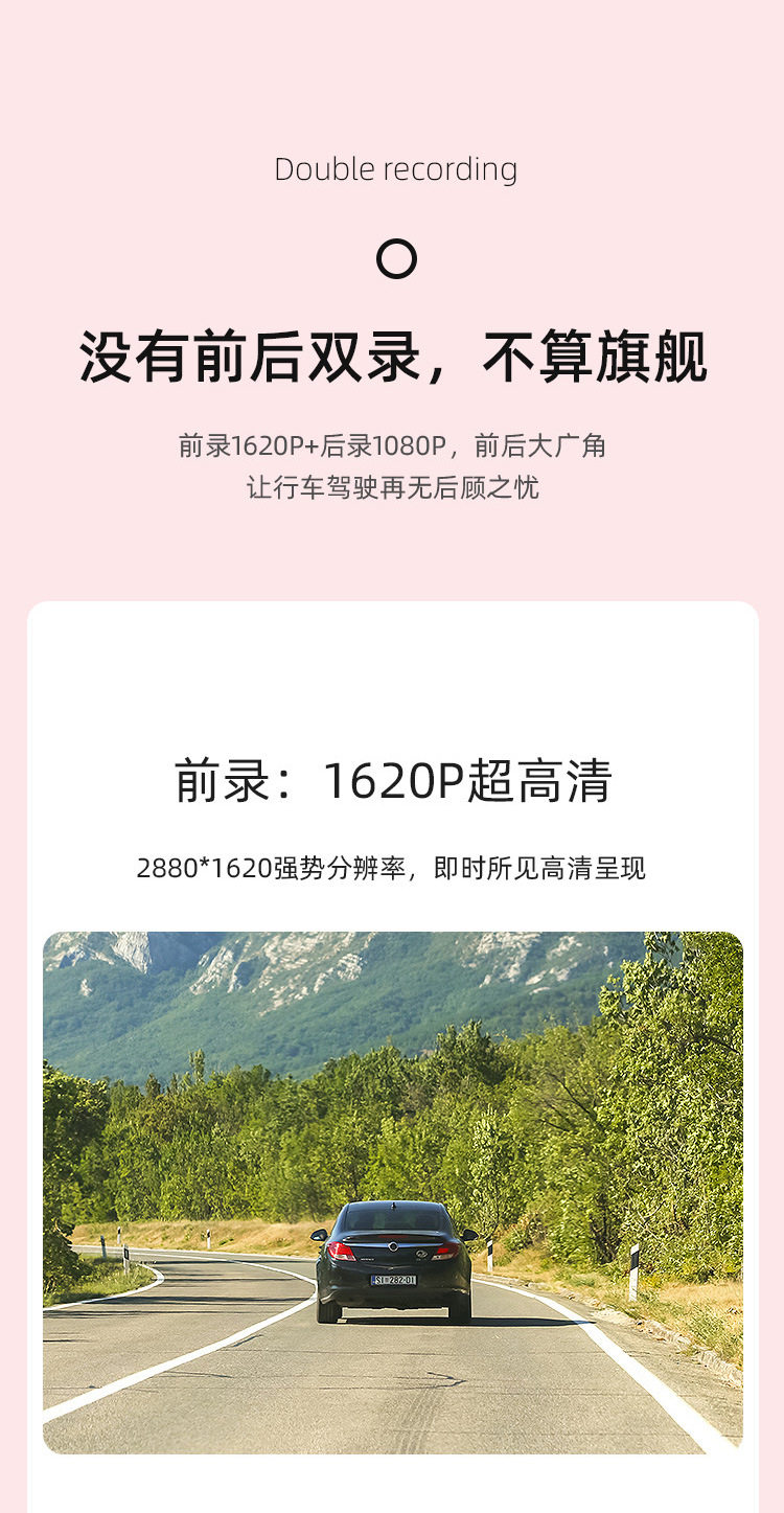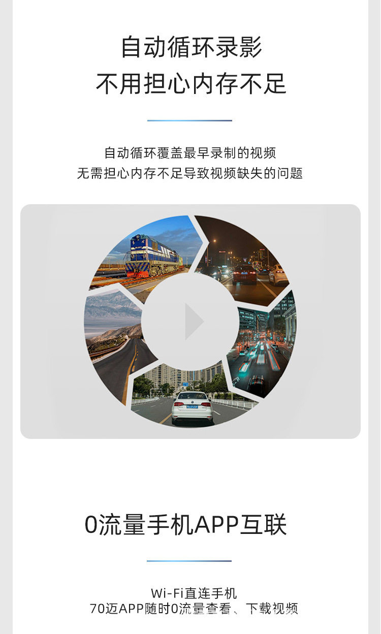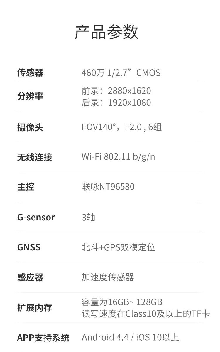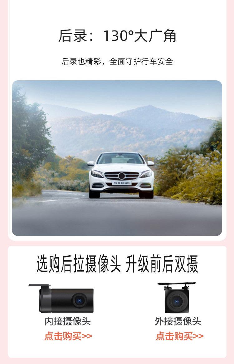 | Function | Loop recording,Parking monitoring,Front car starting reminder,Front vehicle distance detection,Orbital deviation warning,Front vehicle collision warning,Pedestrian collision warning,Collision sensor,Enhanced night vision,Screen distortion correction,Before and after video |