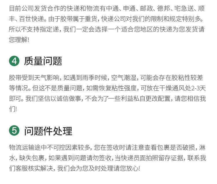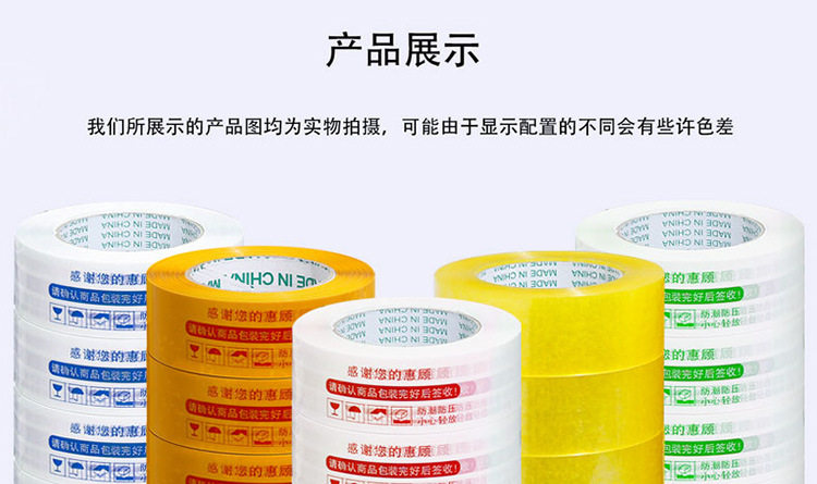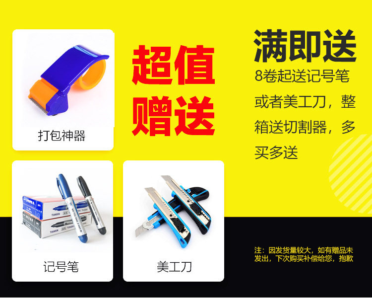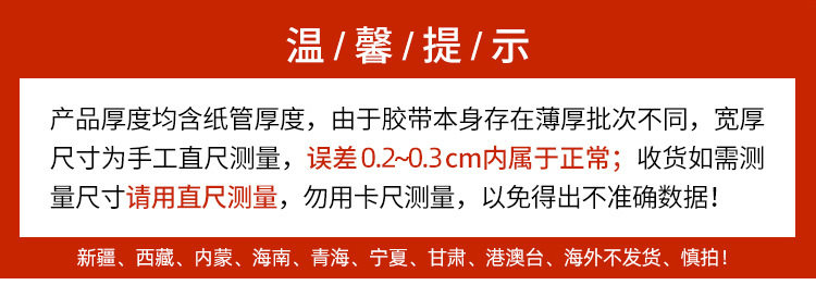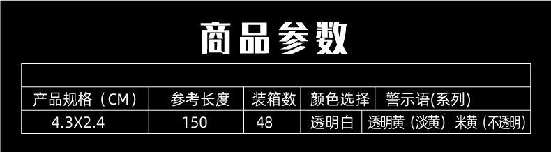 | Specifications and models | The scarlet letter on white background; 4.5 wide * 1.8 thick * 130 [54 volumes in the whole box]],Scarlet letter on white background; 4.3 wide * 2.4 thick * 160 [48 volumes in the whole box]],The scarlet letter on white background; 4.5 wide * 2.5 thick * 200 [42 volumes in the whole box]],The scarlet letter on white background; 4.8 wide * 2.5 thick * 200 [42 volumes in the whole box]],Scarlet letter on white background; 6.0 wide * 1.8 thick * 130 [60 volumes in the whole box]],Blue characters on white background; 4.3 wide * 2.4 thick * 160 [48 volumes in the whole box]],Blue characters on white background; 4.5 wide * 2.5 thick * 200 [42 volumes in the whole box]],Blue characters on white background; 4.8 wide * 2.5 thick * 200 [42 volumes in the whole box]],Blue characters on white background; 6.0 wide * 1.8 thick * 130 [60 volumes in the whole box]],Green characters on white background; 4.3 wide * 2.4 thick * 160 [48 volumes in the whole box]],Green characters on white background; 4.5 wide * 2.5 thick * 200 [whole box 42 volumes]],Scarlet letter on yellow background; 4.3 wide * 2.4 thick * 160 [48 volumes in the whole box]],Scarlet letter on yellow background; 4.5 wide * 2.5 thick * 200 [42 volumes in the whole box]],It is clear. 4.5 wide * 1.8 thick * 130 [54 volumes taken in the whole box]],It is clear. 4.3 wide * 2.4 thick * 160 [48 volumes taken in full box]],It is clear. 4.5 wide * 2.5 thick * 200 [42 rolls in whole box]],It is clear. 4.8 wide * 2.5 thick * 200 [42 rolls in whole box]],It is clear. 6.0 wide * 1.8 thick * 130 [60 rolls in whole box]],Transparent yellow; 4.5 wide * 1.8 thick * 130 [54 volumes taken in full box]],Transparent yellow; 4.3 wide * 2.4 thick * 160 [48 volumes taken in full box]],Transparent yellow; 4.5 wide * 2.5 thick * 200 [whole box 42 volumes]],Transparent yellow; 4.8 wide * 2.5 thick * 200 [whole box 42 volumes]],Transparent yellow; 6.0 wide * 1.8 thick * 130 [60 rolls in whole box]],Beige opaque; 4.5 wide * 1.8 thick * 130 [54 volumes taken in full box]],Beige opaque; 4.3 wide * 2.4 thick * 160 [48 volumes taken in full box]],Beige opaque; 4.5 wide * 2.5 thick * 200 [whole box 42 volumes]],Beige opaque; 4.8 wide * 2.5 thick * 200 [whole box 42 volumes]],Beige opaque; 6.0 wide * 1.8 thick * 130 [60 rolls in whole box]],Black text on yellow background; 4.3 width * 2.4 thickness * 160 [full box of 48 volumes],Black text on yellow background; 4.5 width * 2.5 thickness * 200 [full box of 42 volumes] |