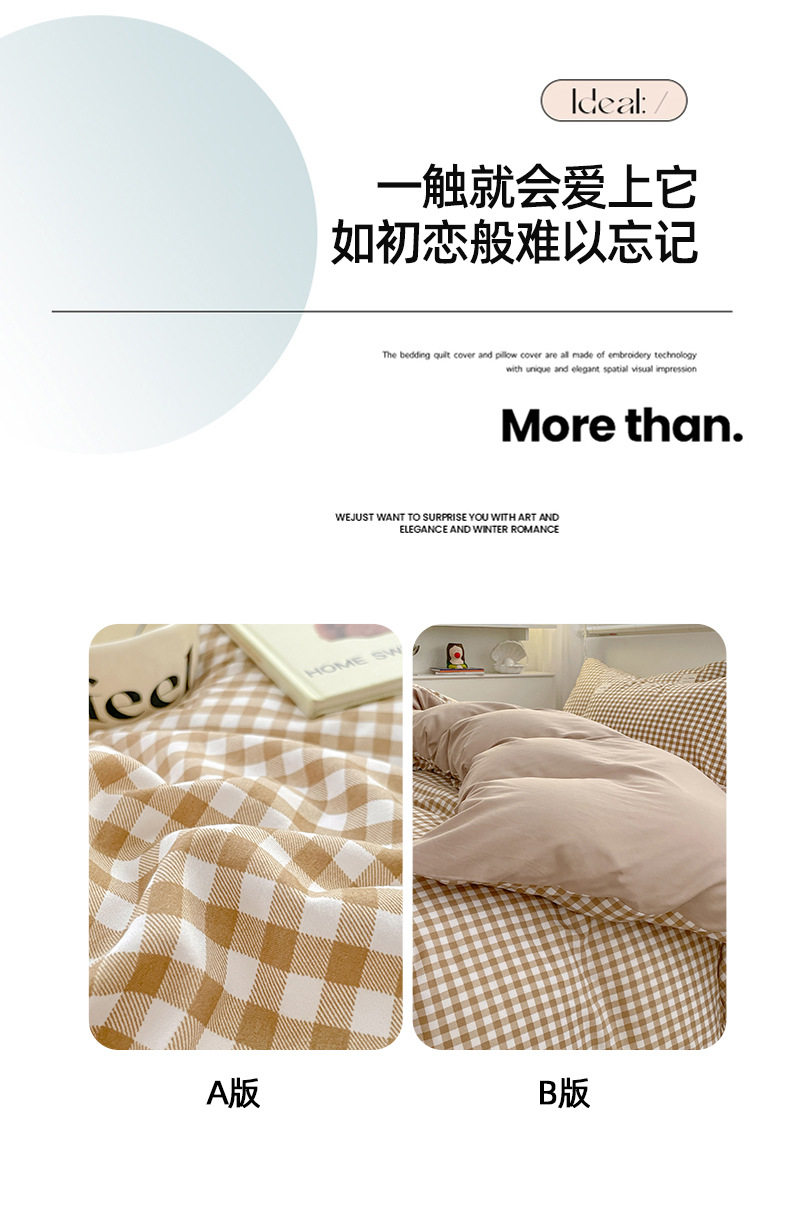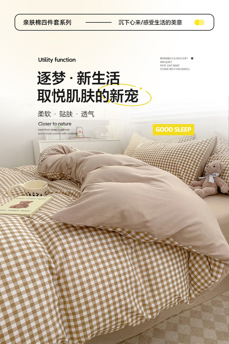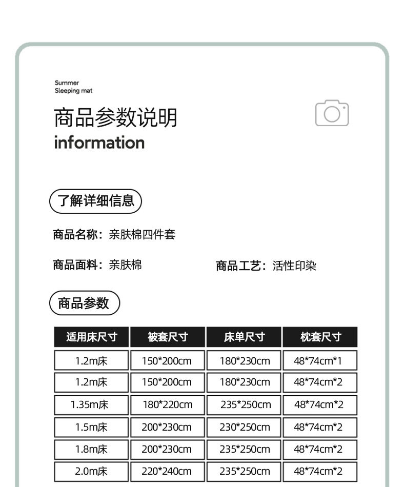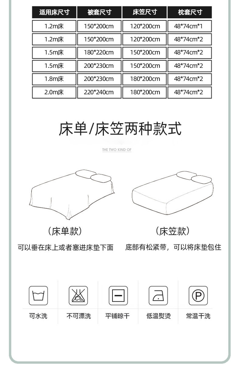 | Dimensions | Three-piece student dormitory set [quilt cover 150*200cm],1.5m four-piece set [quilt cover 150*200],1.8m four-piece set [quilt cover 180*220],2.0m four-piece set [quilt cover 200*230],2.2m four-piece set [quilt cover 220*240],★1.5m fitted sheet set of four [quilt cover 180*220cm],★1.5m fitted sheet set of four [quilt cover 200*230cm],★1.8m fitted sheet set of four [quilt cover 200*230cm],Single product quilt cover [150*200cm],Single product quilt cover [180*220cm],Single product quilt cover [200*230cm],Single product quilt cover [220*240cm] |