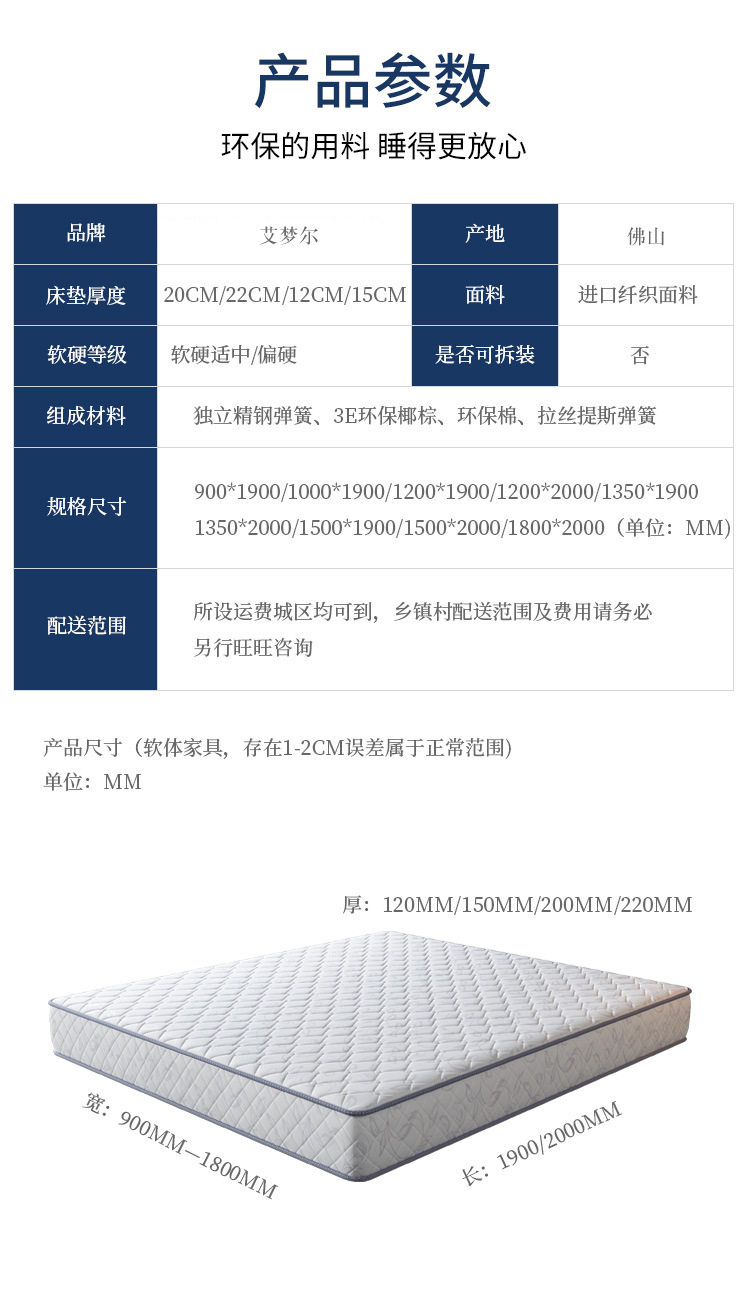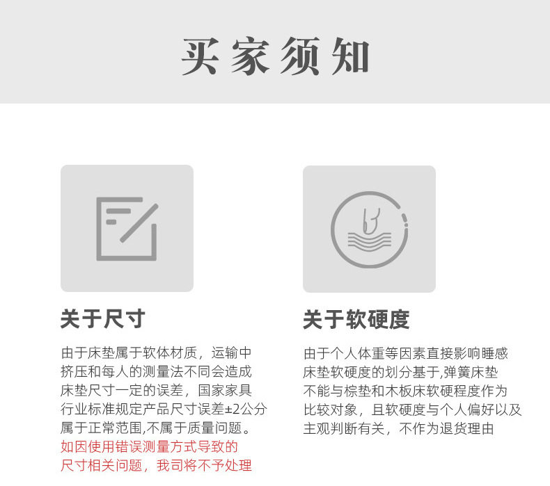 | Color | White economical type: encrypted spring/medium softness and hardness,White spine protection model: encrypted spring + environmentally friendly brown/hard,White soft model: encrypted spring + latex/slightly soft,White dual-purpose model: latex + encrypted spring + environmentally friendly brown,Upgraded fabric (recommended for short-term rental) [23cm],Fabric upgrade model (long-term rental hard-core model) [23cm],Upgraded fabric (recommended for long-term rental) [23cm],Spine-protecting luxury style,Deep sleep luxury look,Dual-purpose luxury face,Luxurious independent model: independent spring/medium softness and hardness,Luxurious independent model: independent spring + coconut palm/harder,Luxurious independent model: independent spring + latex/softer,Luxurious independent model: independent spring + coconut palm + latex/soft and hard use |