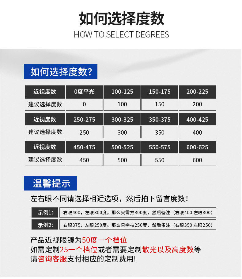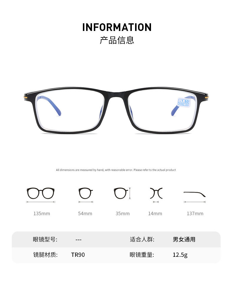 | Lens color | 0 degrees (anti-blue lens),Myopia -50 degrees,Myopia -100 degrees,Myopia -150 degrees,Myopia -200 degrees,Myopia -250 degrees,Myopia -300 degrees,Myopia -350 degrees,Myopia -400 degrees |