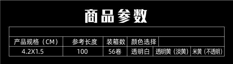 | Specifications and models | It is clear; 4.2 wide 1.5 thick 100 long [whole box 56 volumes]],It is clear; 4.2 wide, 2.4 thick, 160 long [whole box of 48 volumes]],It is clear. 4.2 wide 2.7 thick 200 long [whole box 42 volumes]],It is clear. 4.2 wide 3.0 thick 280 long [whole box 36 volumes]],Clear; 4.3 wide, 4.0 thick, 400 long [30 volumes in the whole box]],Clear; 4.8 wide 2.5 thick 180 long [whole box 42 volumes]],It is clear; 5.0 wide, 2.5 thick, 180 long [whole box of 40 volumes]],It is clear. 5.5 wide 2.5 thick 180 long [whole box 36 volumes]],Clear; 6.0 wide 2.5 thick 180 long [whole box 30 volumes]],Transparent yellow; 4.2 wide 1.5 thick 100 long [whole box 56 volumes]],Transparent yellow; 4.2 wide 2.4 thick 160 long [whole box 48 volumes]],Transparent yellow; 4.2 wide 2.7 thick 200 long [whole box 42 volumes]],Transparent yellow; 4.2 wide 3.0 thick 280 long [whole box 36 volumes]],Transparent yellow; 4.3 wide, 4.0 thick, 400 long [30 rolls in the whole box]],Transparent yellow; 4.8 wide 2.5 thick 180 long [whole box 42 volumes]],Transparent yellow; 5.0 wide 2.5 thick 180 long [whole box 40 rolls]],Transparent yellow; 5.5 wide 2.5 thick 180 long [whole box 36 volumes]],Transparent yellow; 6.0 wide 2.5 thick 180 long [whole box 30 rolls]],Beige opaque; 4.2 wide, 1.5 thick, 100 long [56 rolls in the whole box]],Beige opaque; 4.2 wide 2.4 thick 160 long [whole box 48 volumes]],Beige opaque; 4.8 wide 2.5 thick 180 long [whole box 42 volumes]],Beige opaque; 5.0 wide 2.5 thick 180 long [whole box of 40 rolls]],Beige opaque; 5.5 wide, 2.5 thick, 180 long [36 volumes in the whole box]],Beige opaque; 6.0 wide, 2.5 thick, 180 long [30 rolls in the whole box]] |