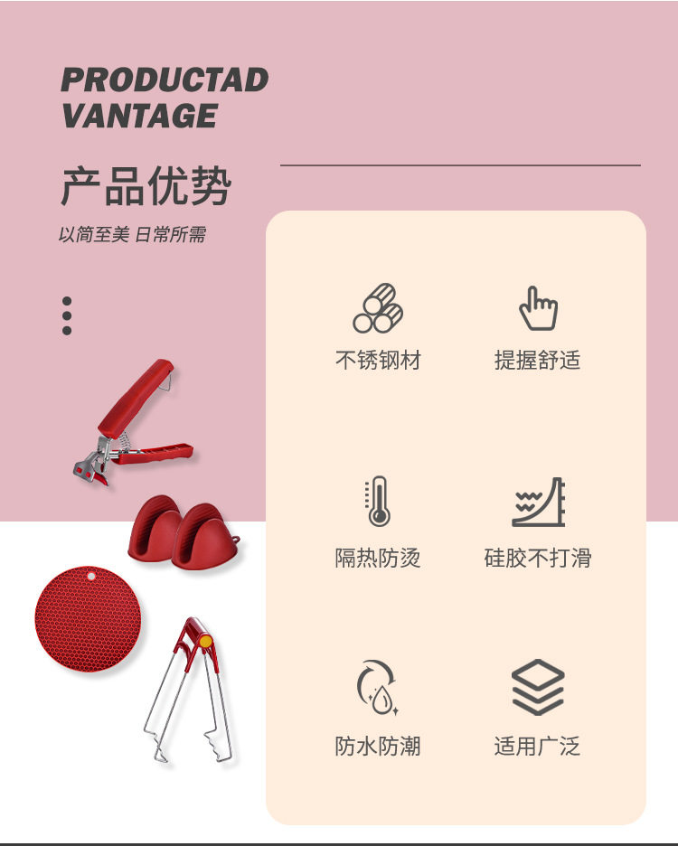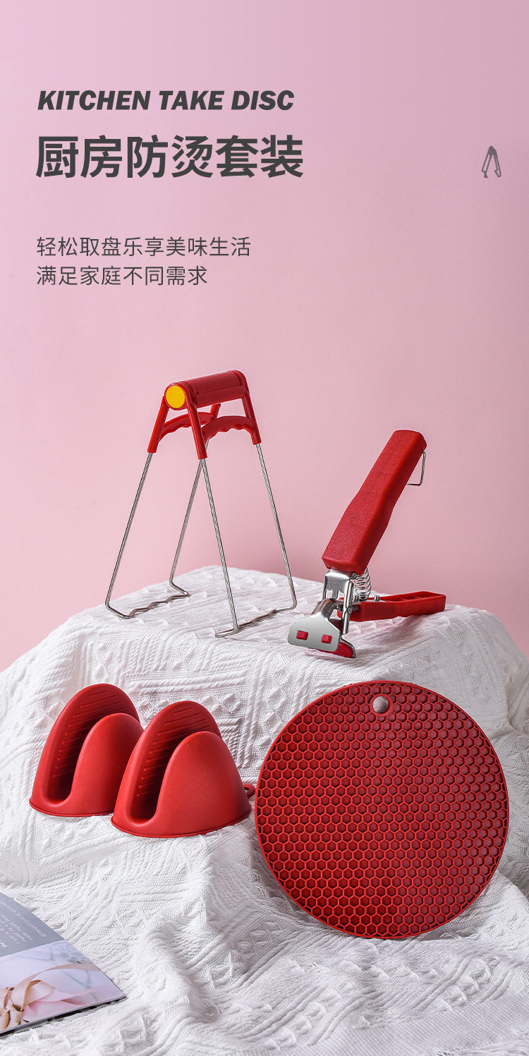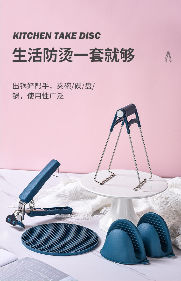 | Specifications | Clamp red (1 pack),Clamp Blue (1 pack),Thermal insulation gloves red (1 pair),Thermal insulation gloves blue (1 pair),Take the Bowl clip Red (1 pack),Take the Bowl clip Blue (1 pack),Pot holder Red (1 pack),Pot holder blue (1 pack),Three-piece set,Five-piece set |