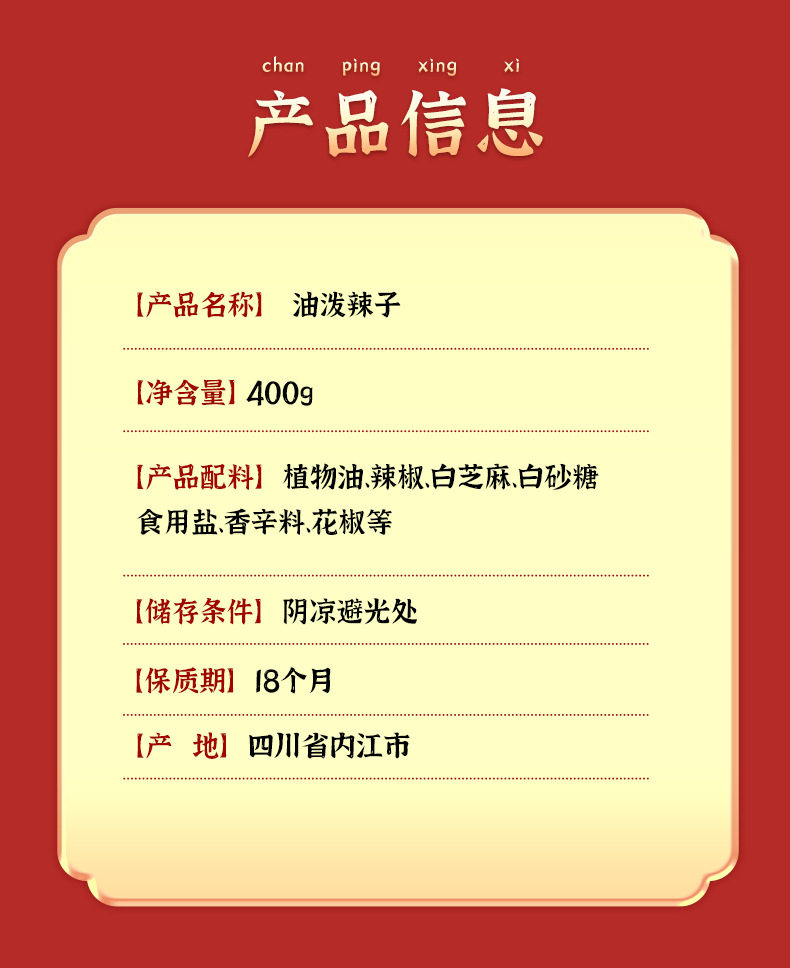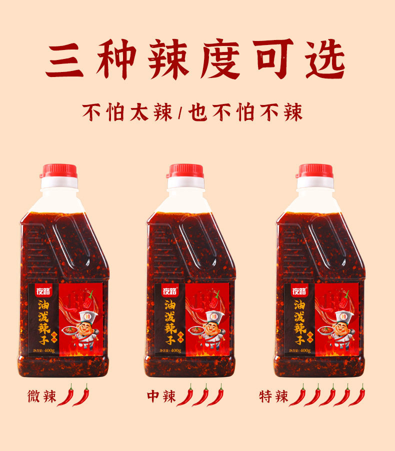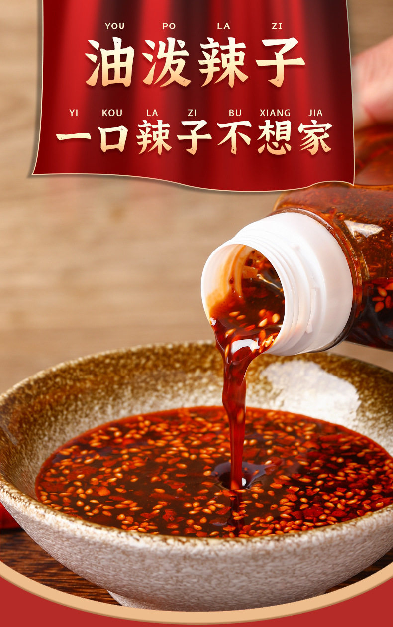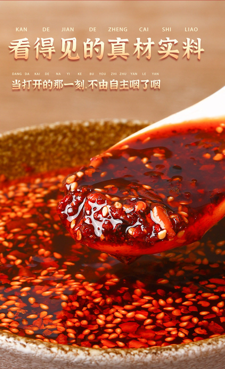 | Packing specification | A bottle of Sichuan-flavored oil and spicy pepper/extra spicy,2 bottles of Sichuan-flavored oil and spicy pepper/extra spicy,One bottle of Sichuan-flavored oil and spicy pepper/medium spicy,2 bottles of Sichuan-flavored oil and spicy pepper/medium spicy,A bottle of Sichuan-flavored oil and spicy pepper/slightly spicy,2 bottles of Sichuan-flavored oil and spicy pepper/slightly spicy |