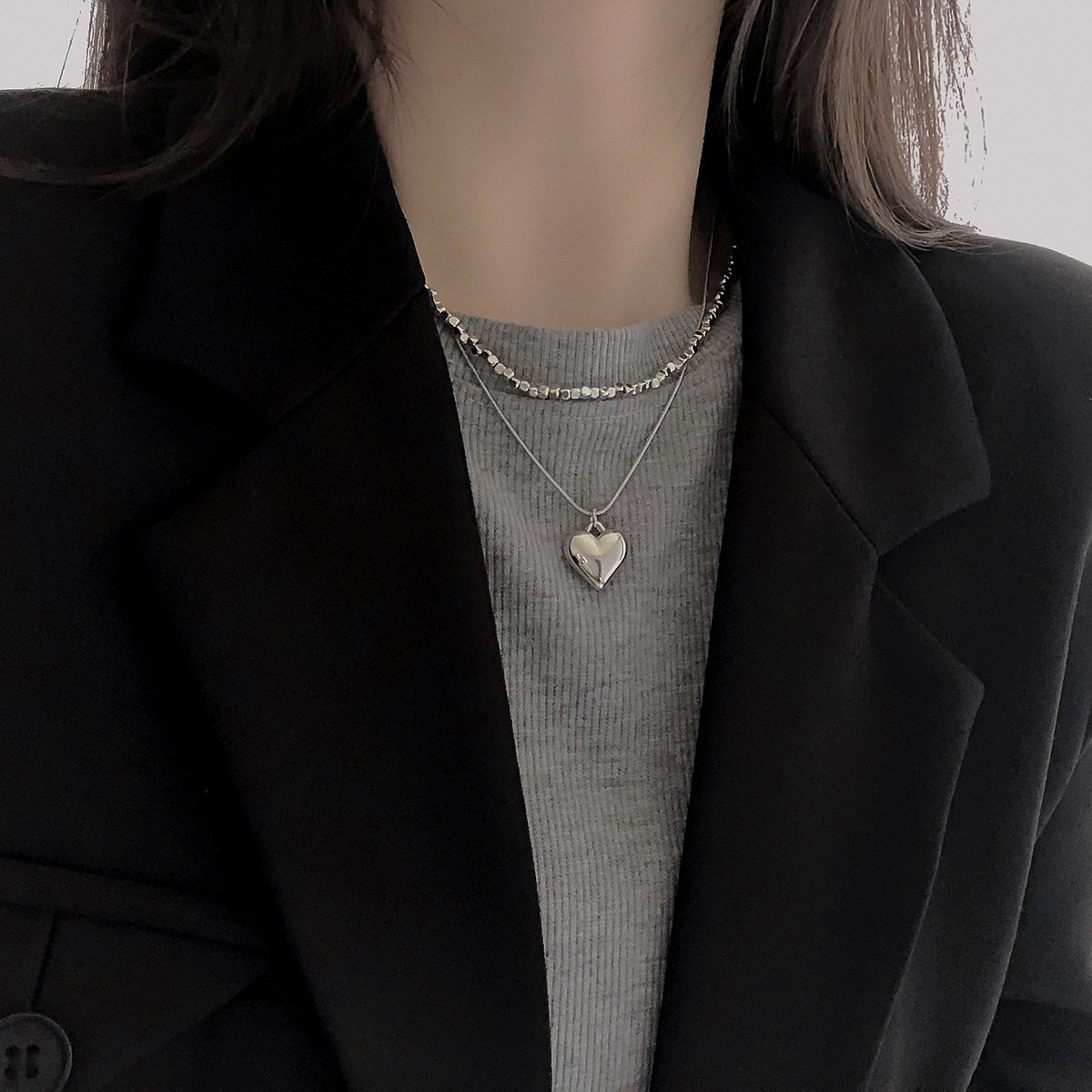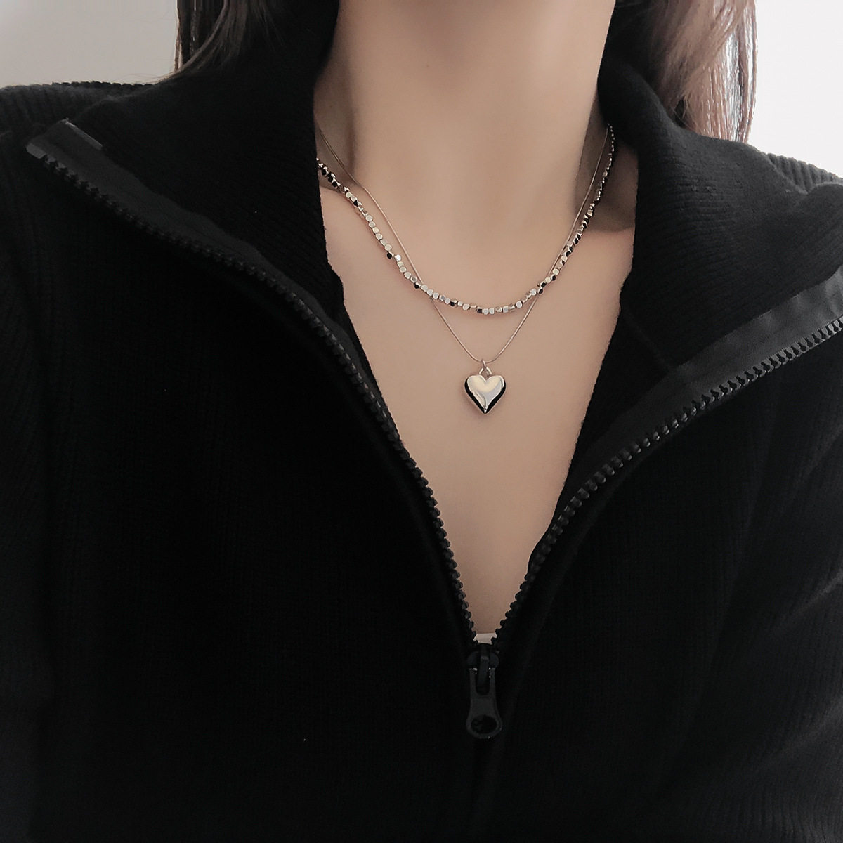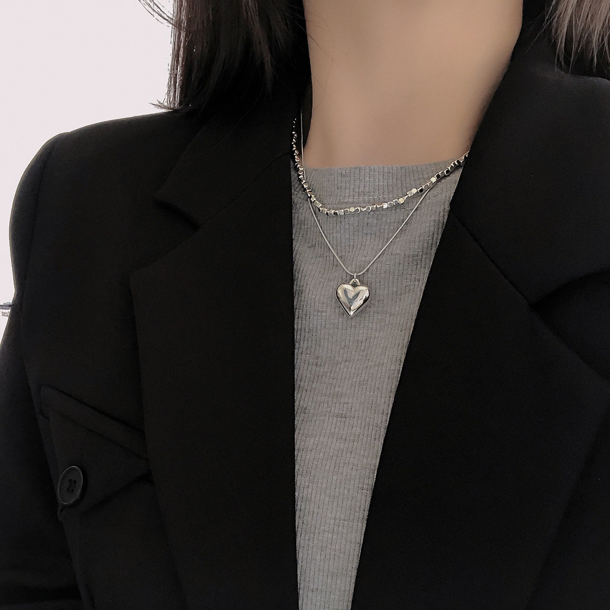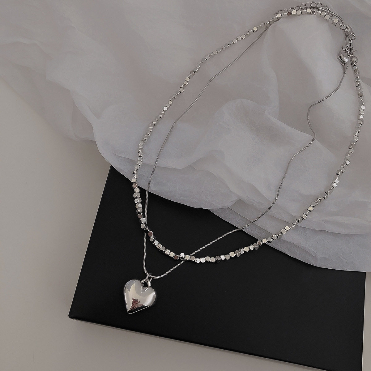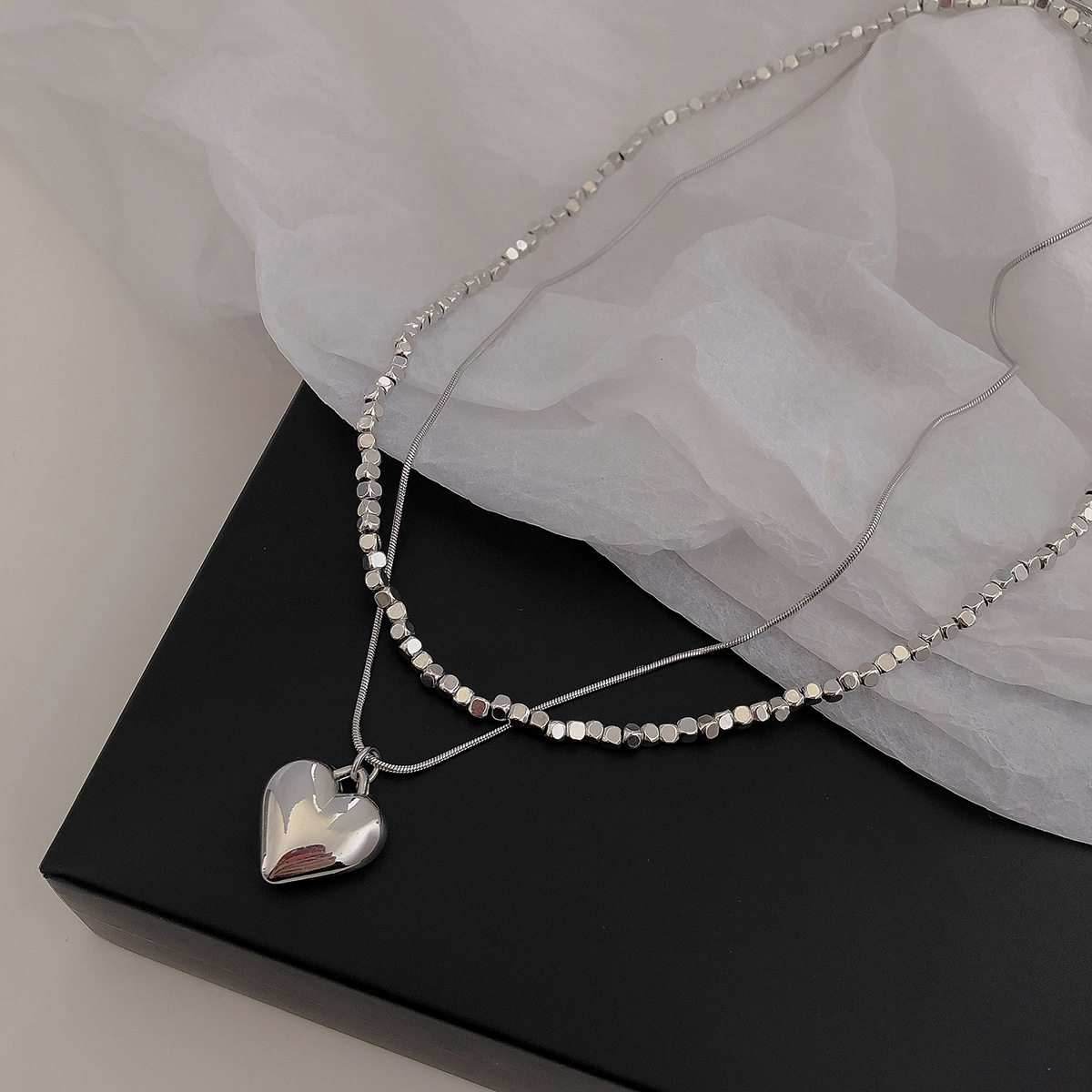 Simple Silver Small Square Double-Layer Love Necklace Women's ins Short Heart-Shaped Pendant Niche Design Clavicle Chain