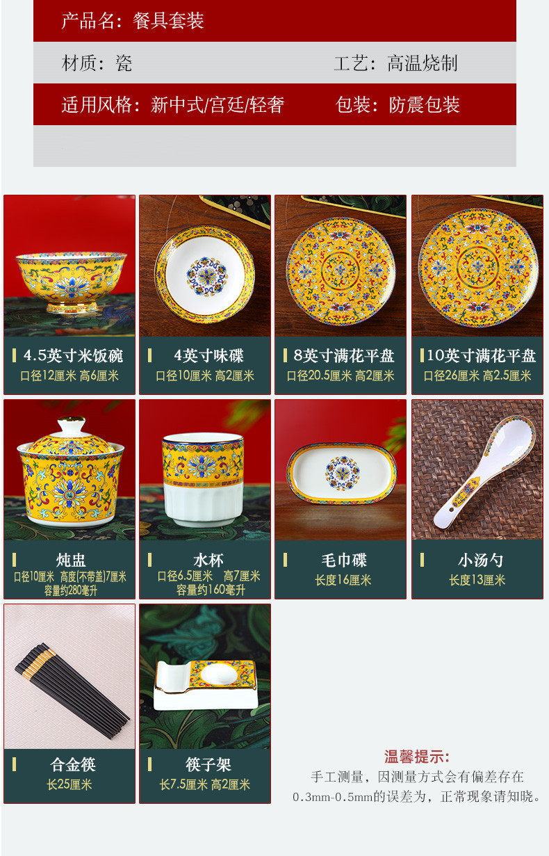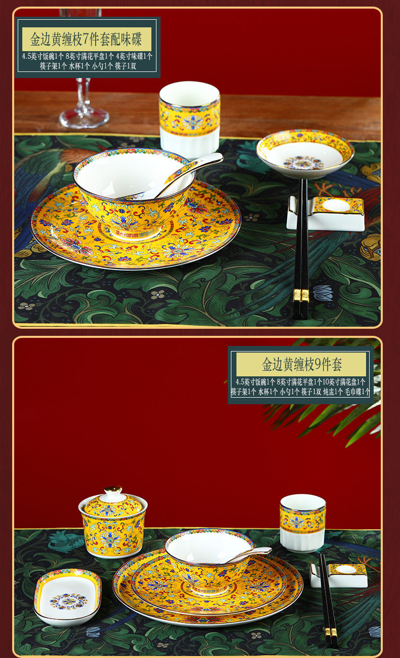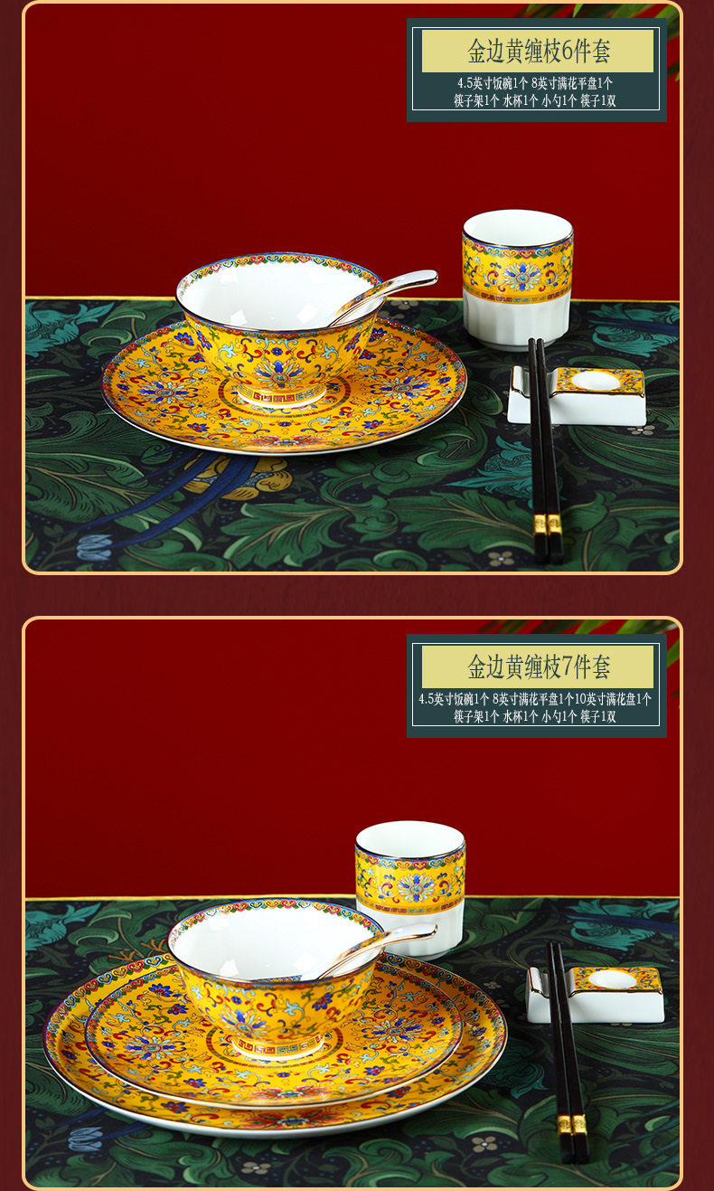 Specifications 4-piece set of table decoration [golden edge yellow twig]],6-piece set of table decoration [golden edge yellow winding branches]],Table decoration 7-piece set with large flat plate [golden edge yellow winding branches]],Table decoration 7-piece set with flavor dish [golden edge yellow winding branches]],9-piece set of table decoration with large flat plate [golden edge yellow winding branches]],9-piece set of table decoration with flavor dish [golden edge yellow winding branches]],10-piece set of table decoration [golden edge yellow winding branches]]