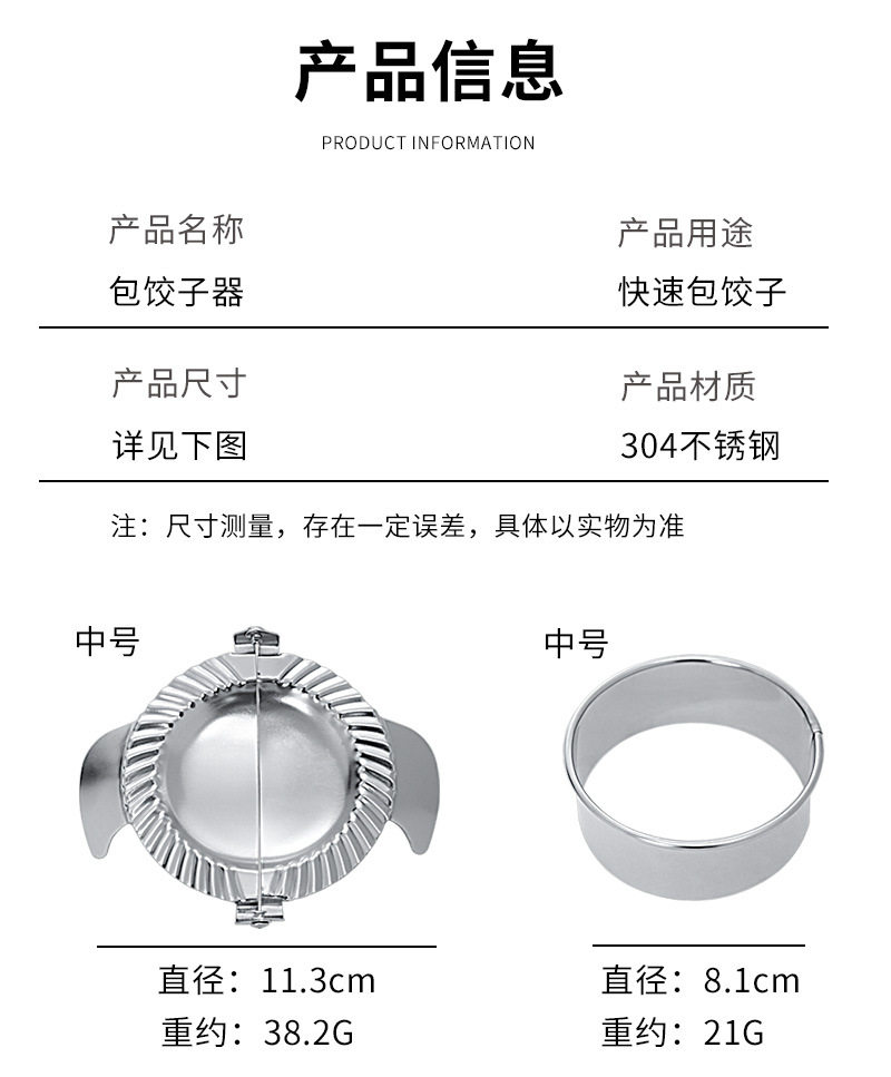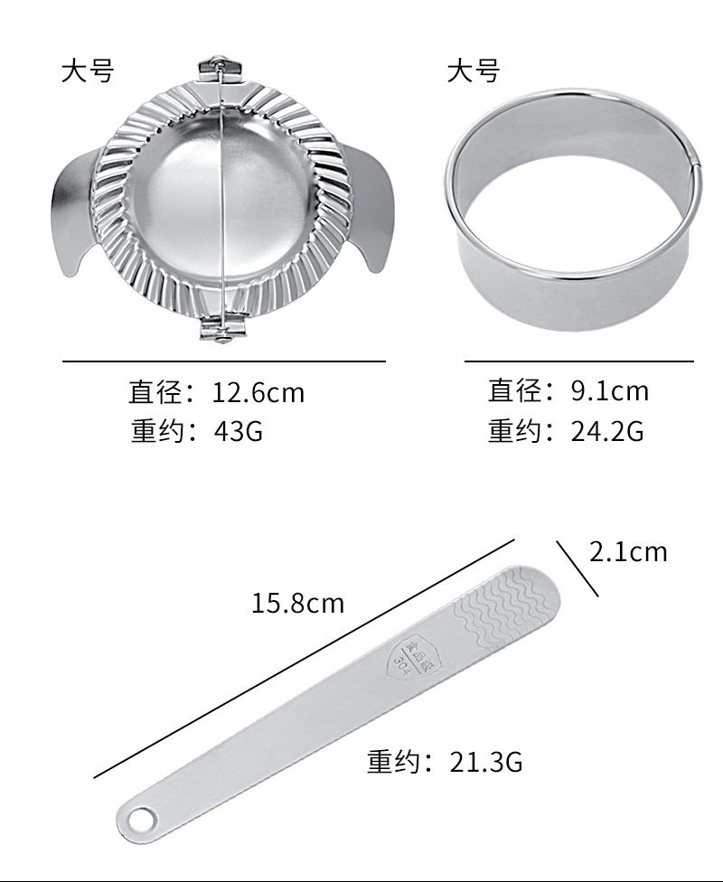| Specifications | 304 dumpling maker medium size,304 dumpling maker large size,304 dumpling stuffing spoon |