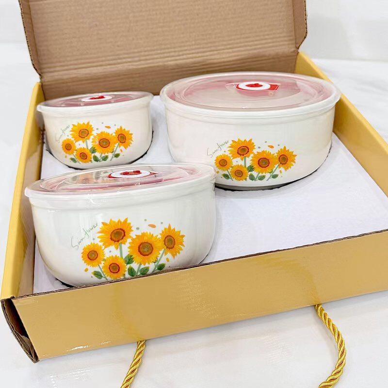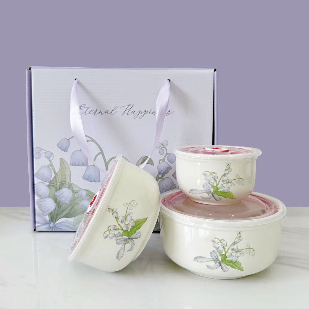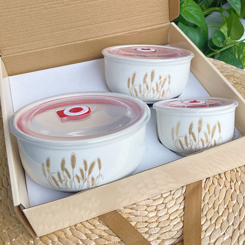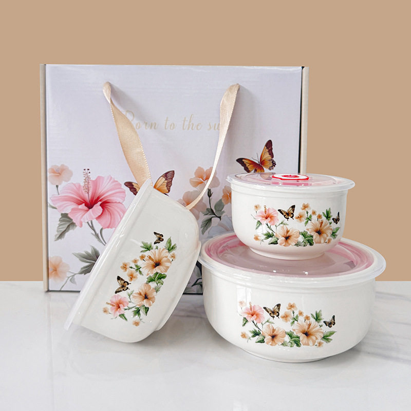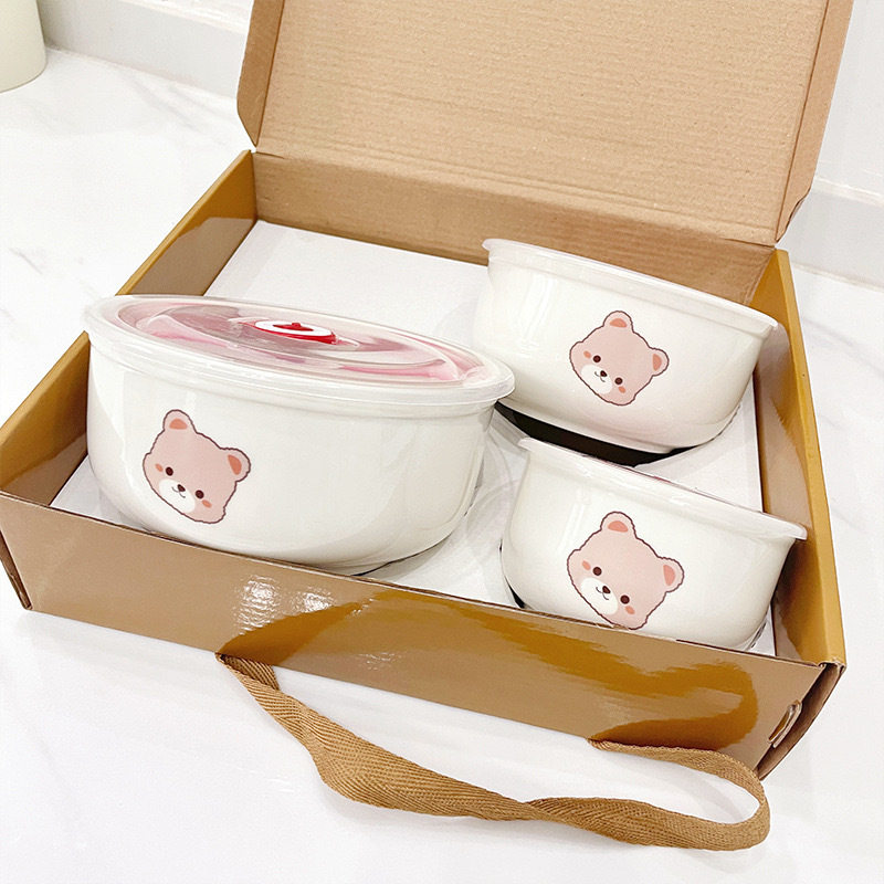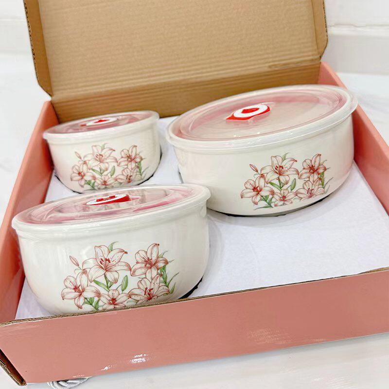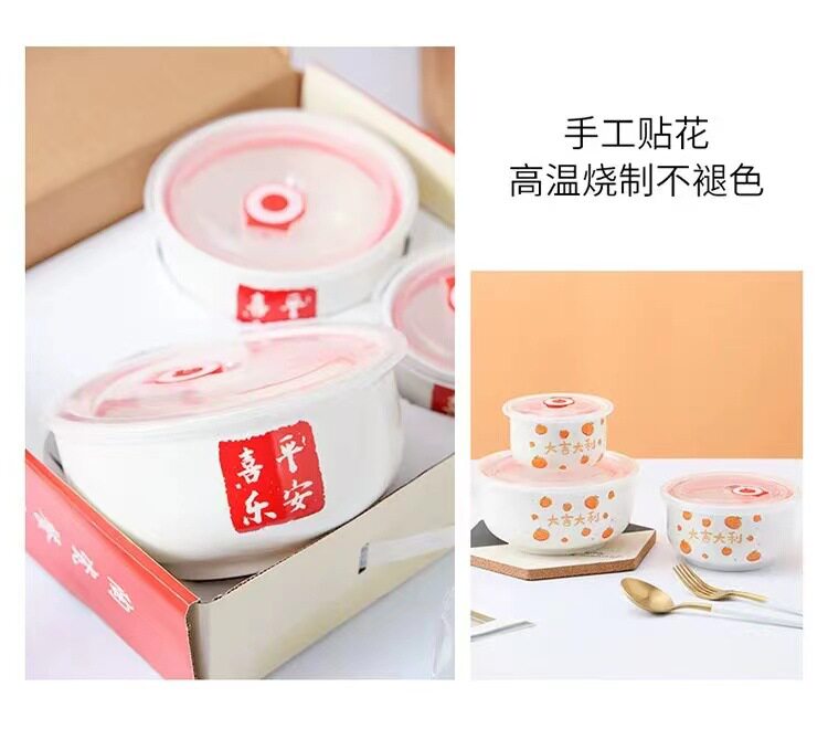 Ceramic Fresh-keeping Bowl Three-piece Set Sealed Lunch Box Creative Gift Set Bowl Opening Activities Promotional Return with Printed LOGO