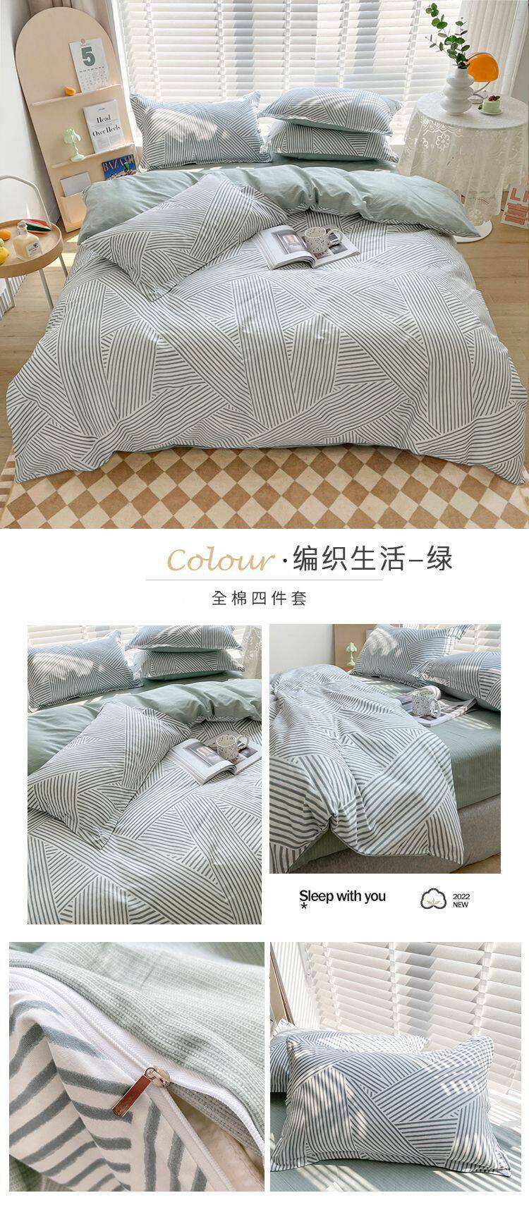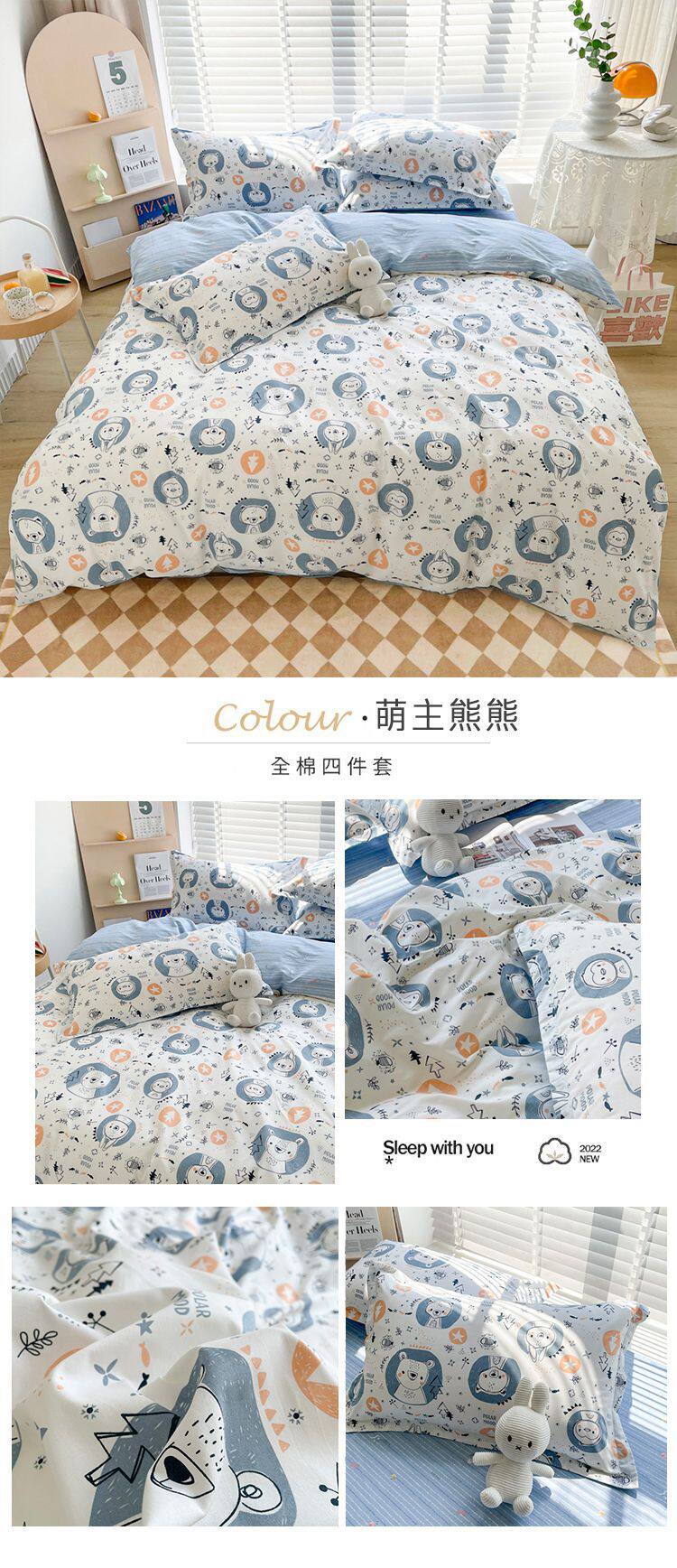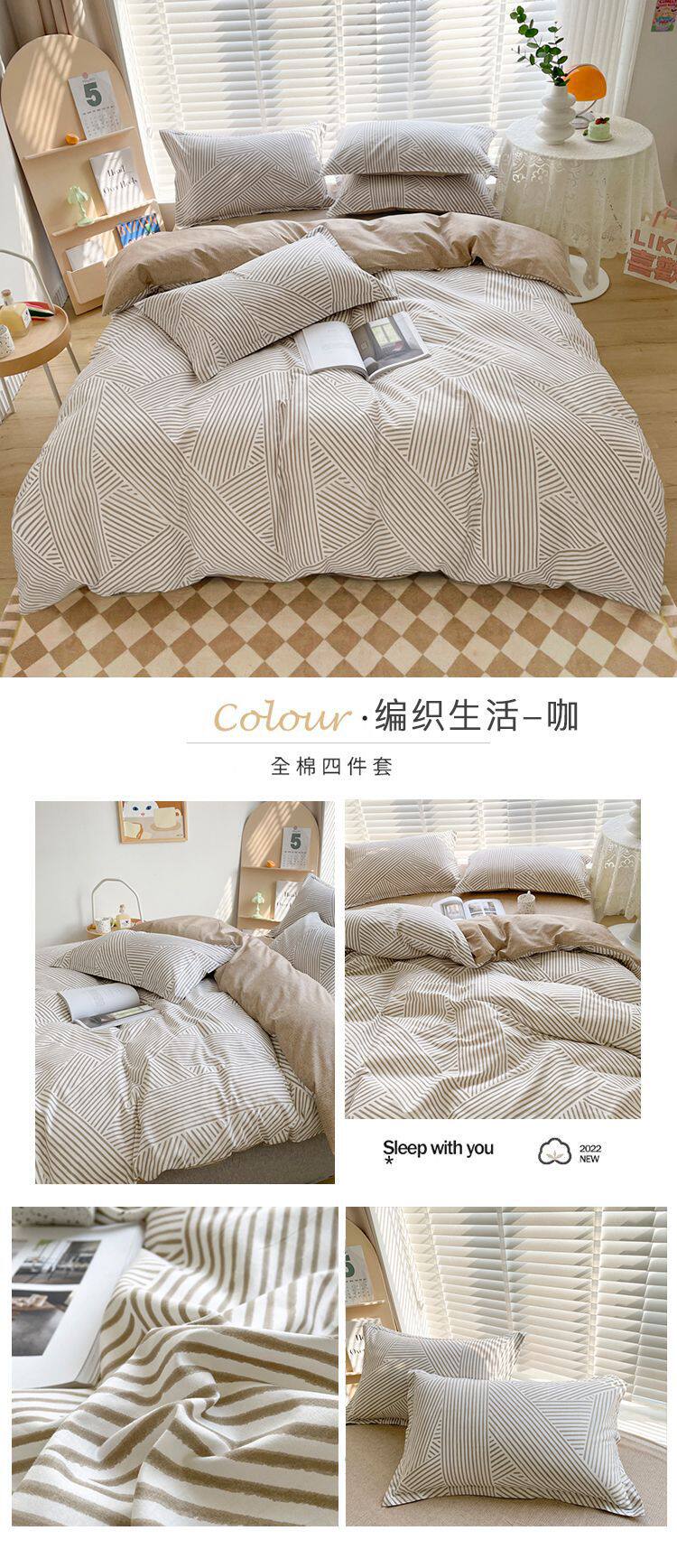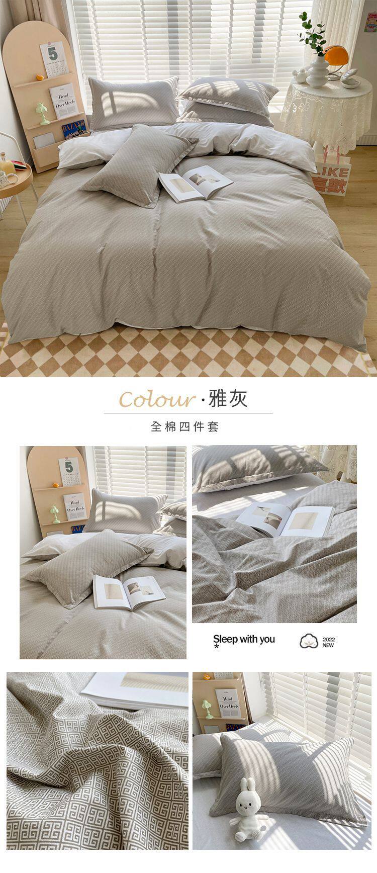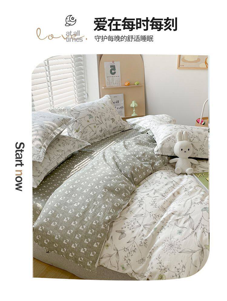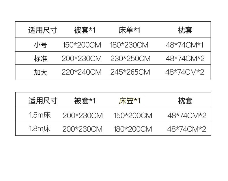 | Dimensions | 1.2m bed sheet three-piece set (quilt cover 150x200cm),1.5m bed sheet four-piece set (quilt cover 200x230cm),1.8m bed sheet four-piece set (quilt cover 200x230cm,2.0m bed sheet four-piece set (quilt cover 220x240cm),1.5m fitted sheet set of four (fitted sheet 150x200cm, quilt cover 200x230cm),1.8m fitted sheet set of four (fitted sheet 180x200cm, quilt cover 200x230cm) |