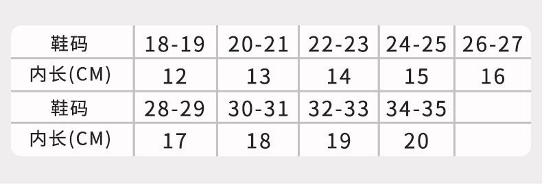 | Size | 18-19 yards, 12cm long, about 0-1 years old,20-21 yards, 13cm long, about 1-1.5 years old,22-23 yards, 14cm long, about 1.5-2 years old,Within 24-25 yards, 15cm long, about 2-3 years old,26-27 yards, 16cm long, about 3-4 years old,28-29 yards long 17cm about 4-5 years old,30-31 yards within the length of 18cm about 5-6 years old,32-33 yards, 19cm long, about 6-7 years old,Size 34-35 inner length 20cm, about 7-8 years old |