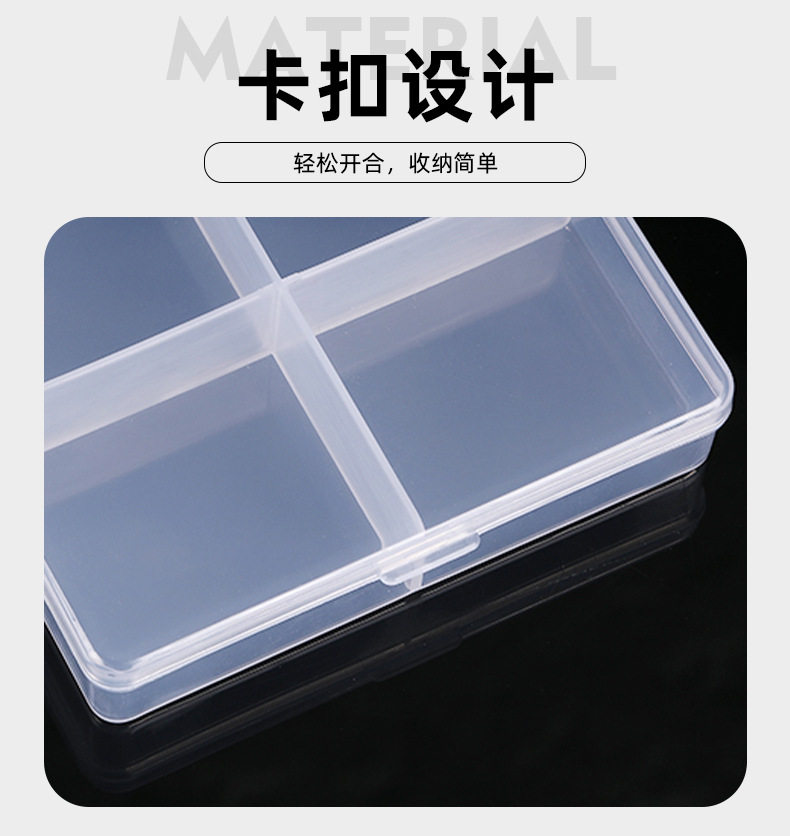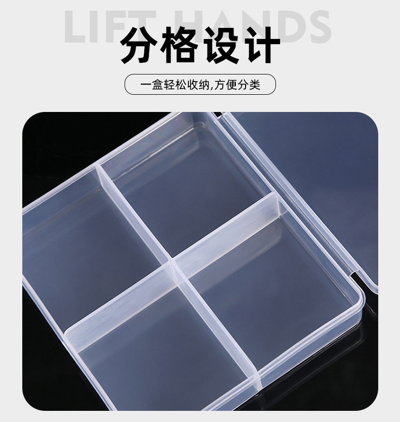 | Size | Small four grid 7.3*6.4*1.7cm,Large four grid 9.4*8.5*2cm,H-fishing gear 4 grids 10.3*7.3*3.1cm,Four-compartment storage box 12.6*14*7.5cm,Double-open, four-compartment box, measuring 10.4 x 6.7 x 2.7 cm |