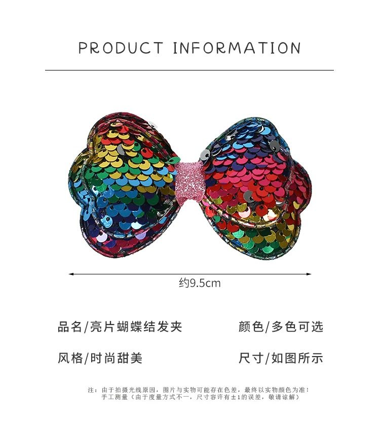 | Color | 1# double sequins bow tie hairpin-rainbow color,2# double sequins bow tie hairpin-dark color,3# double sequins bow tie hairpin-pink,4# double sequins bow tie hairpin-colorful white,5# double sequins bow tie hairpin-bean paste color,6# double sequins bow tie hairpin-champagne,7# double sequins bow tie hairpin-rose pink |