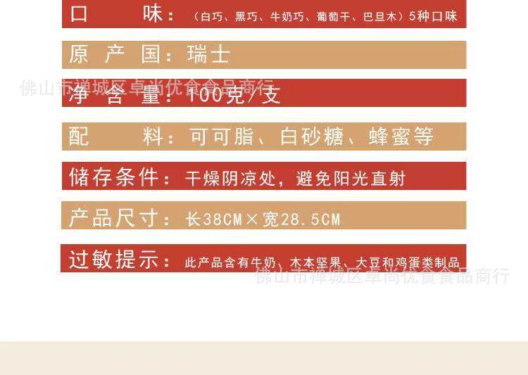 | Packing specification | Milk chocolate 100g*20 pieces/set,Raisin nut chocolate 100g*20 pieces/set,White chocolate 100g*20 pieces/set,Dark chocolate 100g*20 pieces/set,Salt-baked almond chocolate 100g*20 pieces/set |
