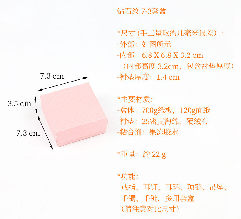| Color | 7-3 box set, diamond pattern black 7.3x7.3x3.5cm,7-3 box set diamond pattern red 7.3x7.3x3.5cm,7-3 box set diamond pattern powder 7.3x7.3x3.5cm |